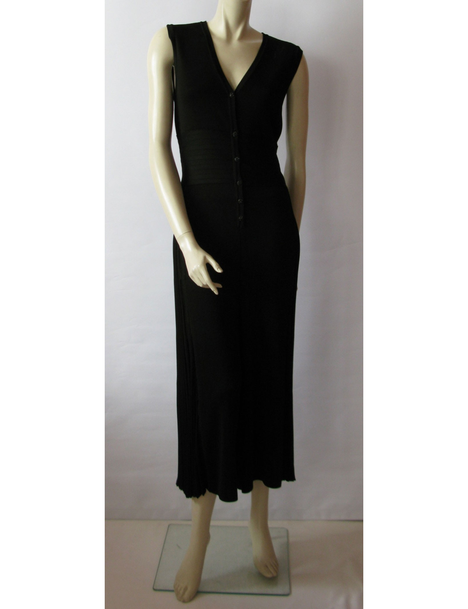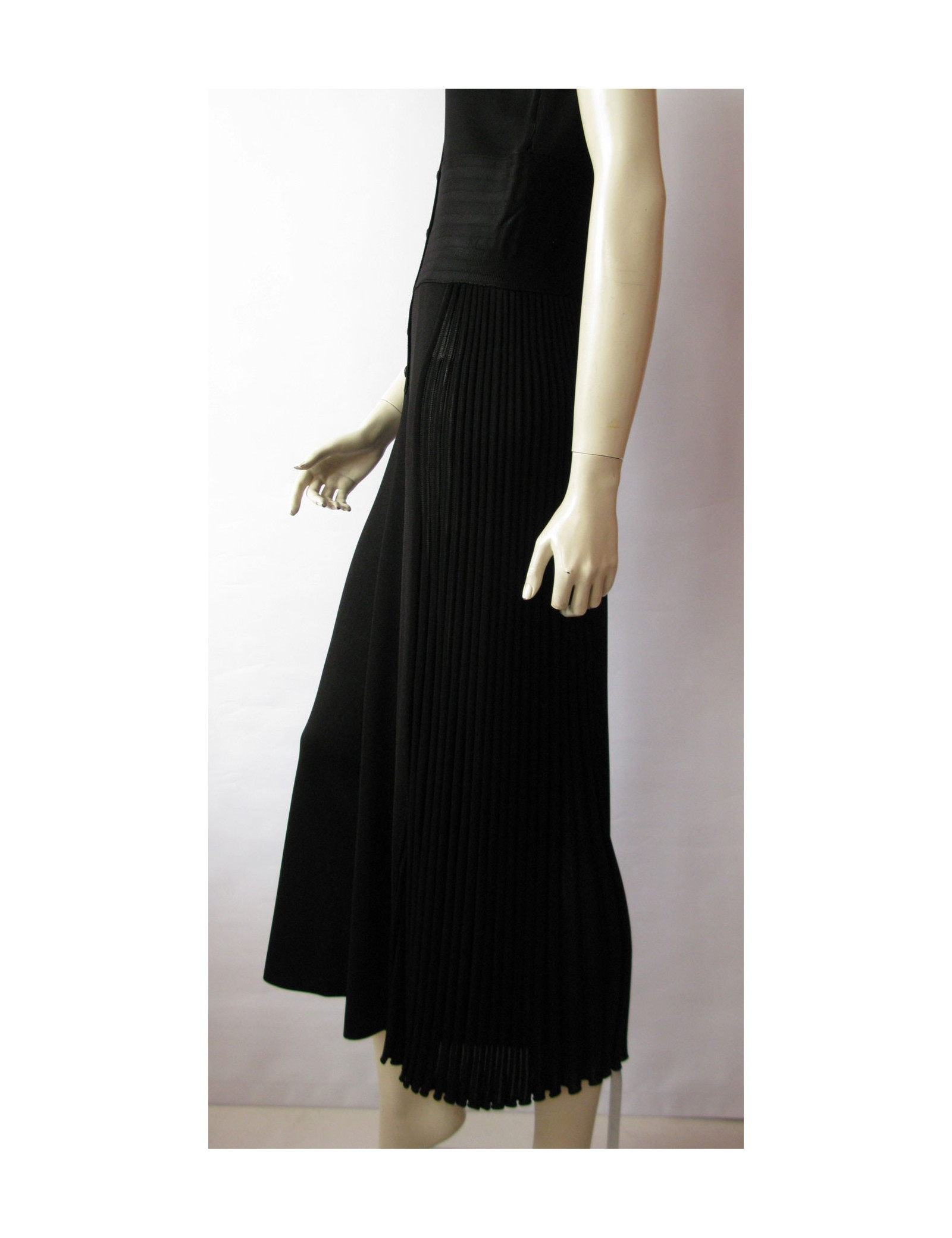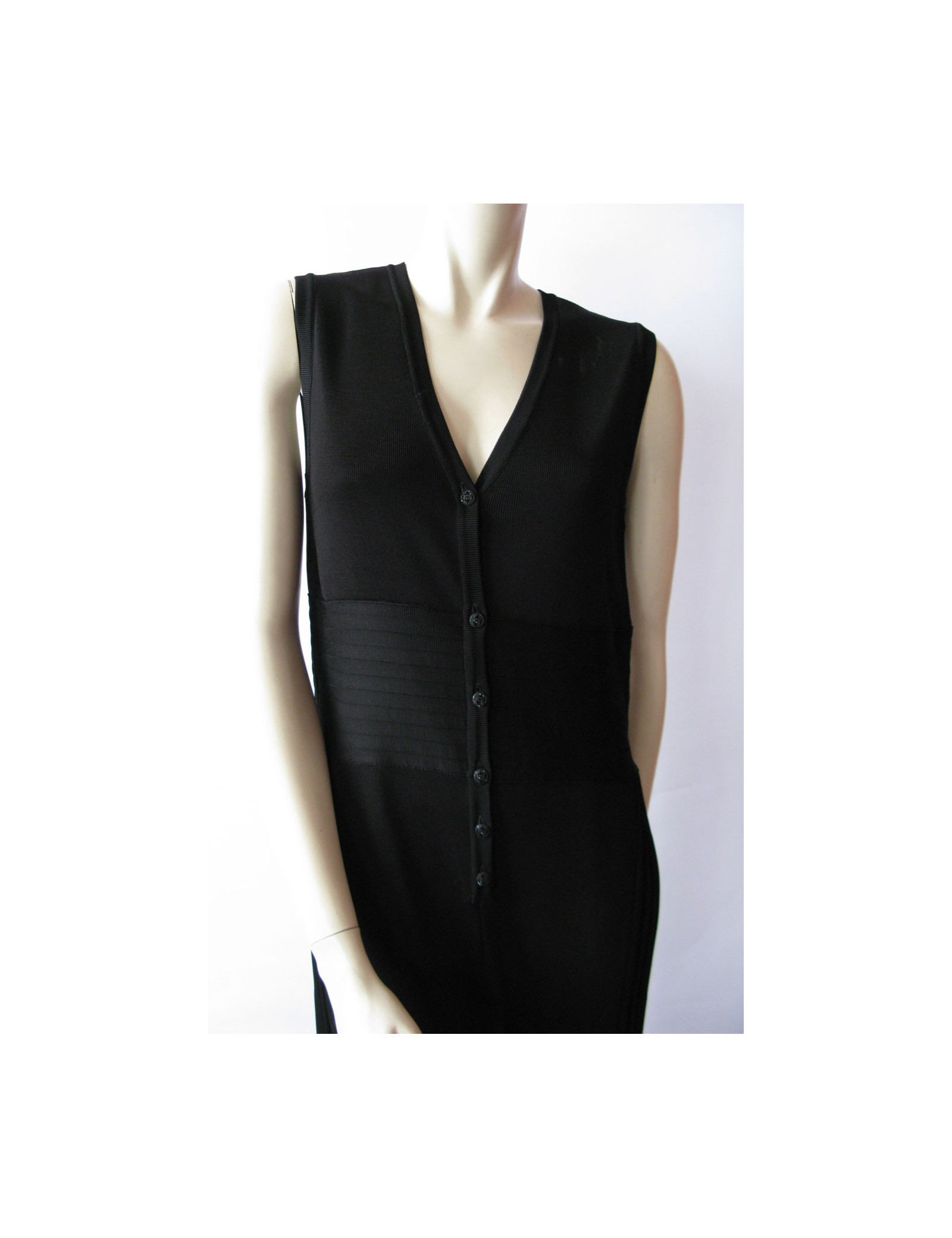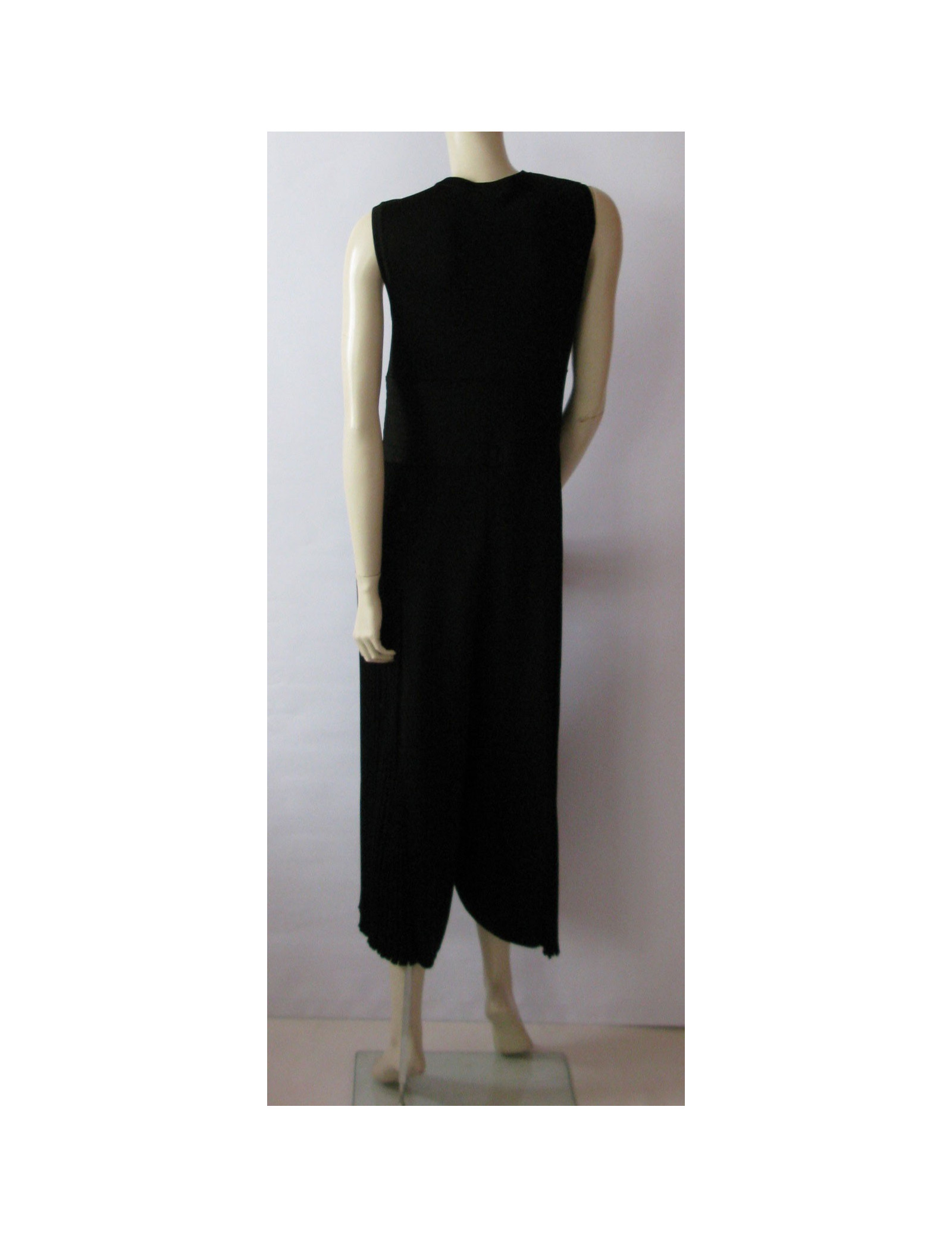 Combinaison pantalon Chanel noire aux jambes évasées. Col V, sans manche, pantalon à plis cassants sur les côtés, le plissage commence des hanches jusqu'en bas. Large bande "effet ceinture" incrustée dans le tissu contourne la taille. Fermeture 6 boutons siglés CC ornés de jolies pierres noires. Taille 44FR, 99% viscose et elasthane.