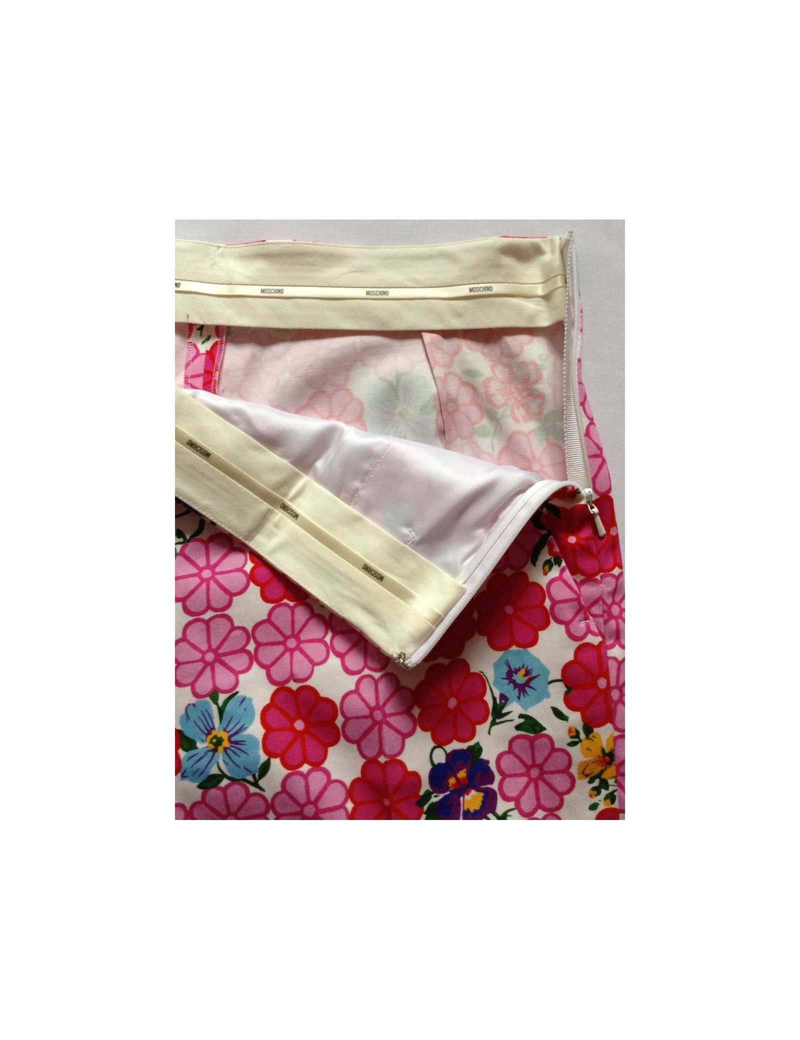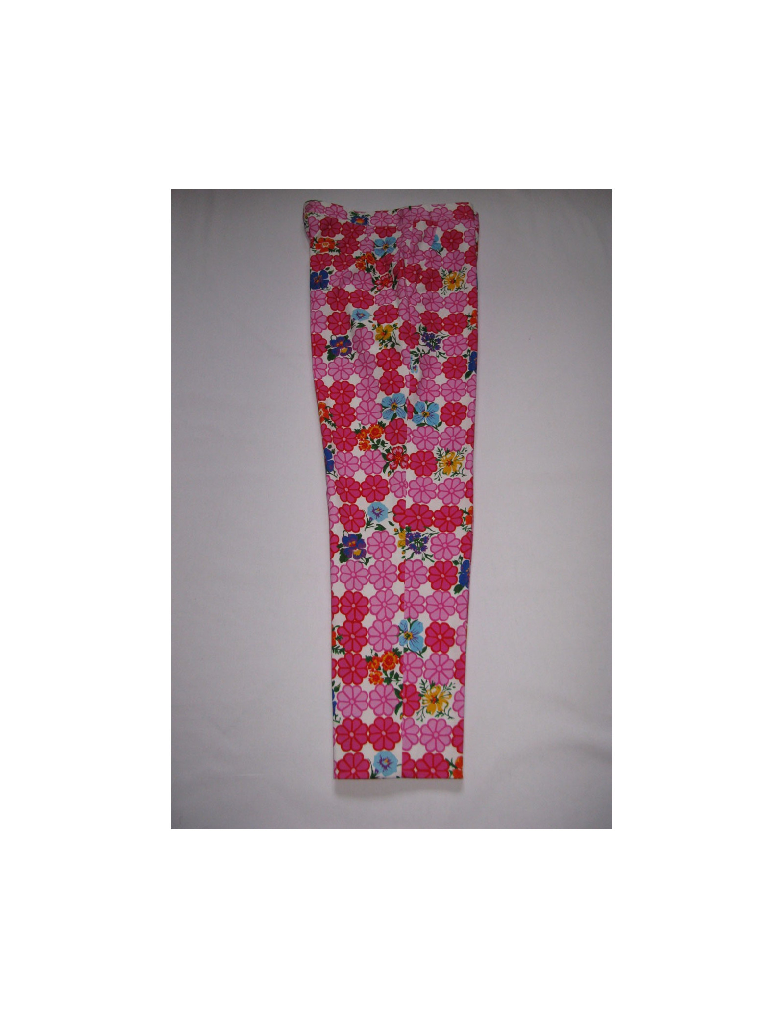 Aussi frais qu'élégant! Pantalon MOSCHINO coupe cigarette, imprimé fleuri multicolore. Poches fendues latérales. Fermeture sur le coté gauche par un long zip discret ajouté d'1 petite agrafe. Taille 42it soit 38fr. 97% coton. Collection: Printemps/été Couleur: imprimé fleuri