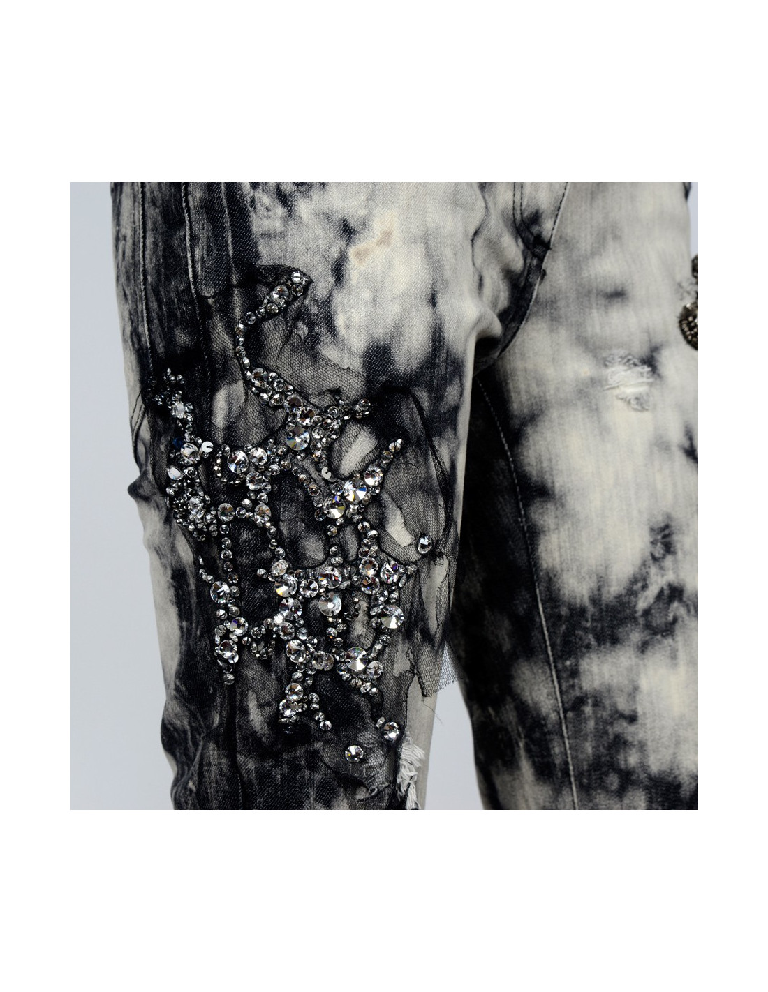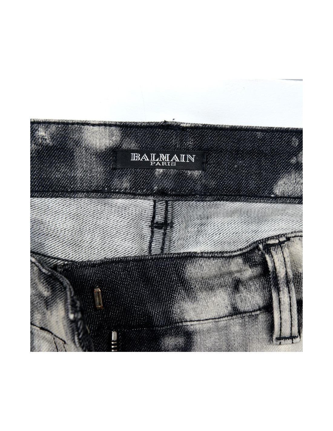 Jean's Balmain tye and dye bleuté. Pantalon délavé avec broderies sur les côtés strassés. Fermeture en zip sur la cheville.