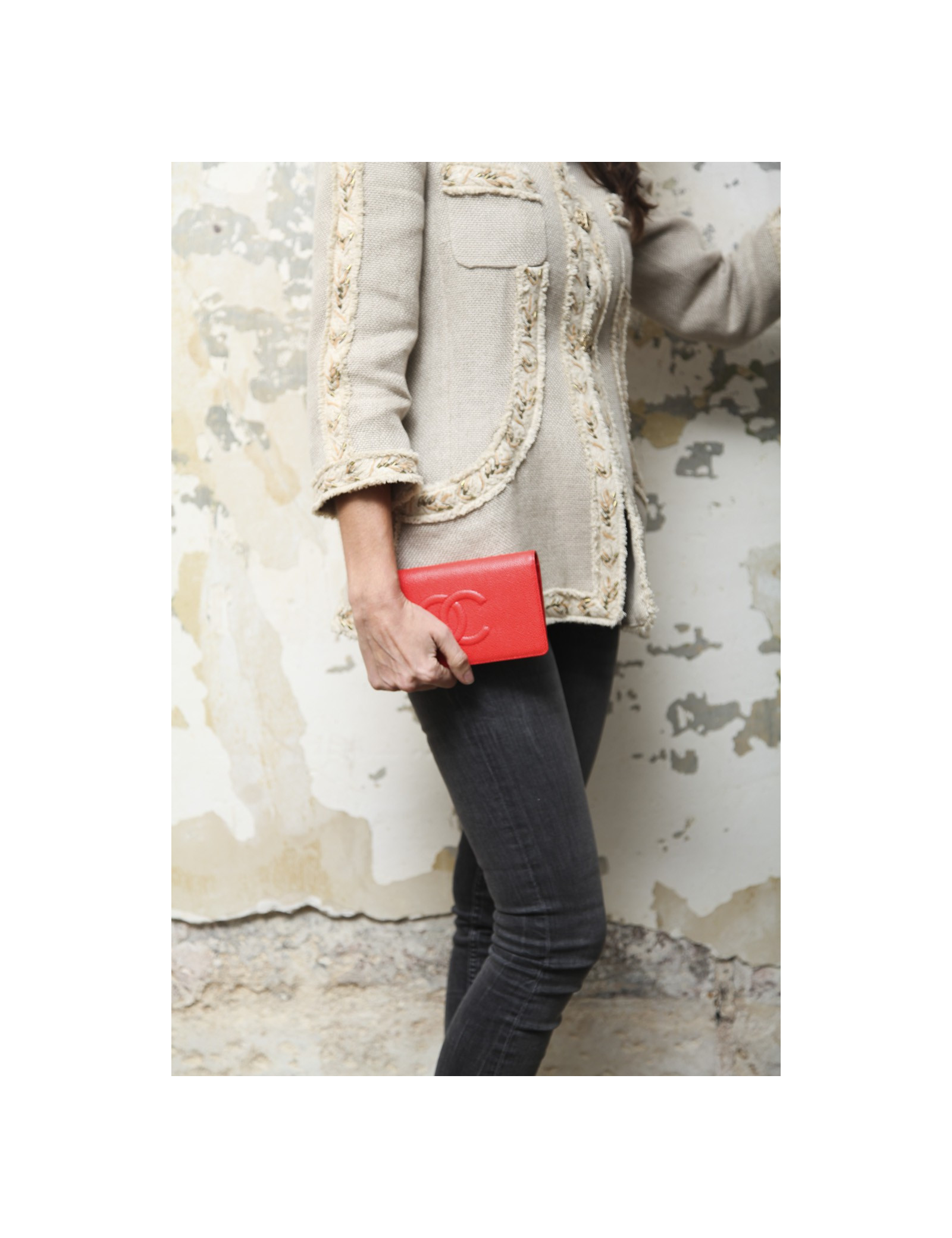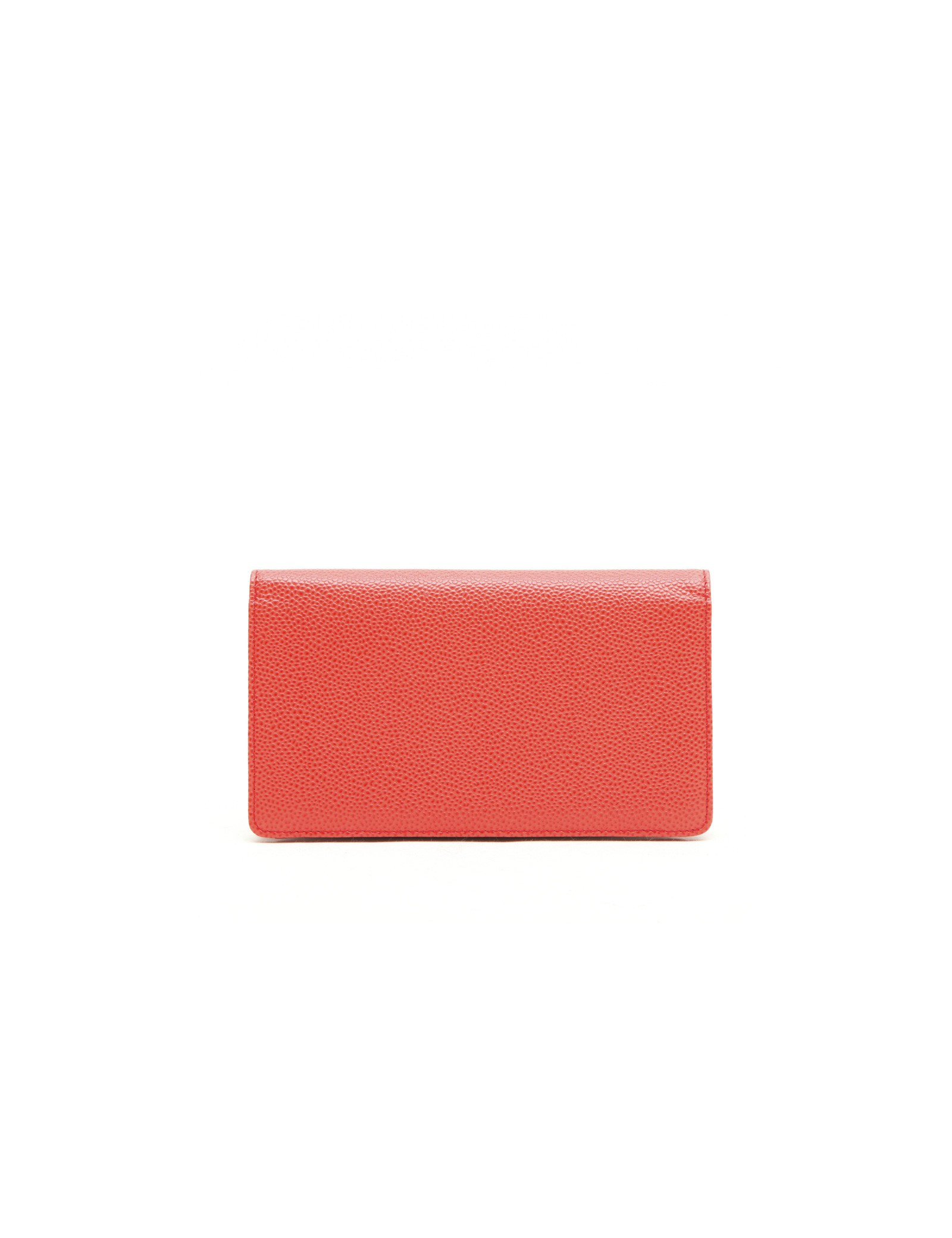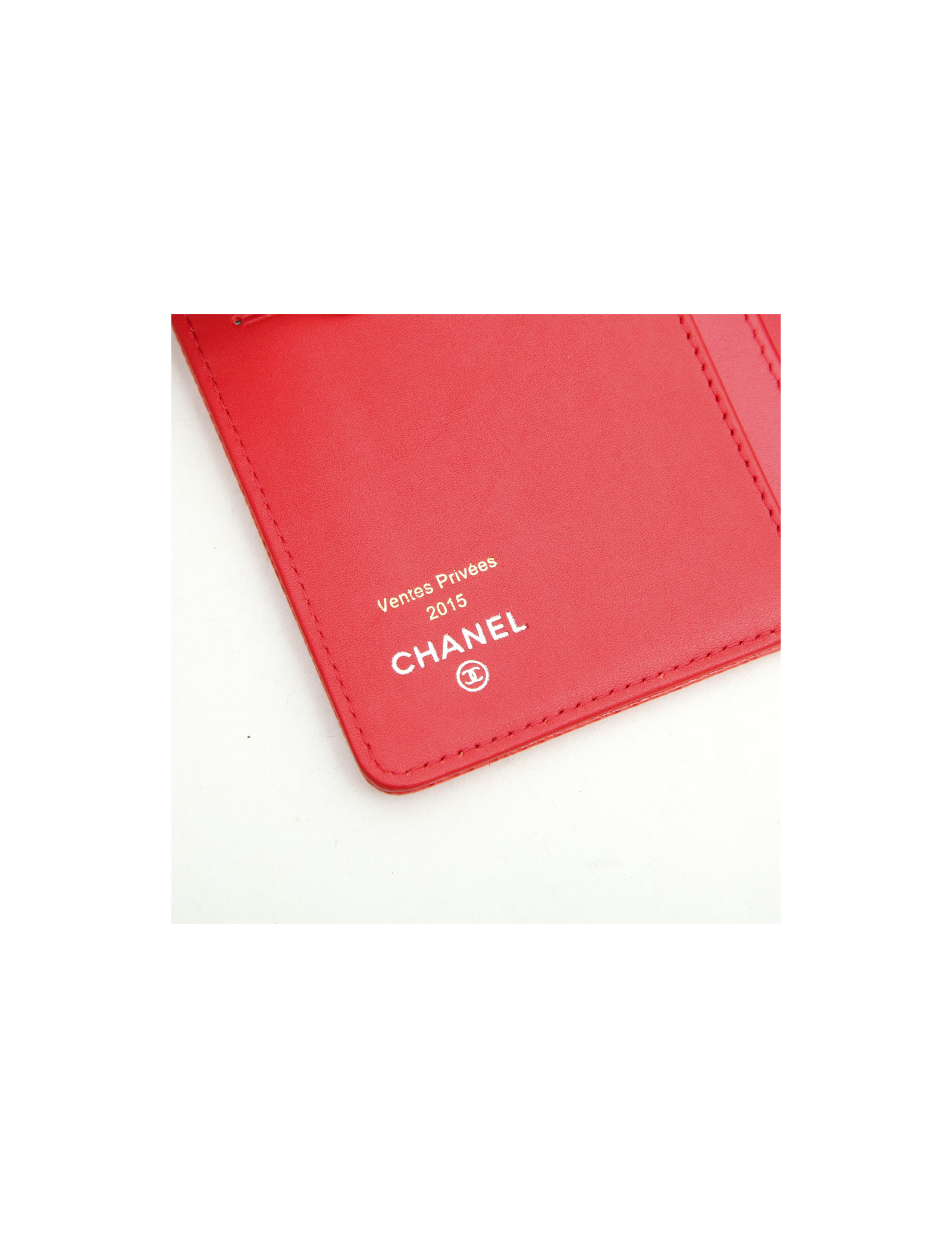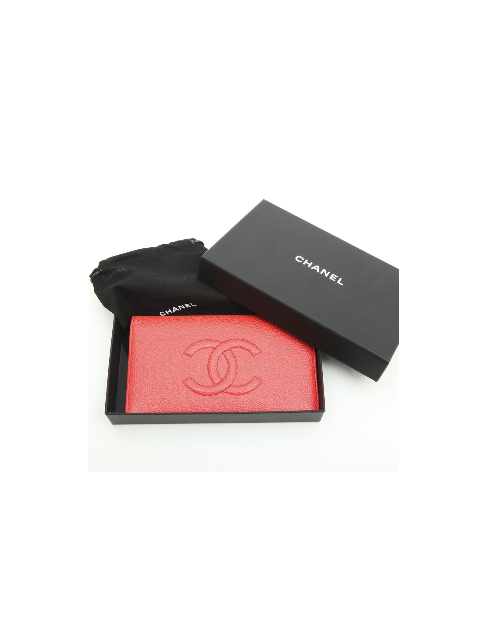 Portefeuille Chanel en cuir grainé de couleur corail. Ventes privées 2015. A l'intérieur, 8 fentes à cartes, une poche zippée, 4 soufflets à billet ou autres documents. Hologramme : 1874... pas de carte d'authenticité. Made in Spain.