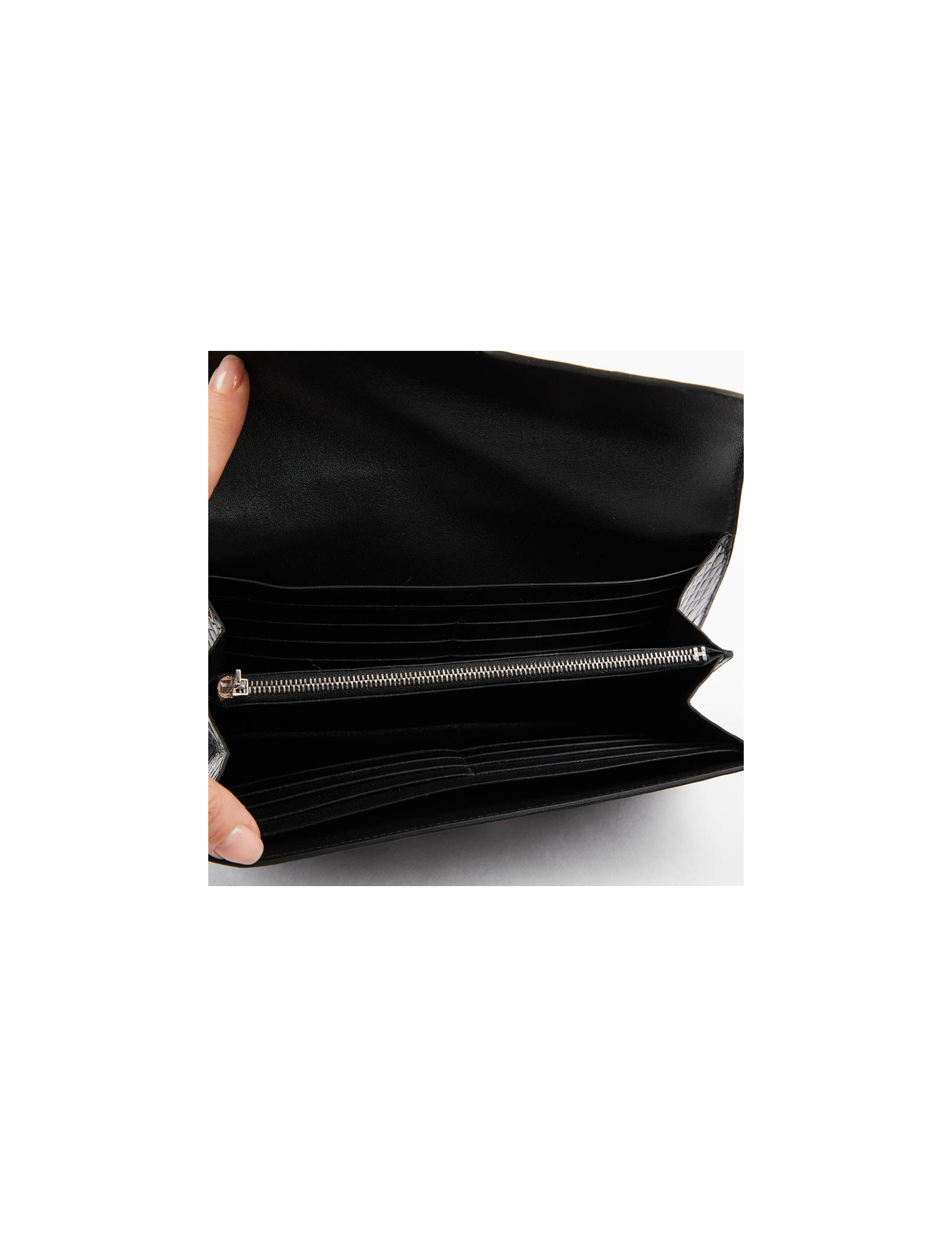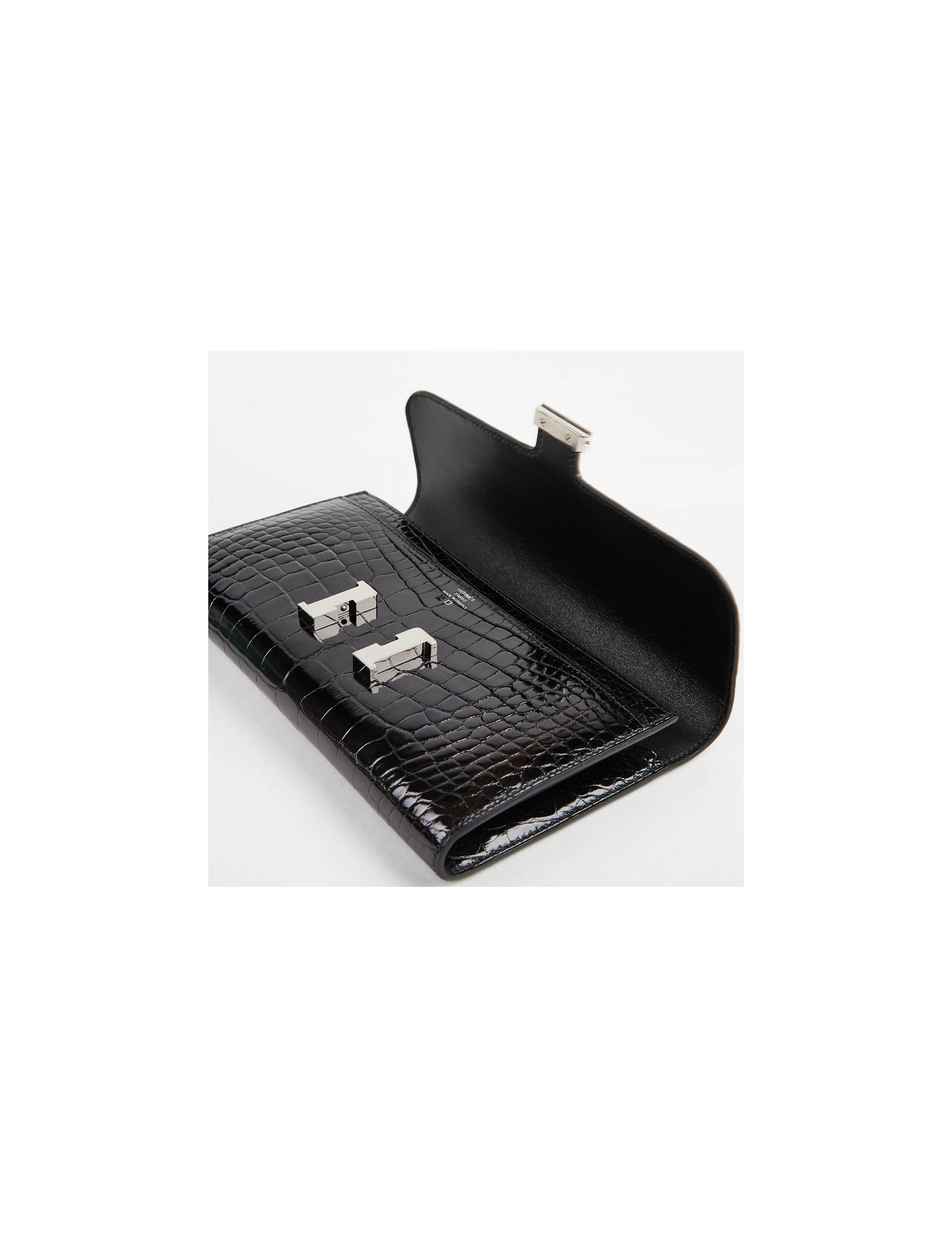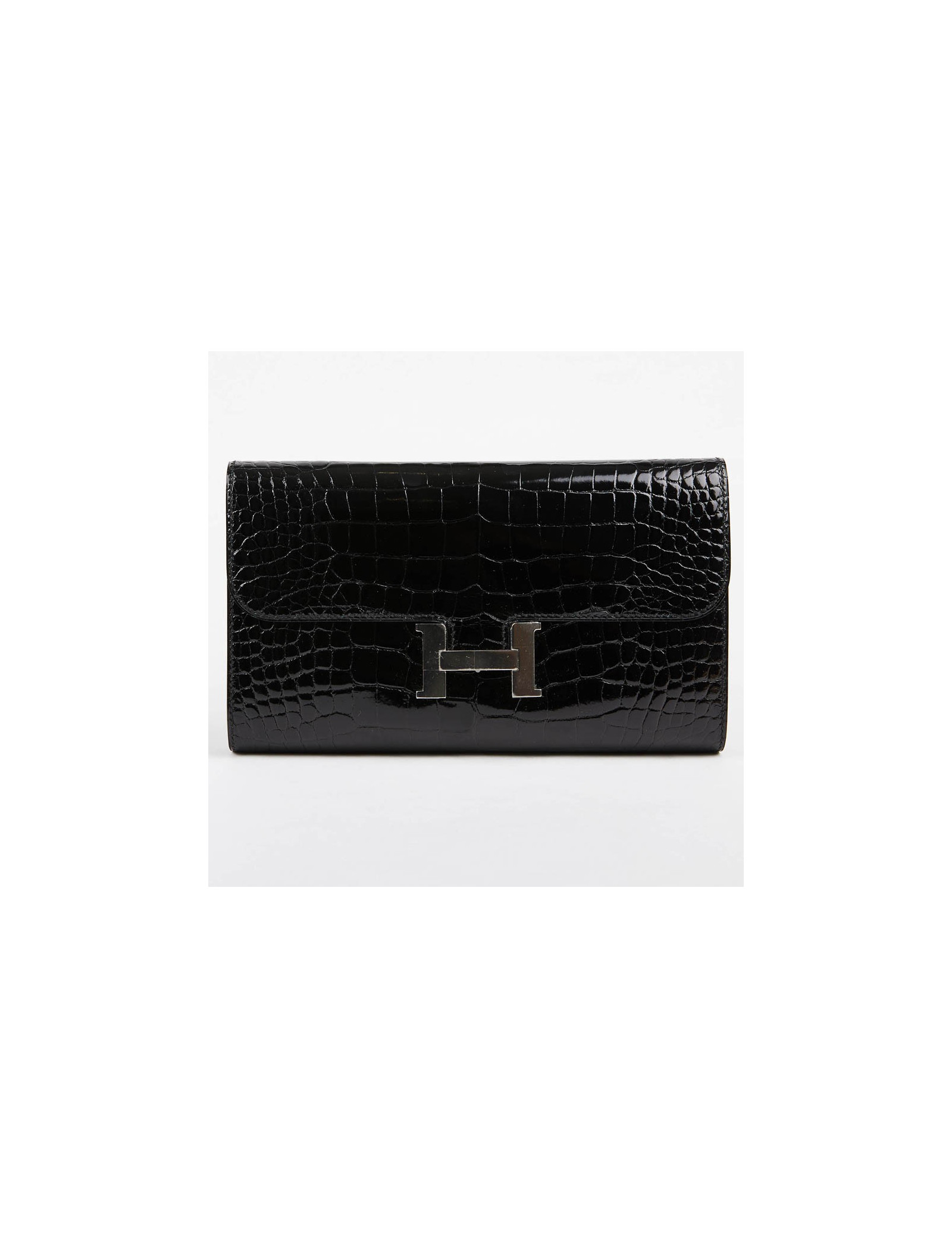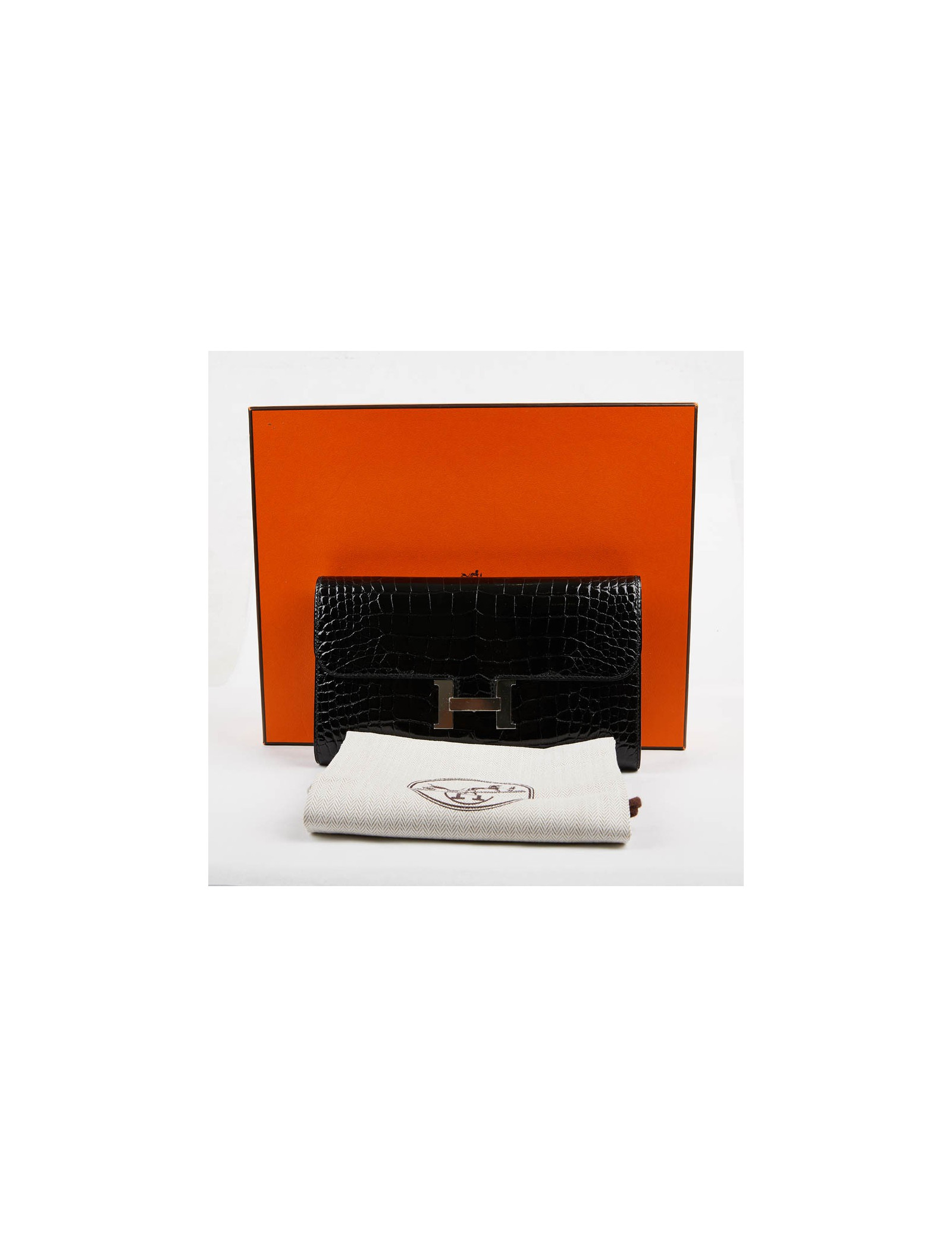 Très beau portefeuille Constance en Alligator du Mississippi noir de la Maison HERMES. Il est doublé en cuir lisse noir. La poche pour pièces qui sépare les deux soufflets de rangement se ferme par une fermeture à glissière. Quatorze poches cartes de crédit et trois poches plates. A l'arrière une poche plaquée. La bijouterie est en argent palladié. Les plastiques sont toujours présents sur le H. Il n'a jamais été porté.