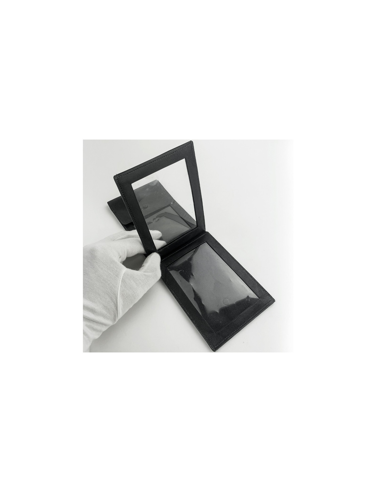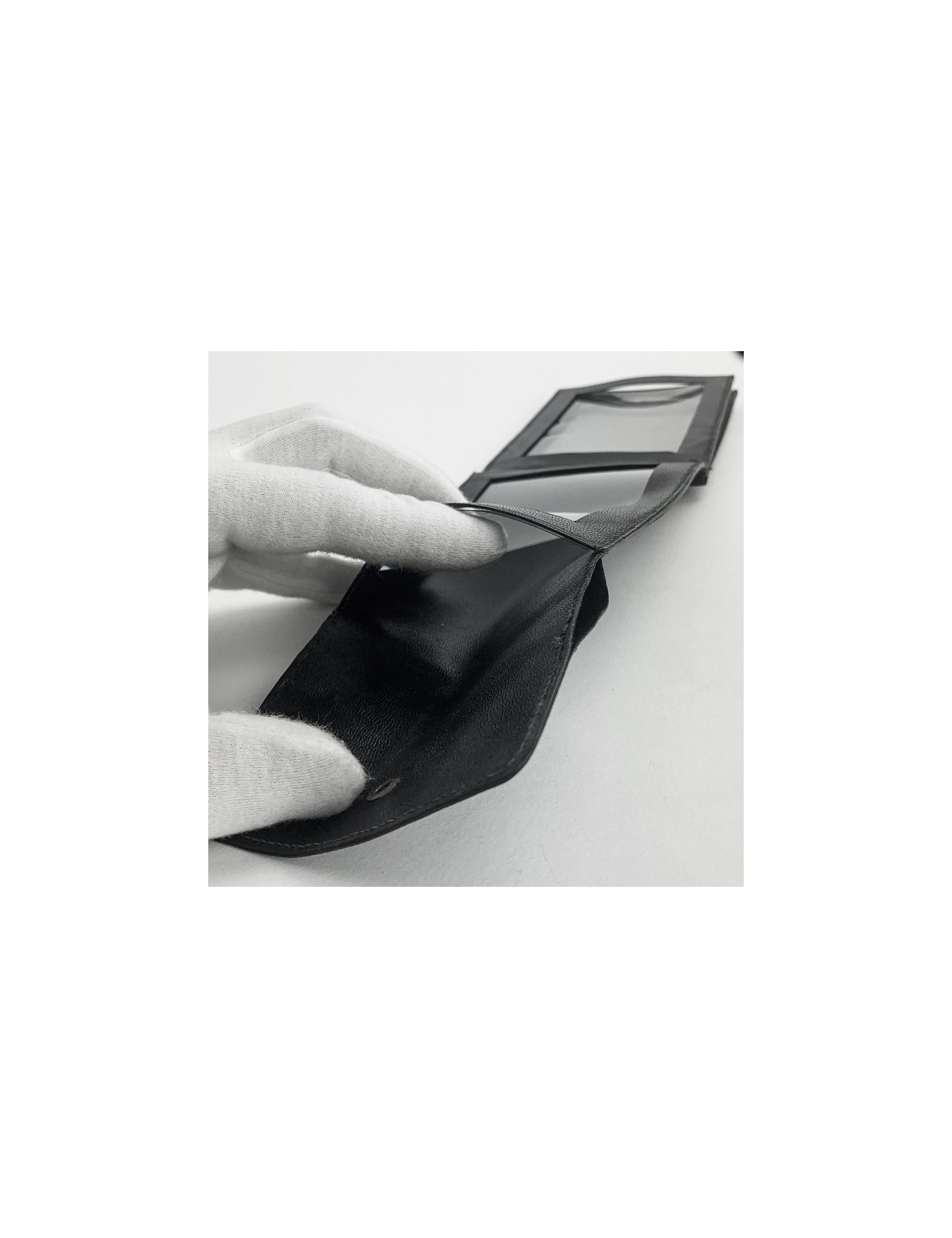 Le porte-photos est une pièce vintage de la Maison HERMES. Il est de forme rectangulaire en cuir box noir et se ferme par un bouton pression. Il dispose de trois compartiments photo double face.