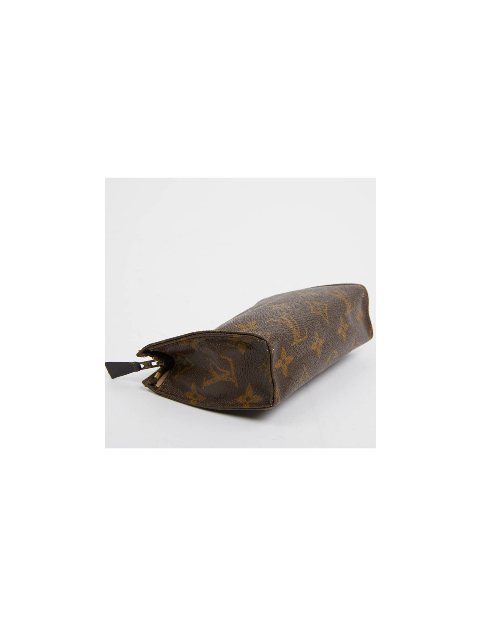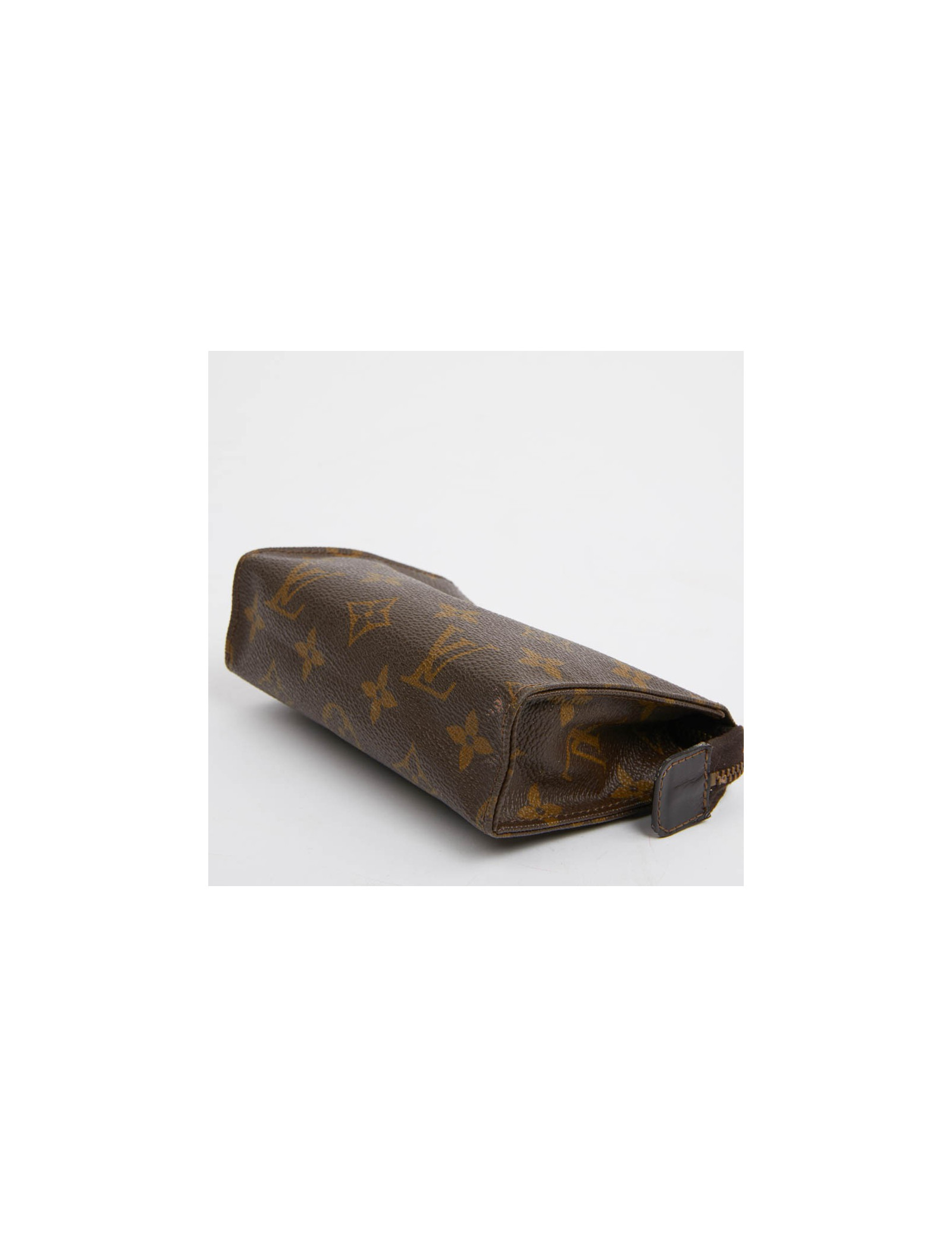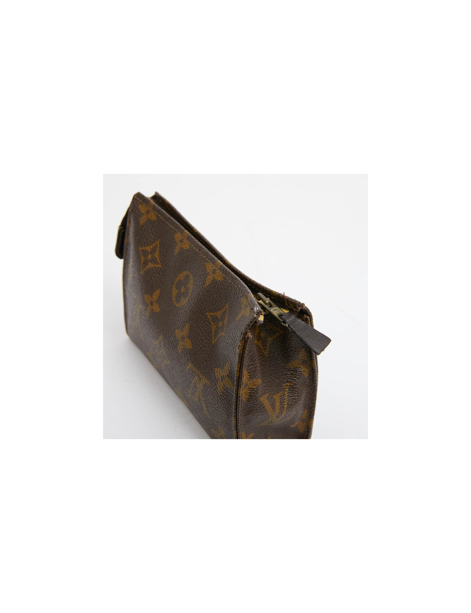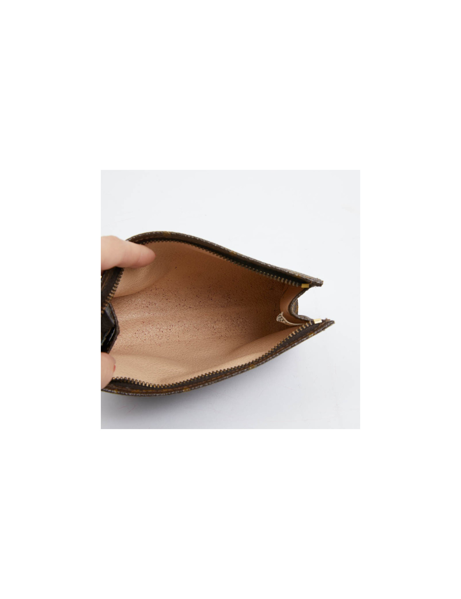 Mini pochette LOUIS VUITTON vintage en toile enduite Monogram marron. Elle est doublé en cuir beige (taches d'ancre rouge). La bijouterie est en laiton. Fermeture par un zip. Vous pourrez facilement la glisser dans un sac.