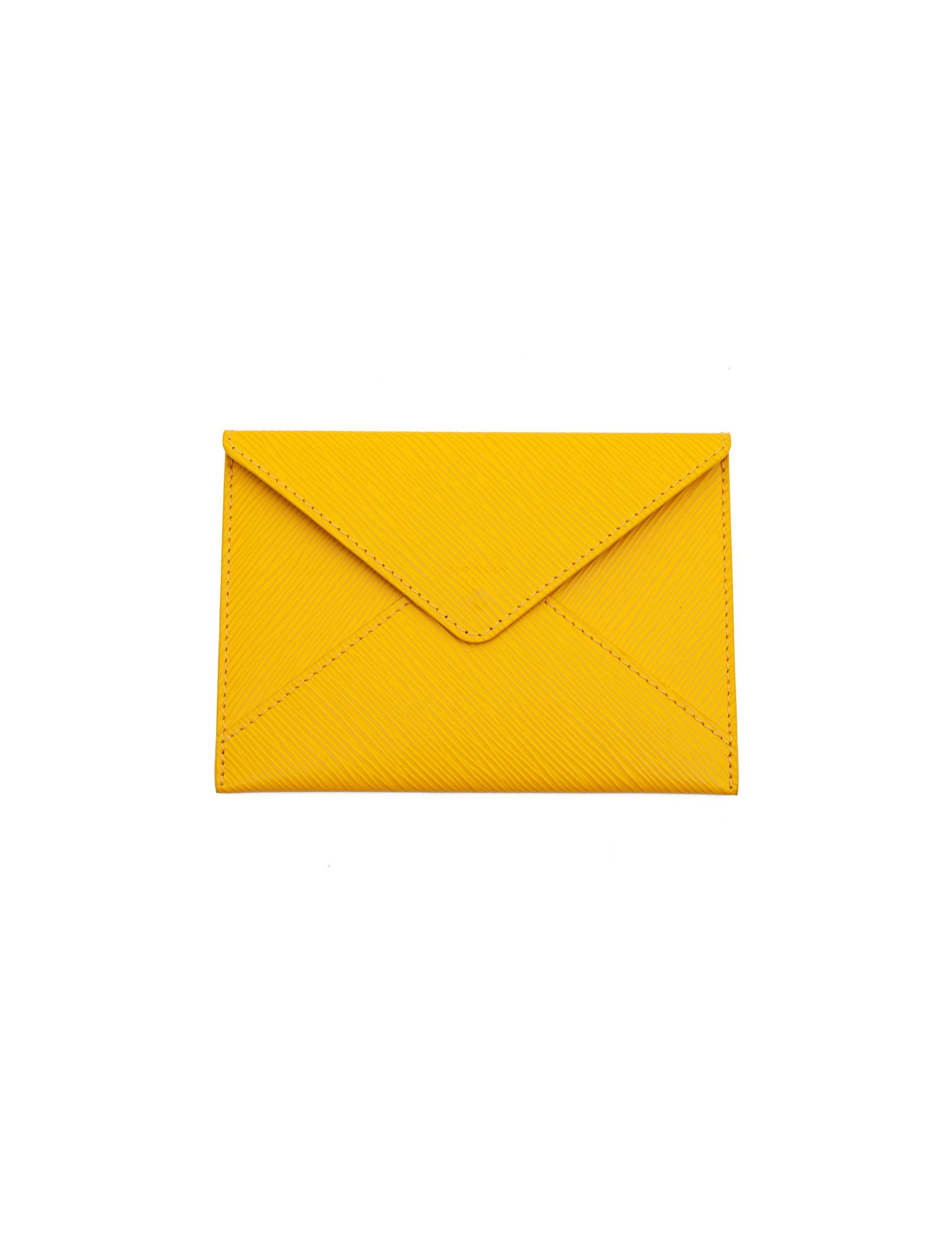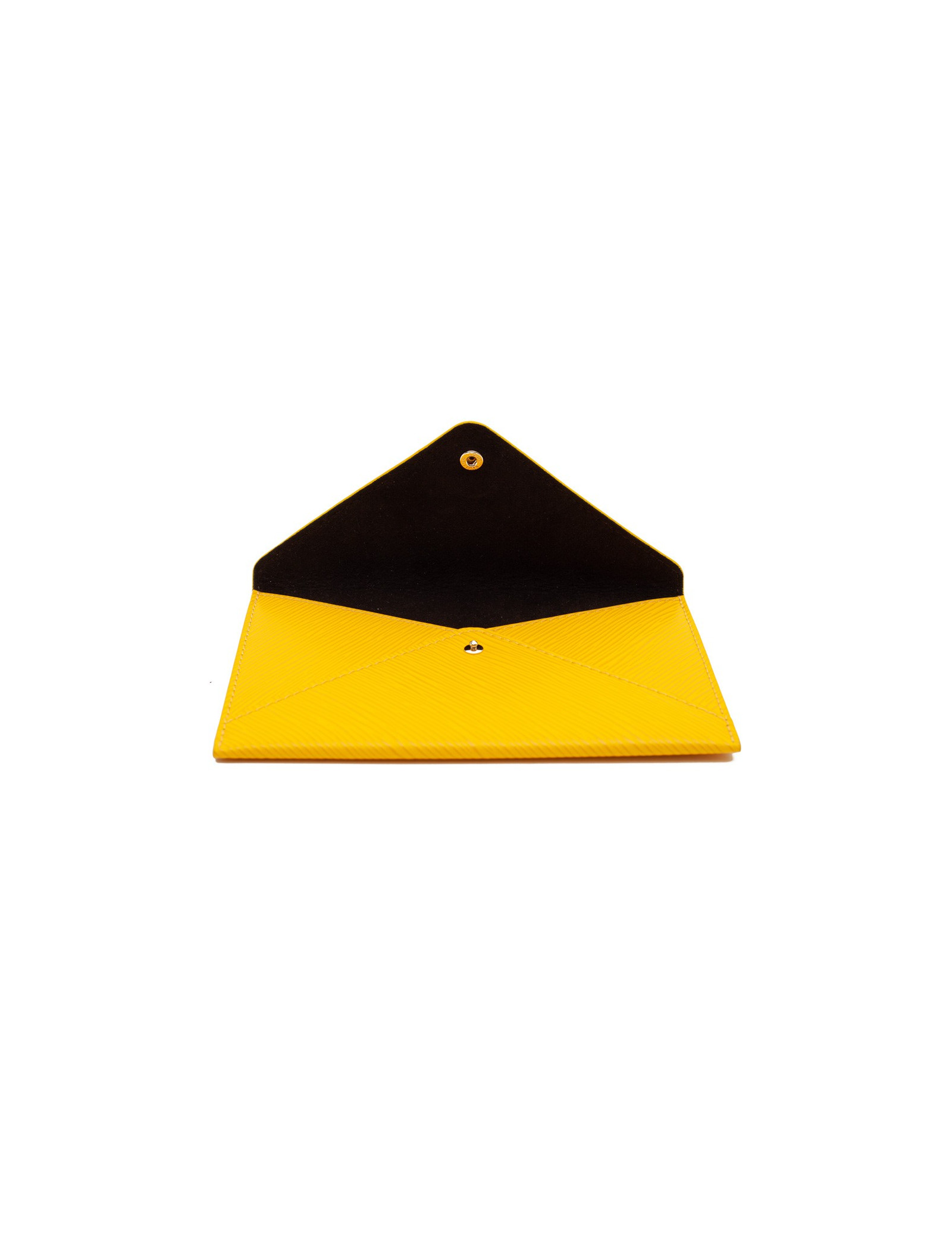 Jamais porté enveloppe LOUIS VUITTON en cuir Epi jaune doublé de suédine marron. Fermeture par une pression dorée.