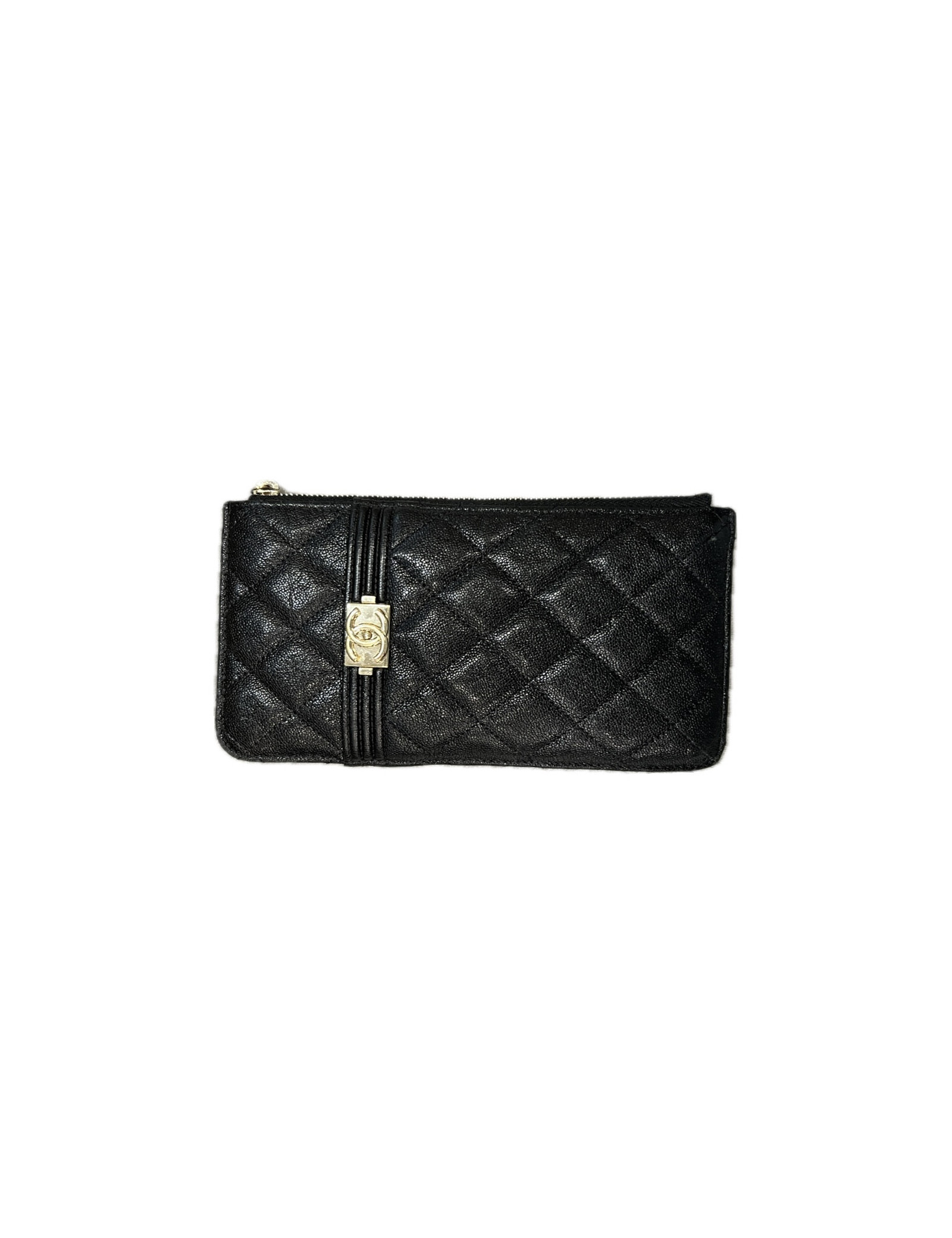 Détails : grand porte cartes en cuir caviar. Une poche avant agrémenté de l'emblématique fermoir Boy, cinq poches arrières pour cartes. A l'intérieur, u grand compartiment de rangement et plusieurs petits compartiments pour cartes. Très légère usure des coins.