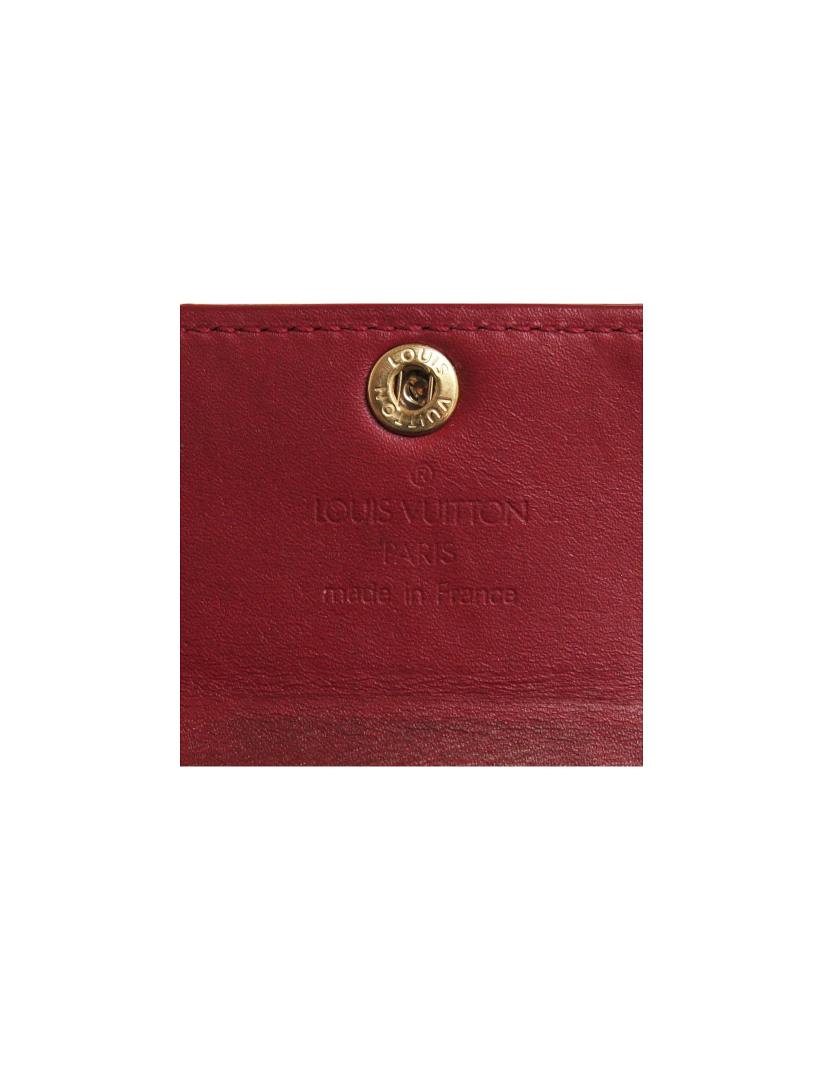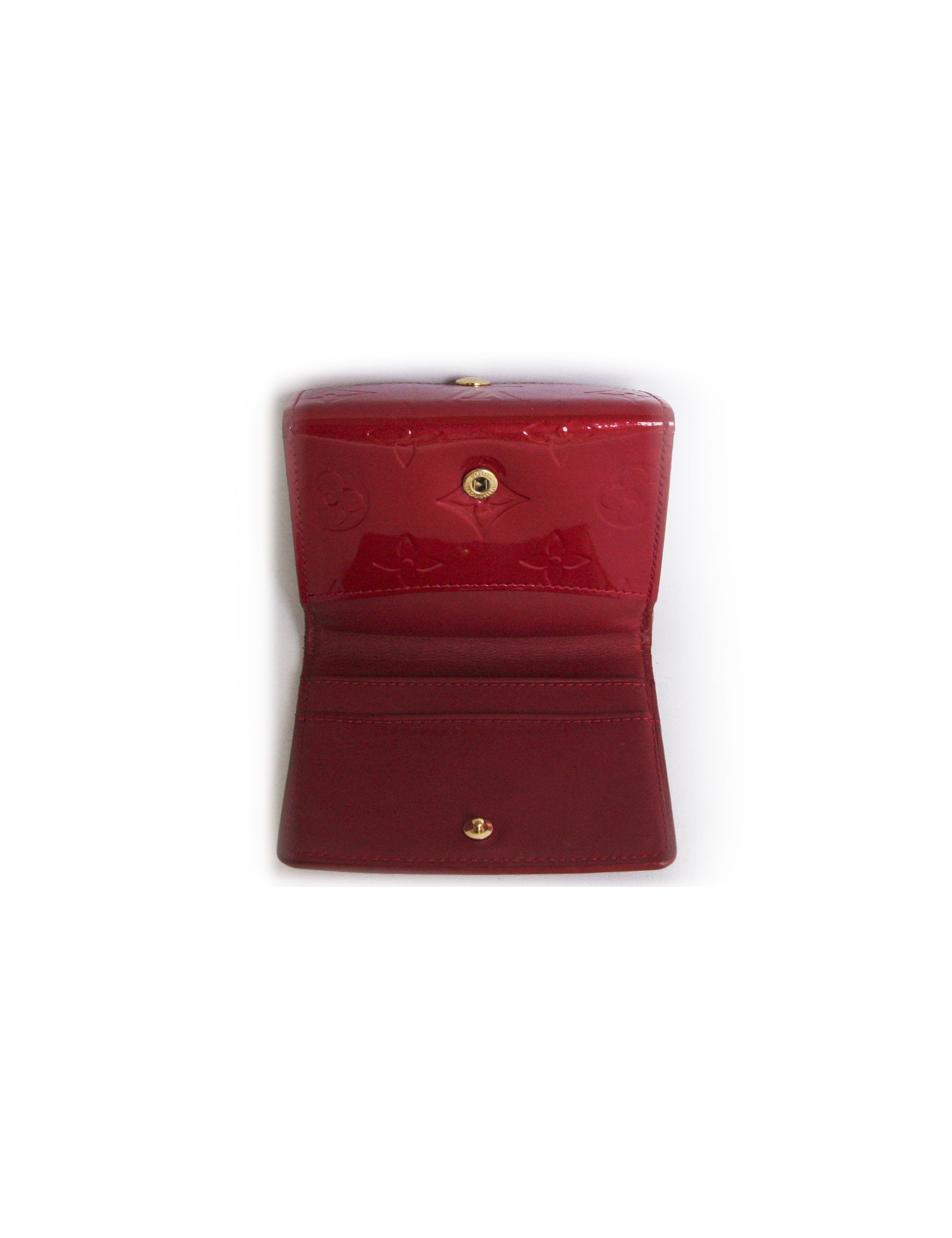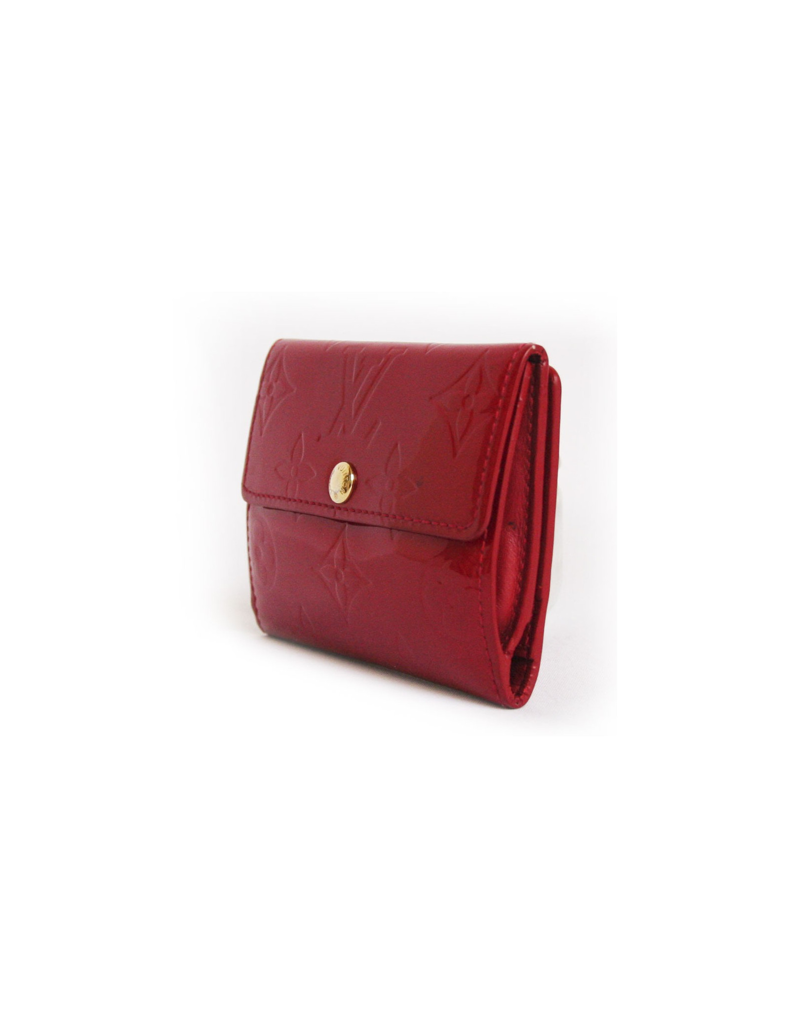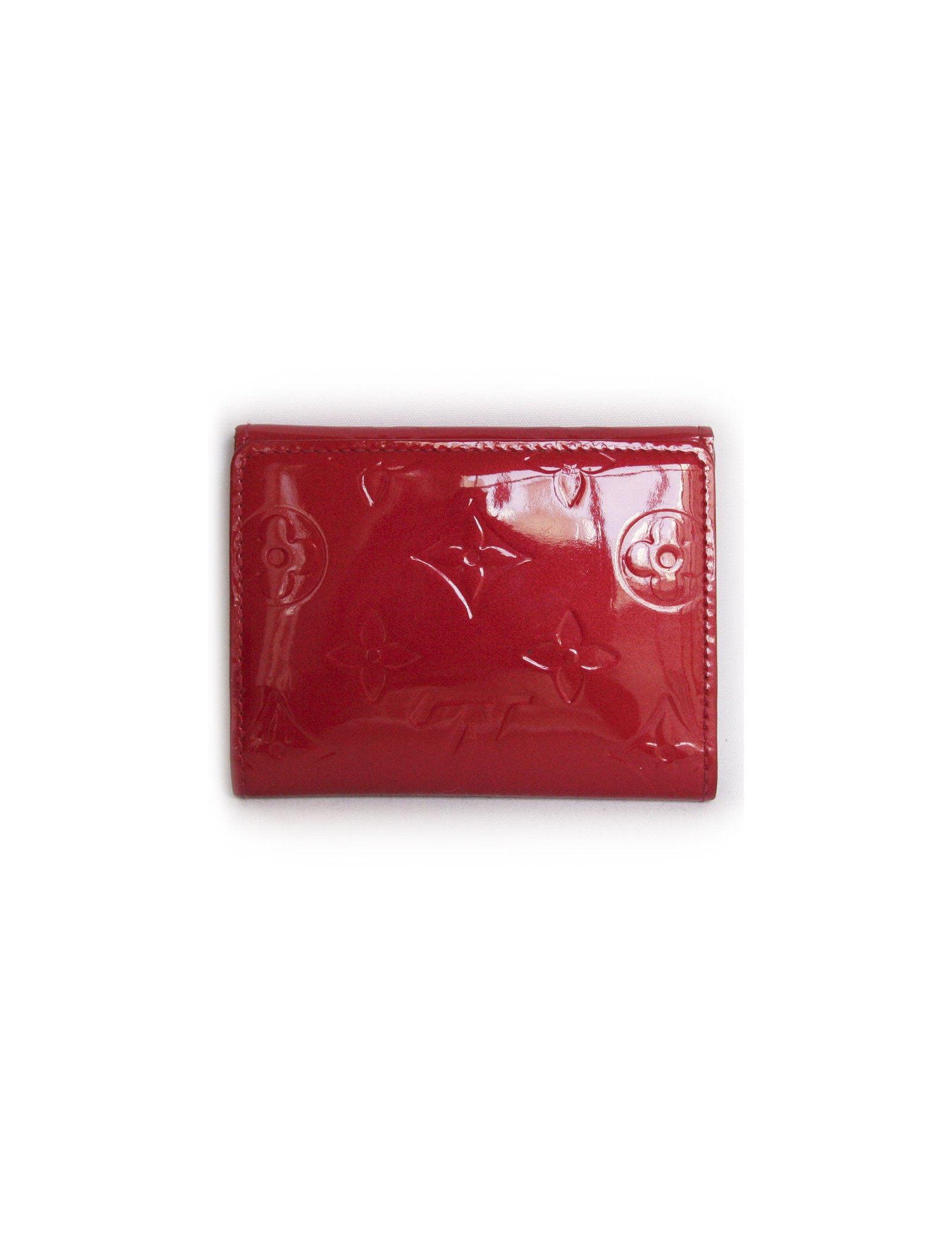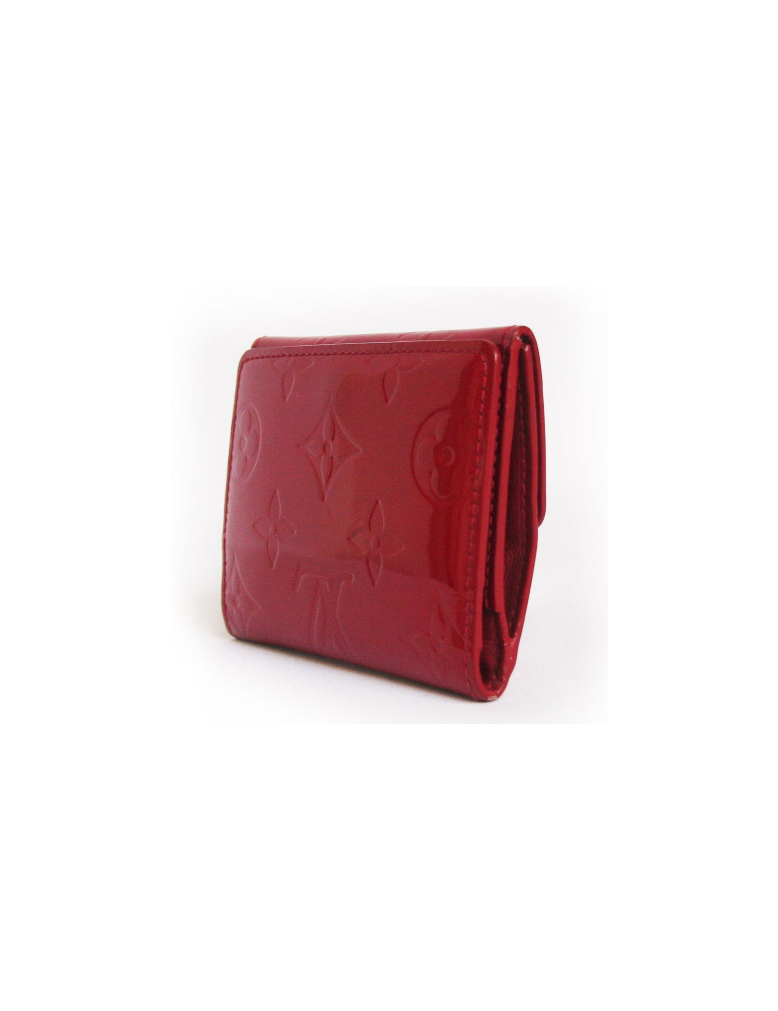 Porte monnaie Louis Vuitton en toile monogram verni rouge. Doublure en cuir de veau lisse. Fermoir avec bouton pression. Compartiment monnaie avec fermoir viennois. Deux fentes pour cartes et reçus. Pièces métalliques en laiton doré. En très bon état.