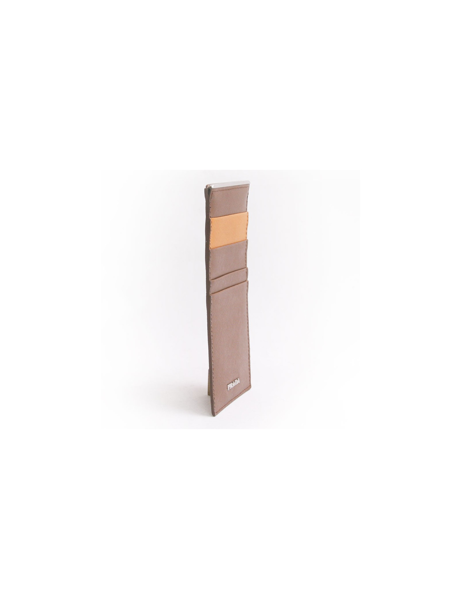 Porte-cartes extra-plat Prada, pour homme, en cuir grainé, de couleur marron clair et une fente jaune moutarde.Très bon état (jamais porté)