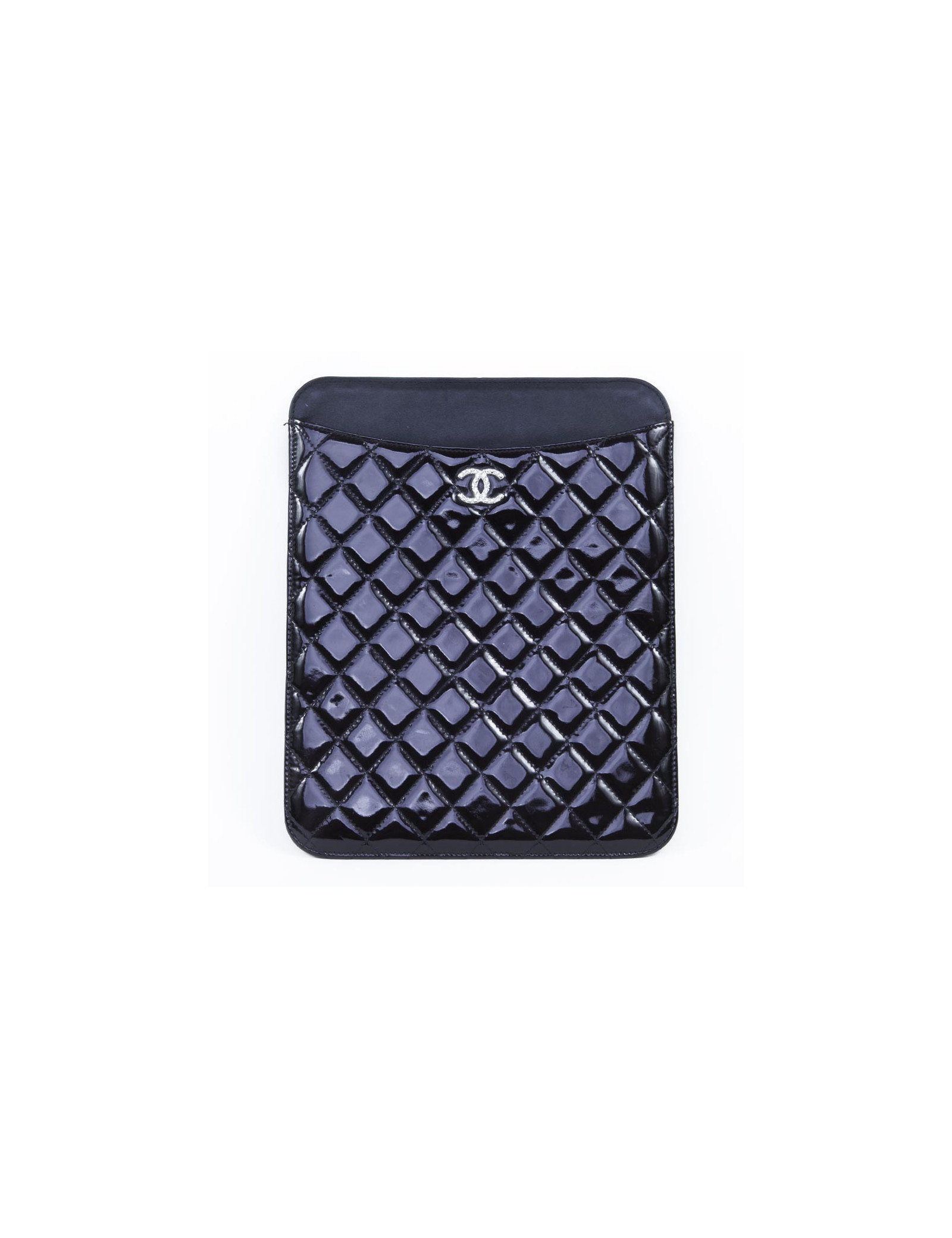 Pochette pour ipad Chanel en cuir verni matelassé noir. Le 'CC' à l'avant est en métal guilloché palladié. L'intérieur est en cuir lisse noir. Hologramme: 1508.... En très bon état, malgré quelques marques d'usage sur le vernis.