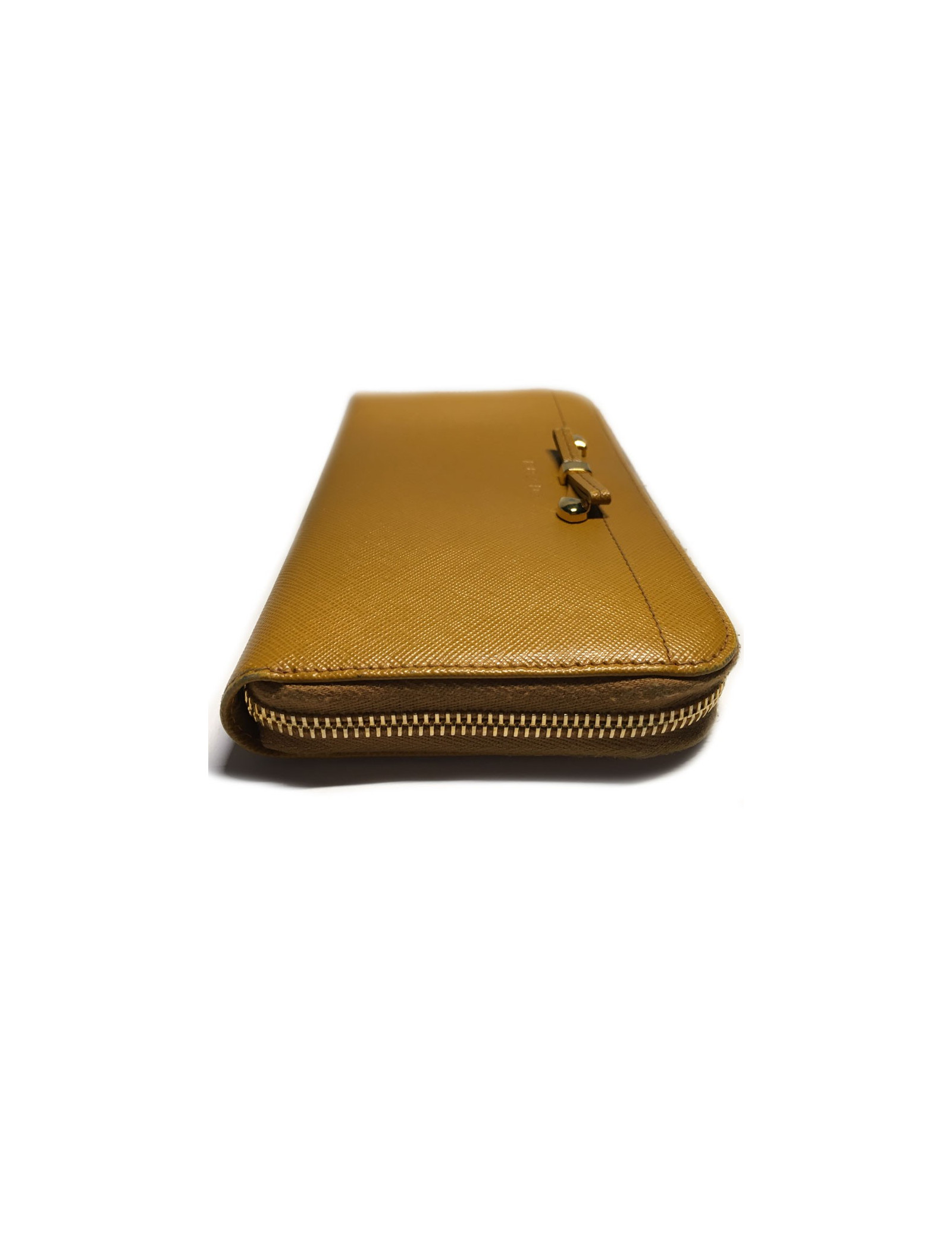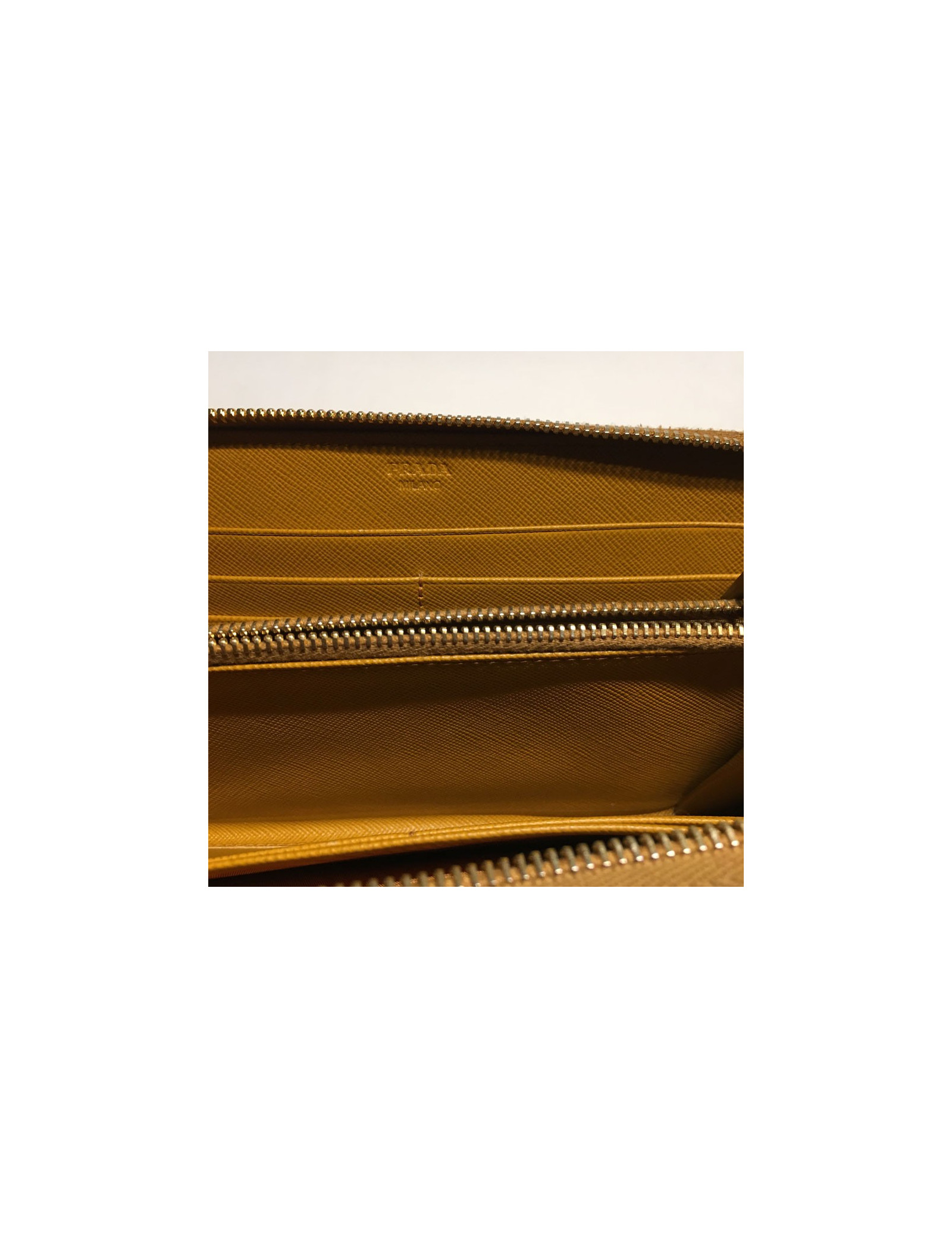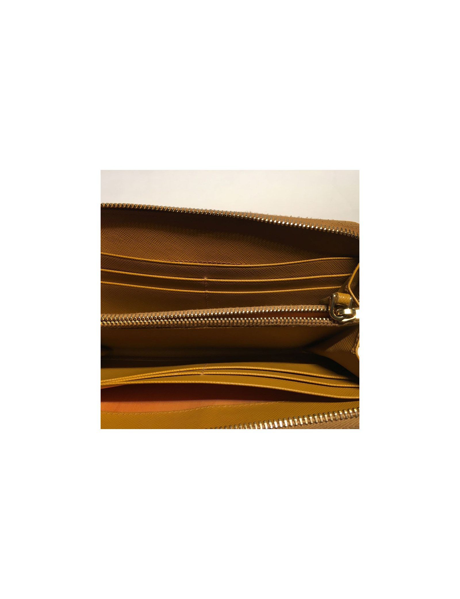 Portefeuille PRADA zippé en cuir grainé gold. Porte monnaie zippé, 4 grandes fentes et 8 fentes à cartes de visite. Des petites traces de salissures sur les bords de la fermeture éclair. En très bon état.