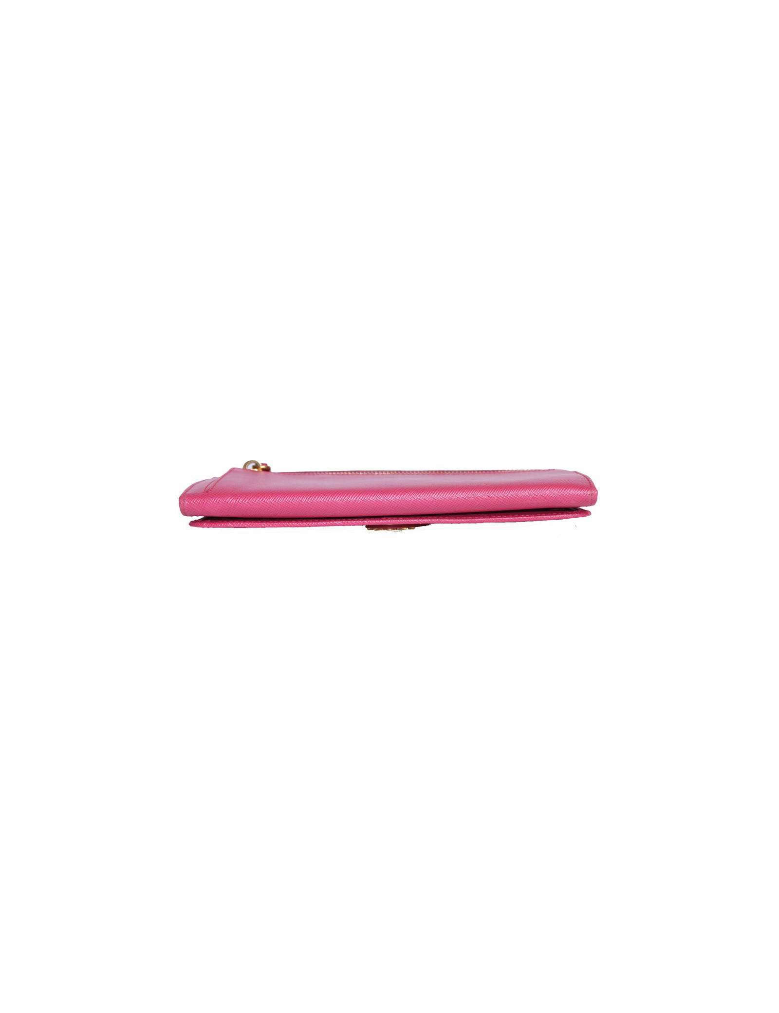 Portefeuille de la Maison Prada en cuir grainé rose fuschia. Fermeture par bouton pression. Bijouterie doré. 12 fentes pour cartes bleue, 4 grandes fentes à billet, une poche zippée pour la monnaie ainsi qu'une poche zippée à l'arrière. Carte d'authenticité. En très bon état.