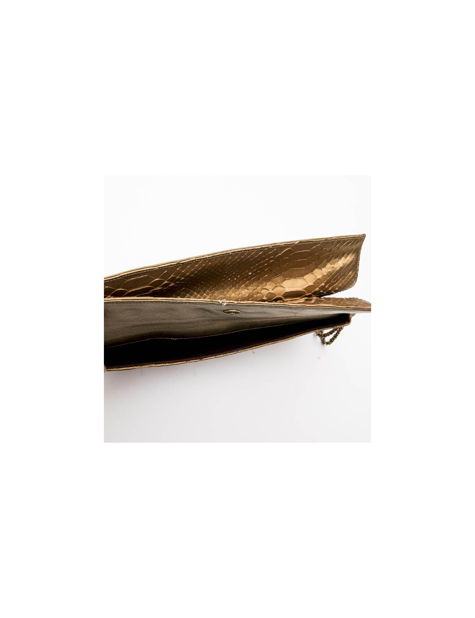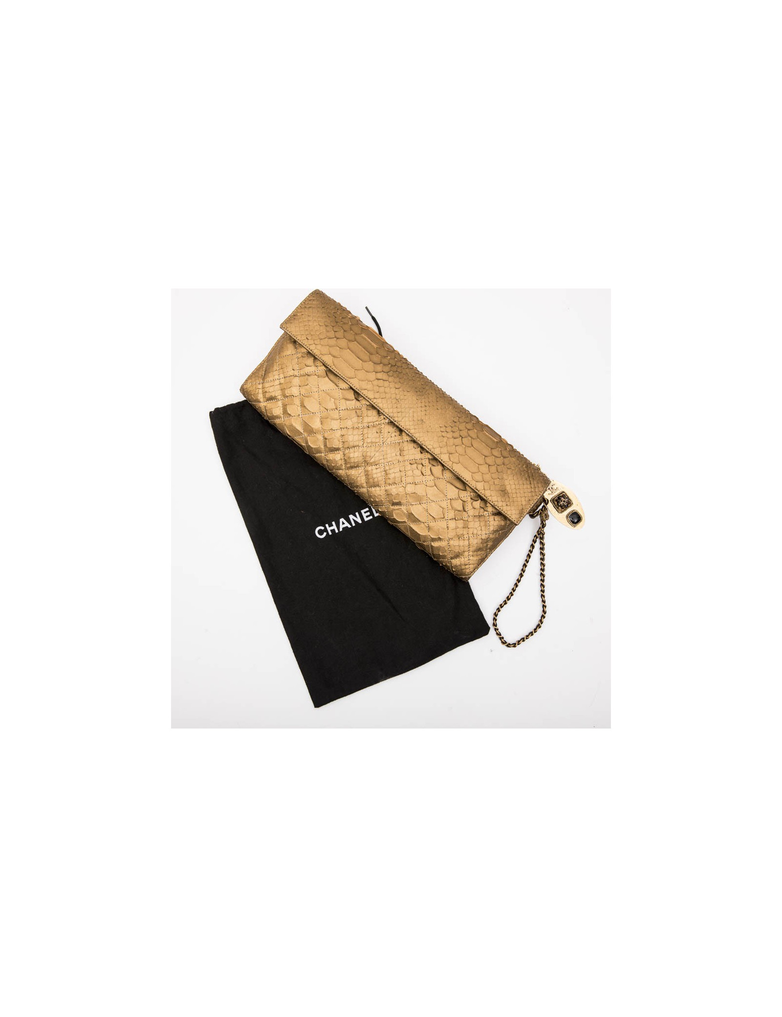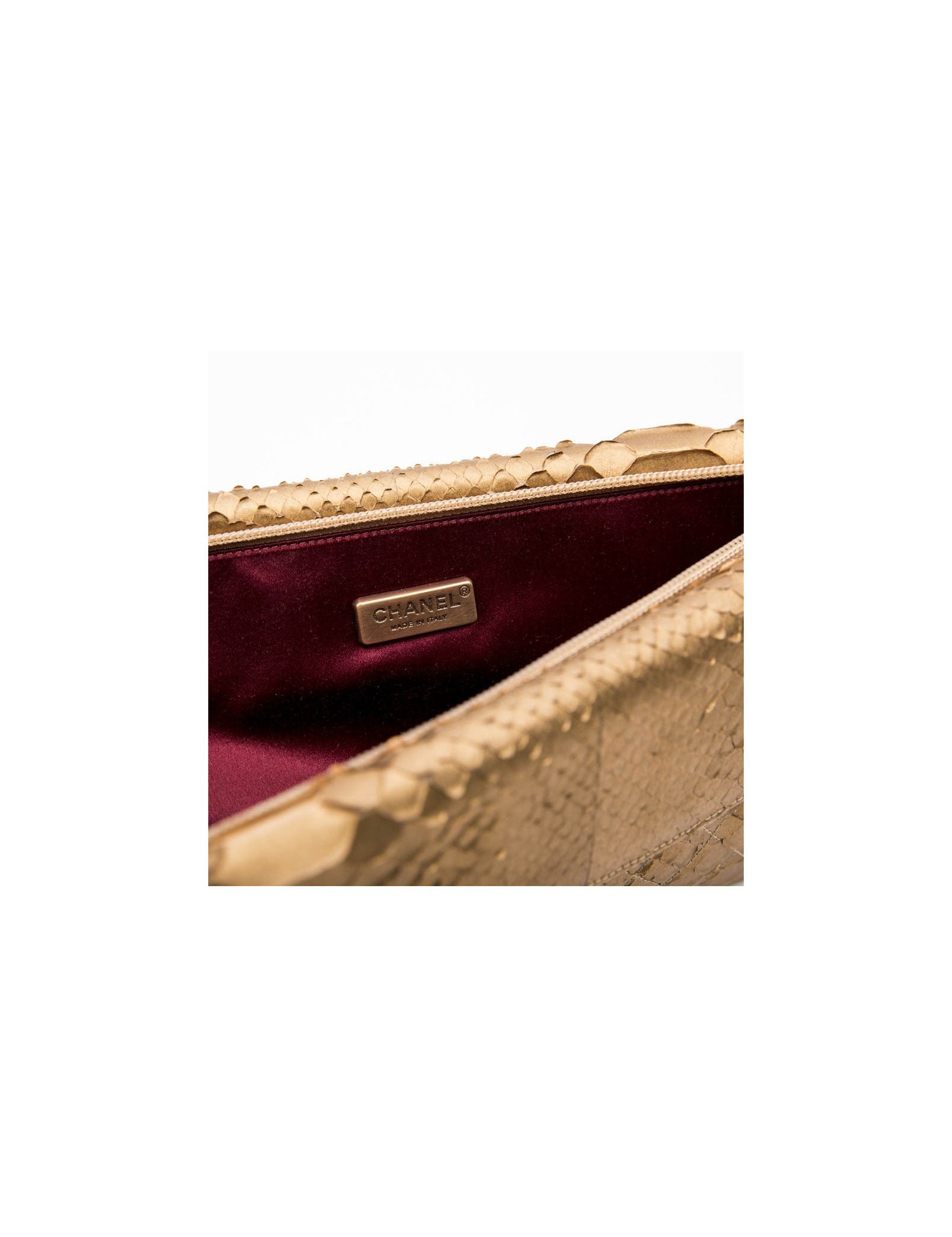 Longue pochette Chanel en python or mat cuivré. L'intérieur est en satin duchesse bordeaux avec 3 soufflets dont un zippé. Bijouterie laiton doré. fermeture à glissière avec un médaillon martelé et pâte de verre.