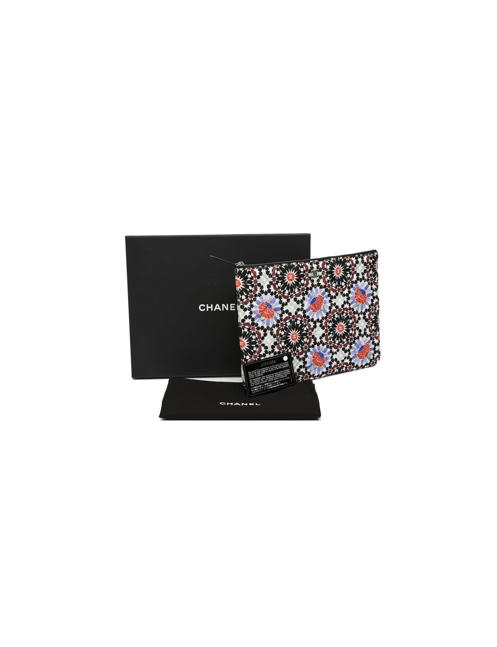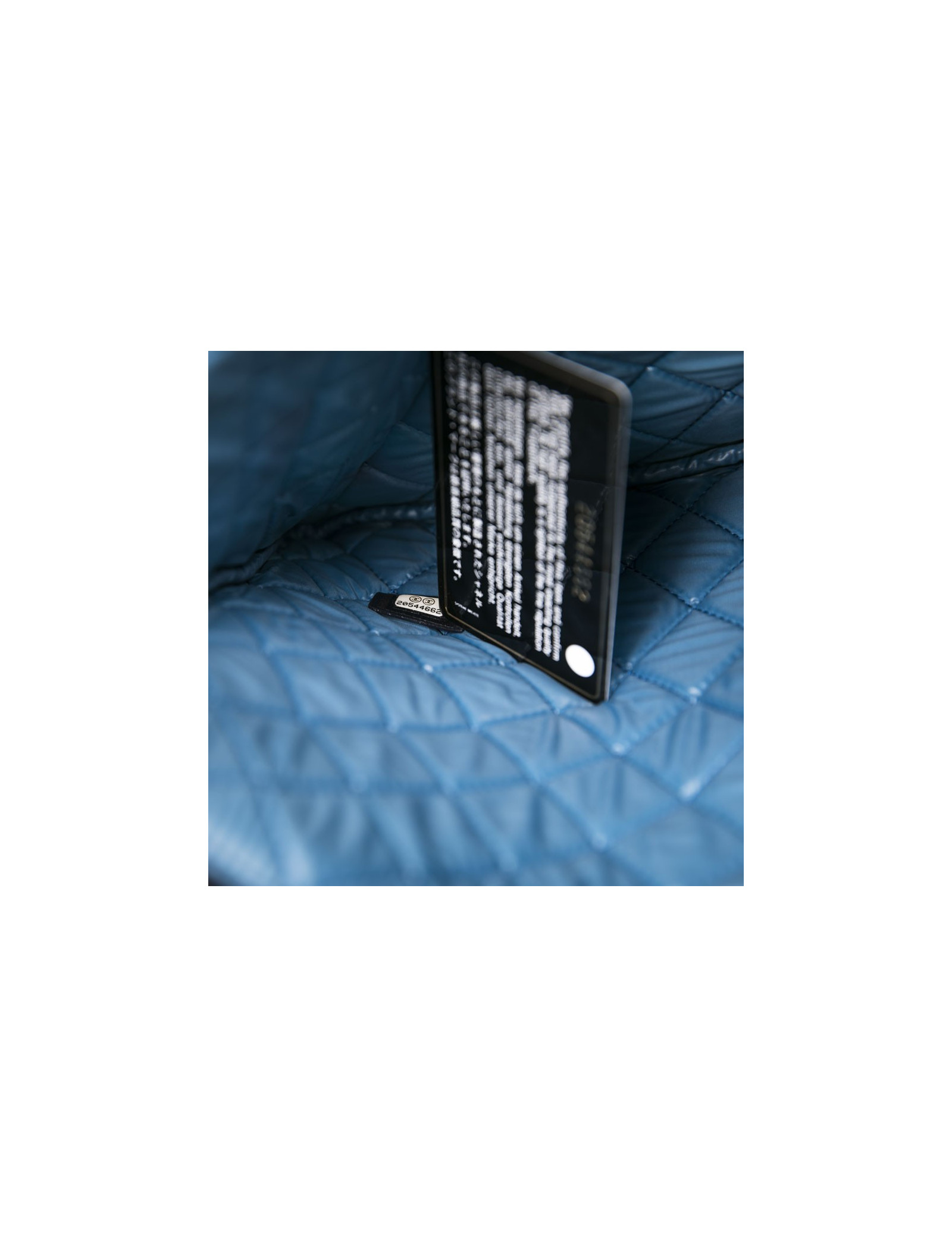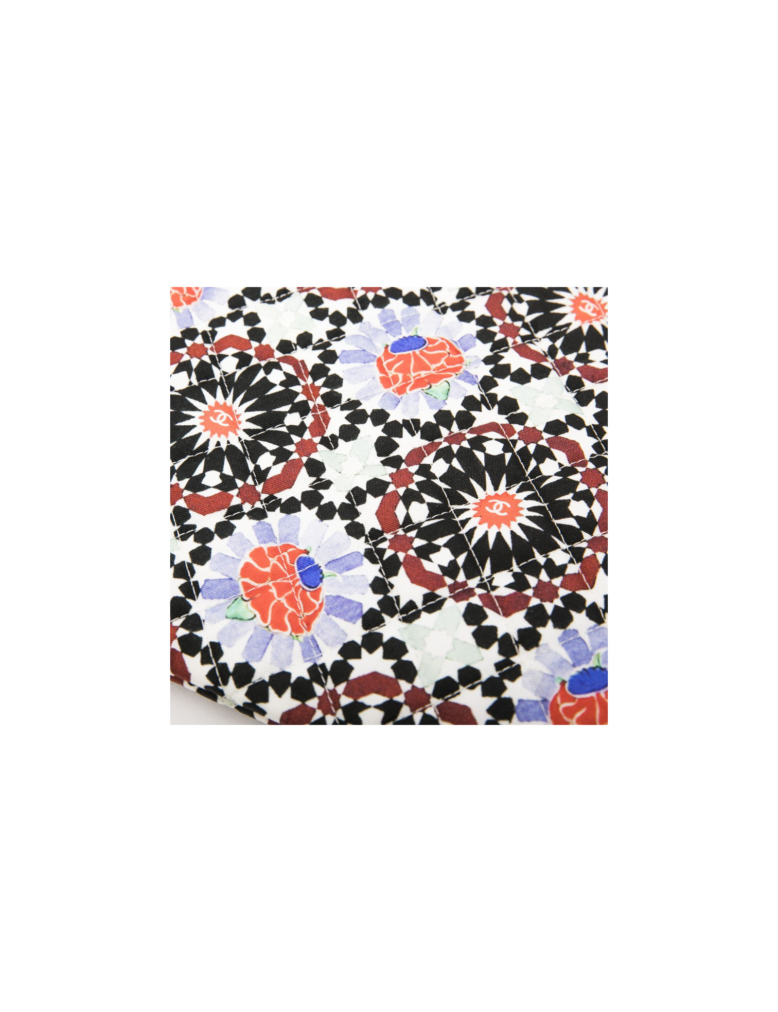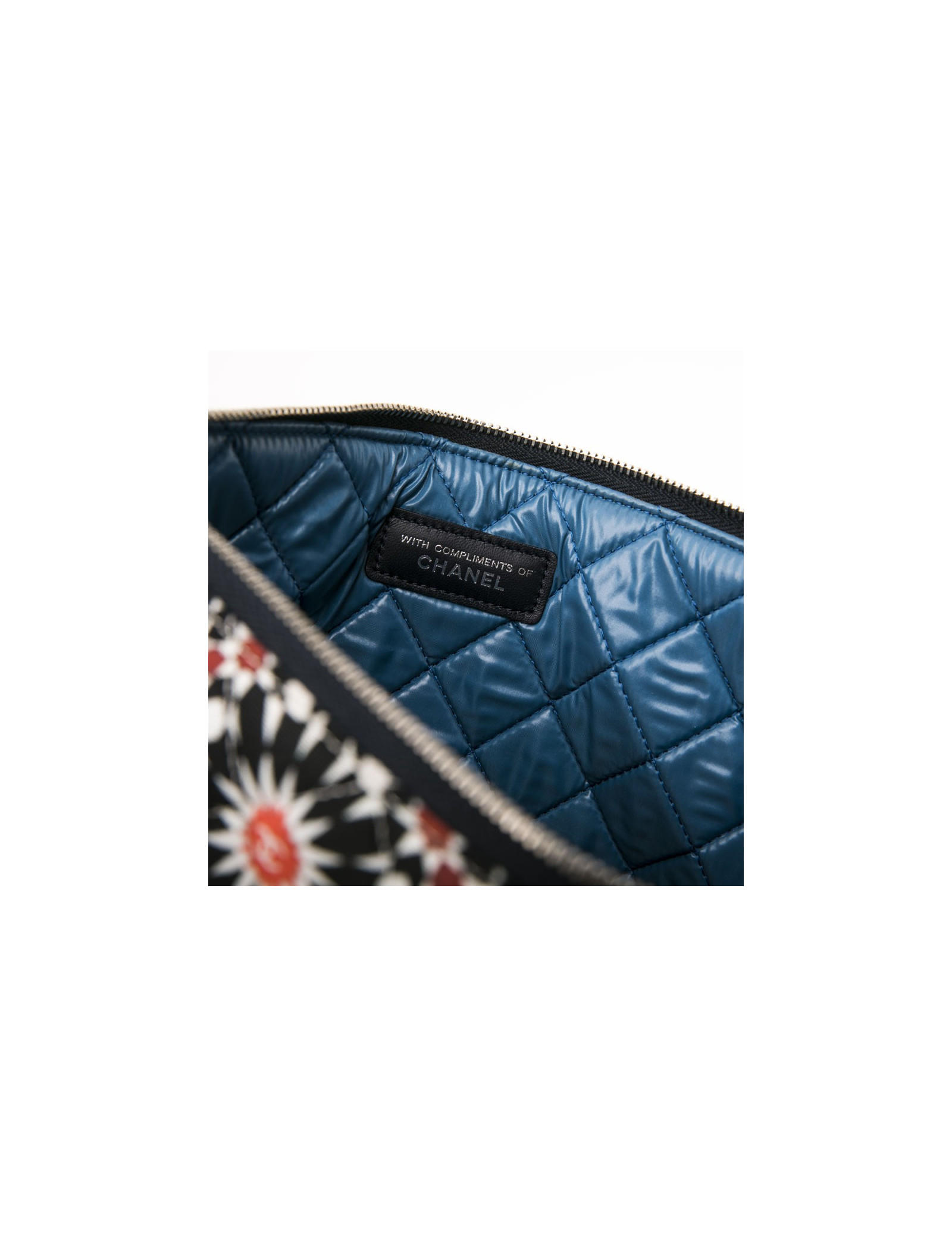 Pochette Chanel Paris-Dubai", en tissu matelassé. Fermeture zippée. Bijouterie argentée. L'intérieur est en matière imperméable bleu.