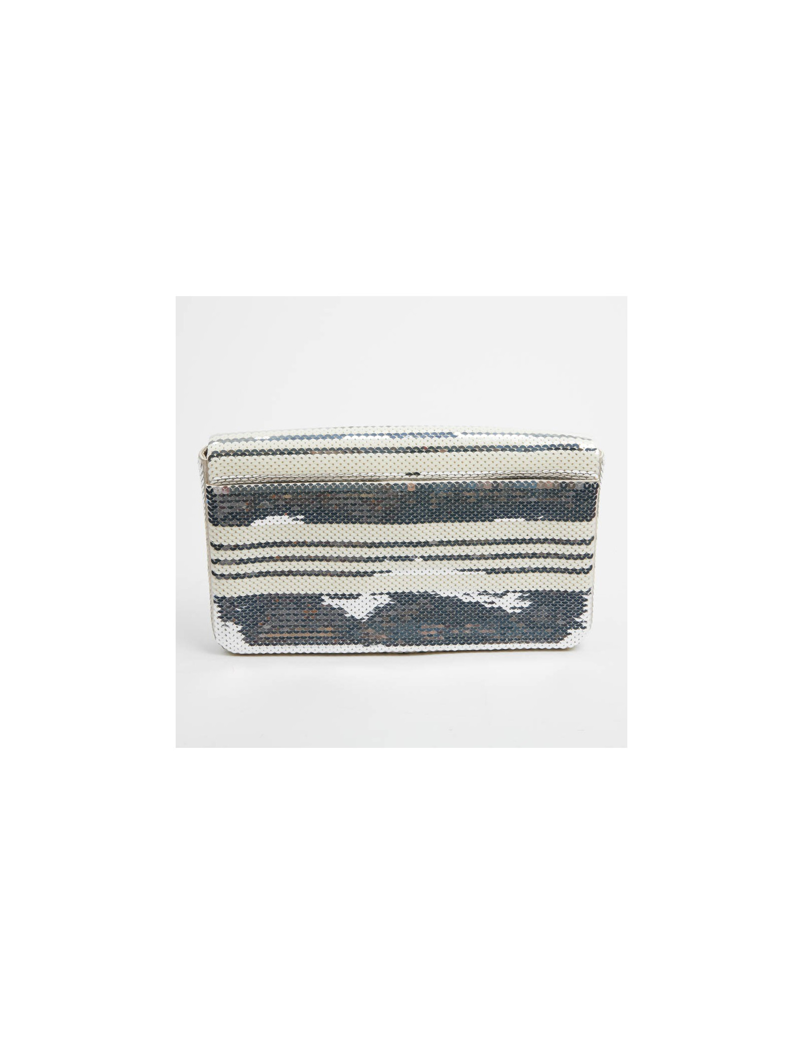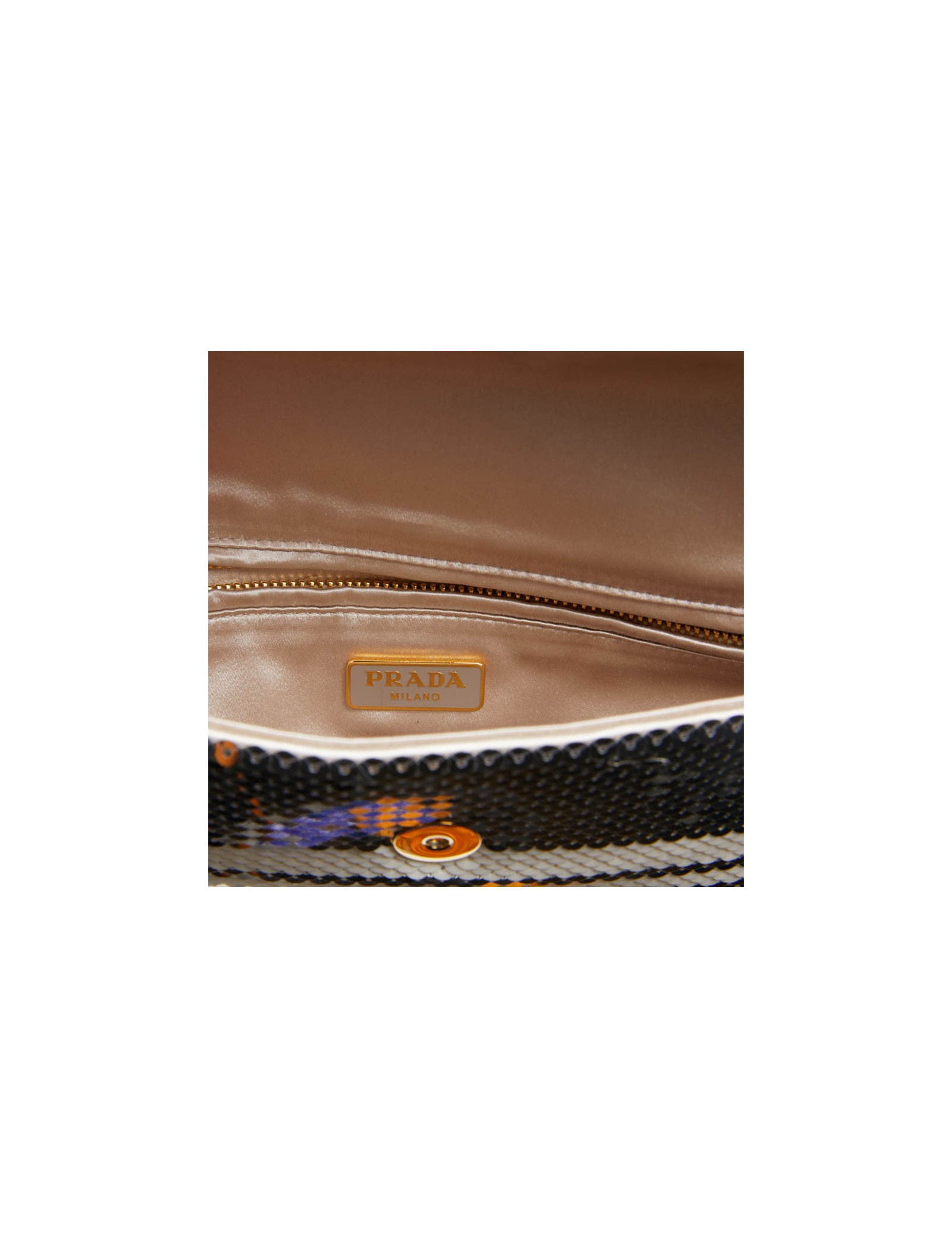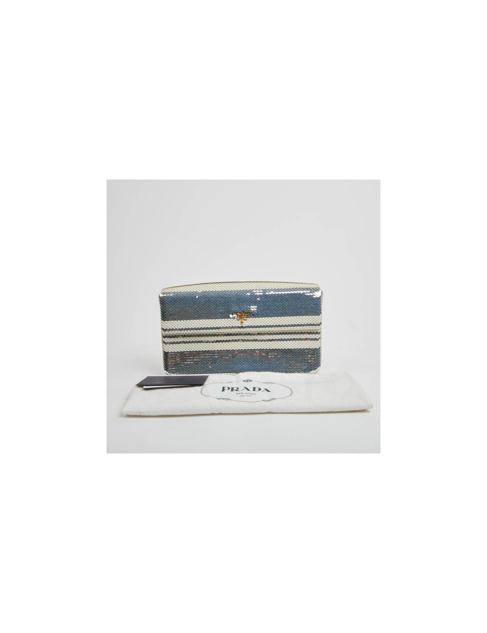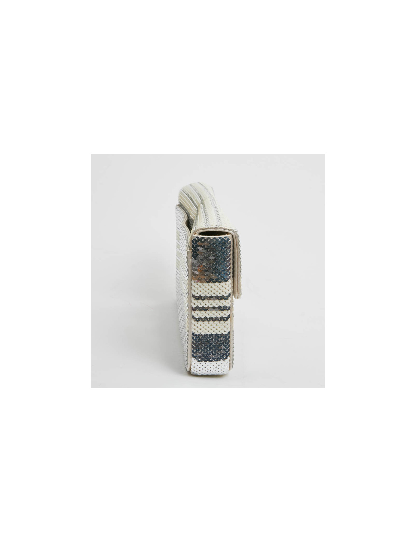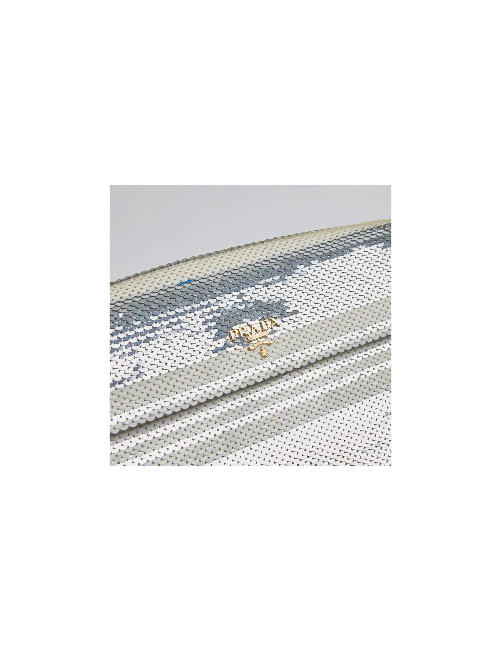 MAGNIFIQUE pochette à rabat PRADA en sequins argent et blanc. Une poche plate à l'arrière. La bijouterie est dorée, fermeture par bouton pression. Elle est doublé en satin nude. Une poche zippée. Elle se porte à la main.