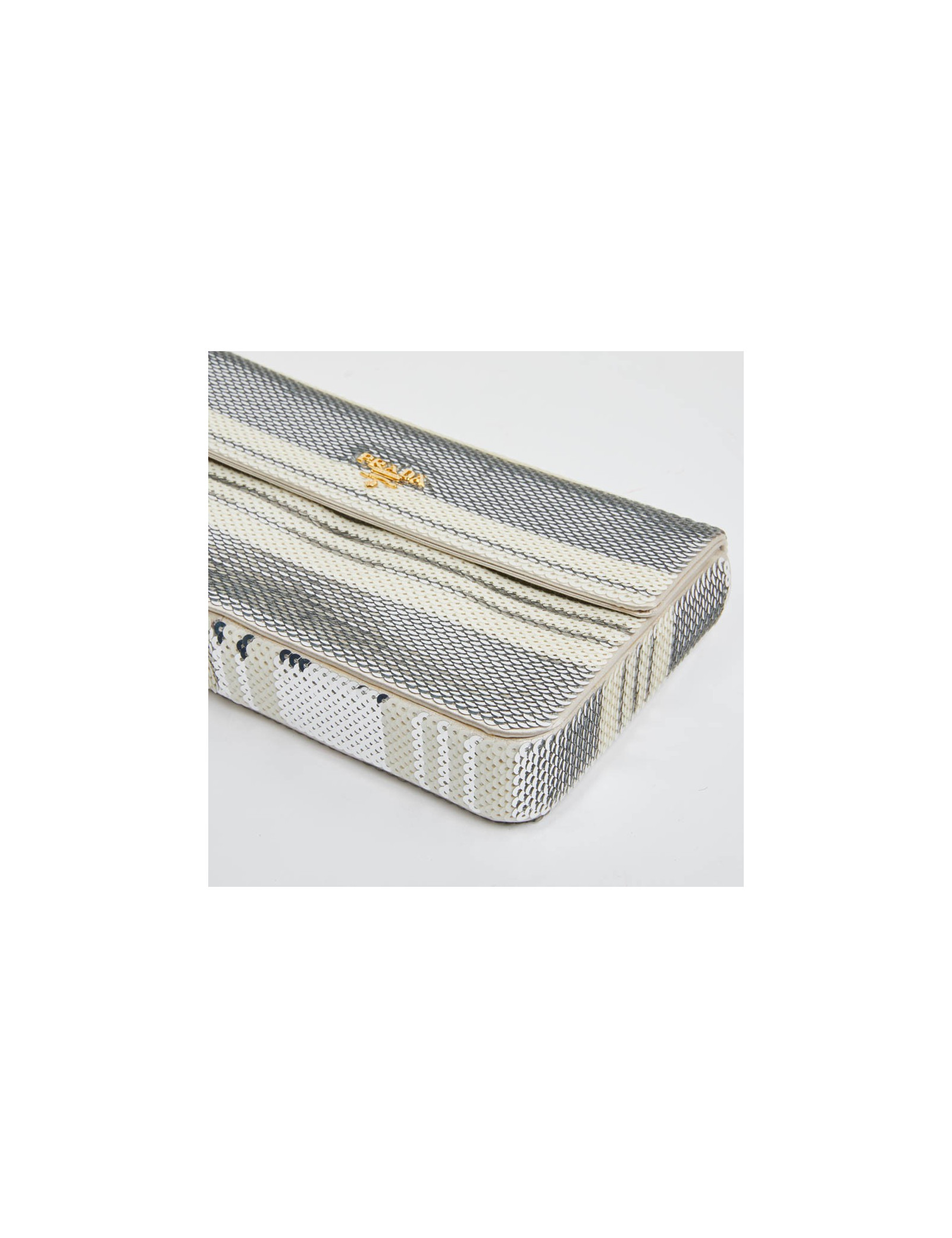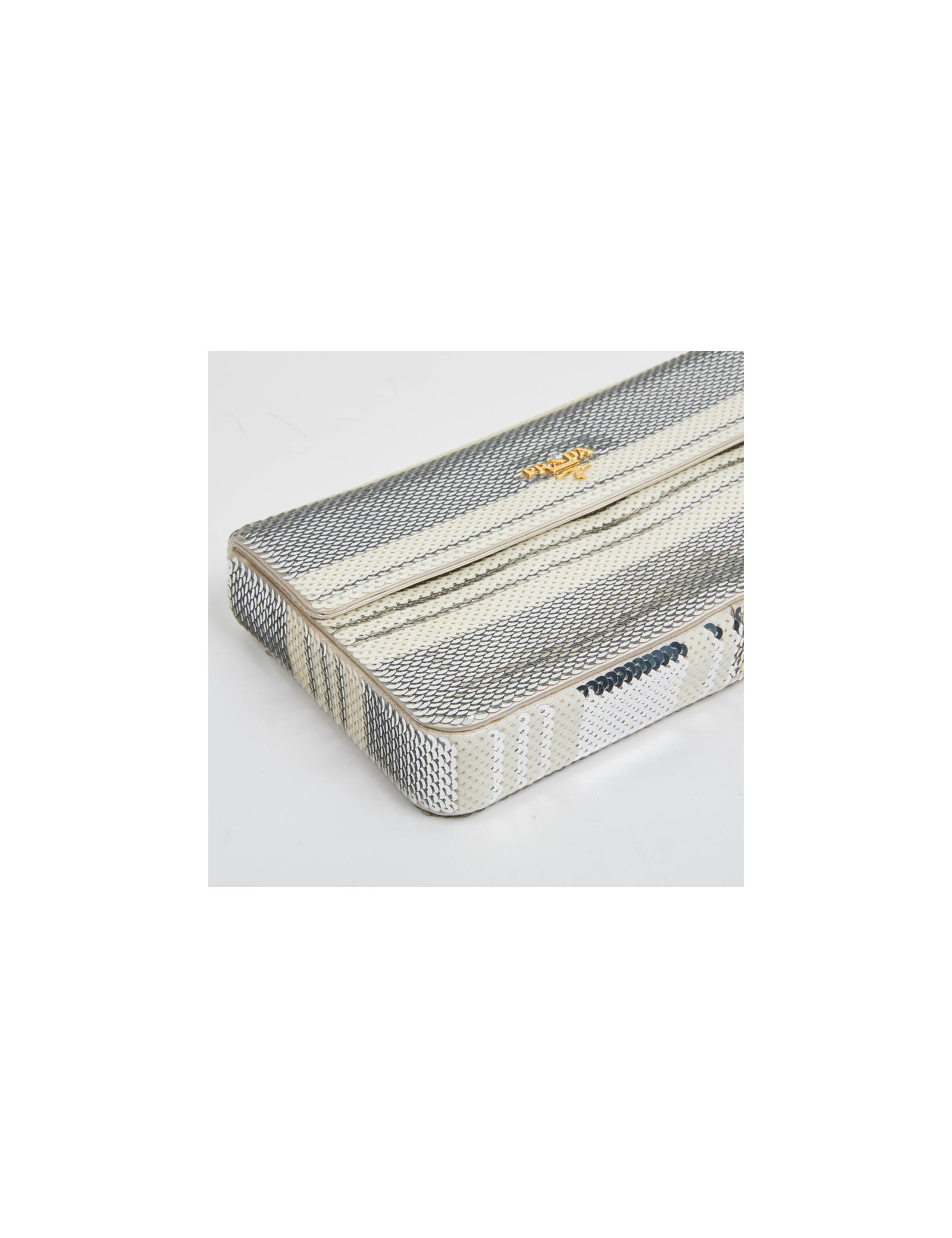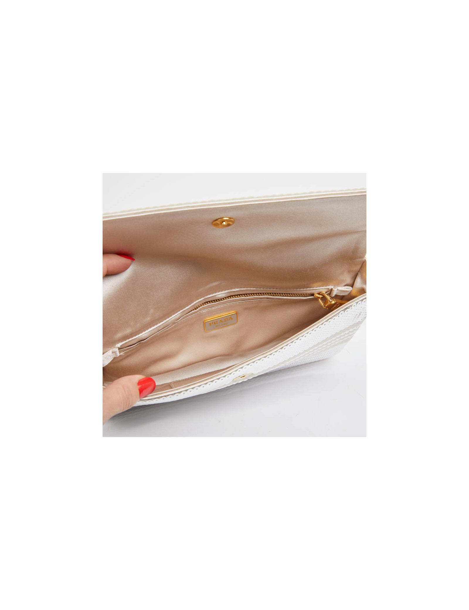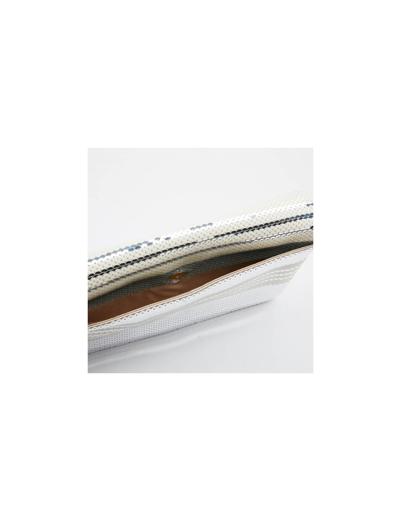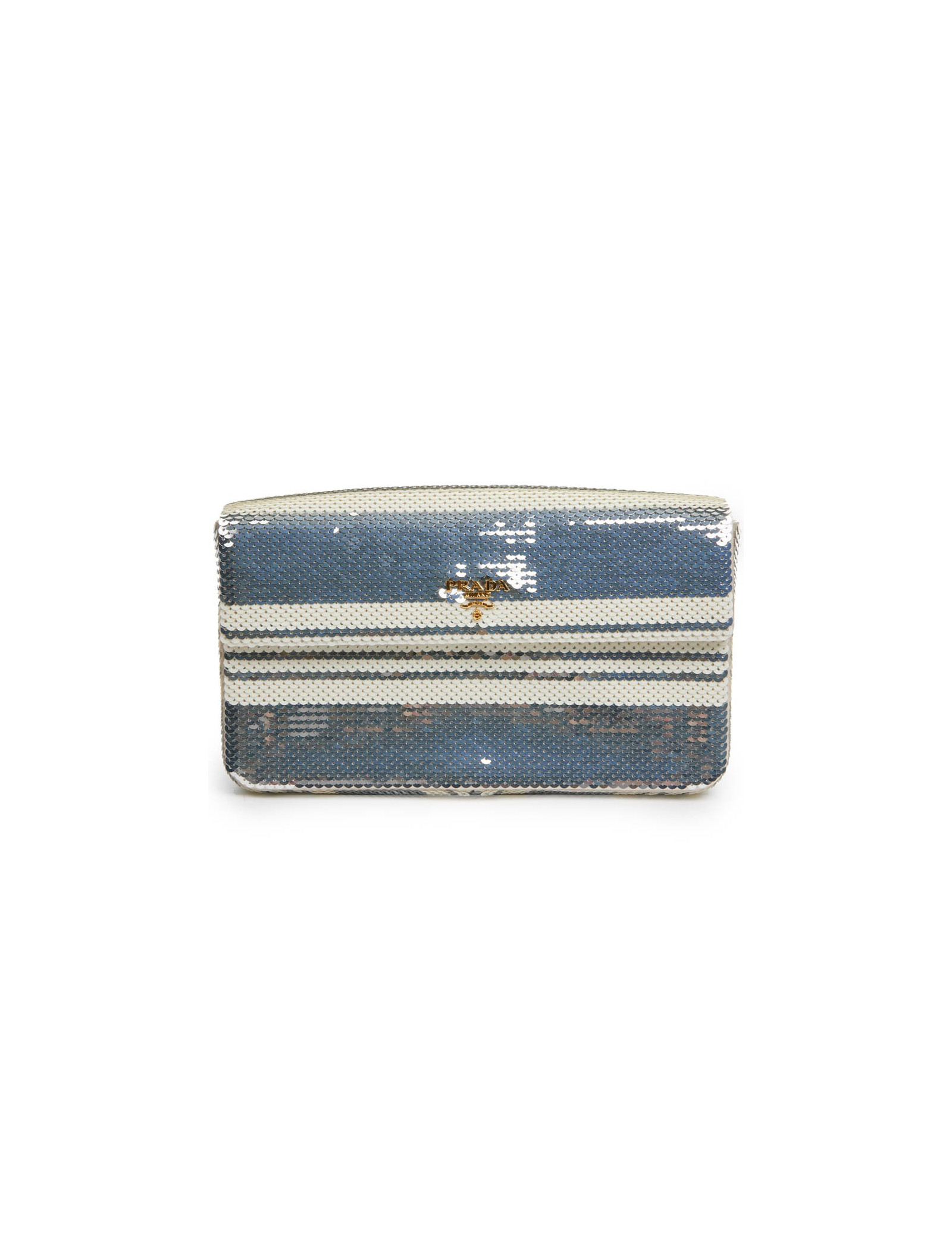 MAGNIFIQUE pochette à rabat PRADA en sequins argent et blanc. Une poche plate à l'arrière. La bijouterie est dorée, fermeture par bouton pression. Elle est doublé en satin nude. Une poche zippée. Elle se porte à la main.