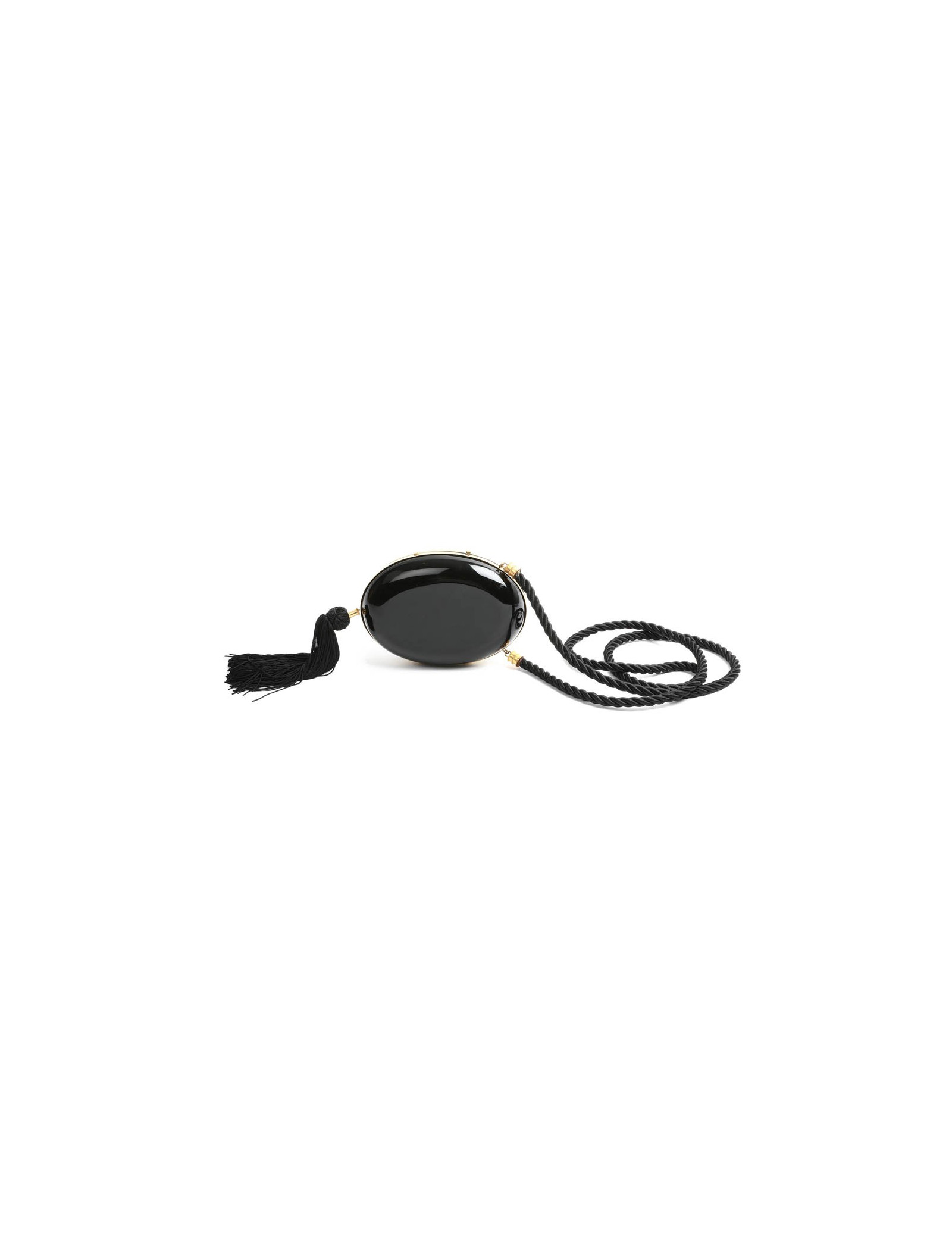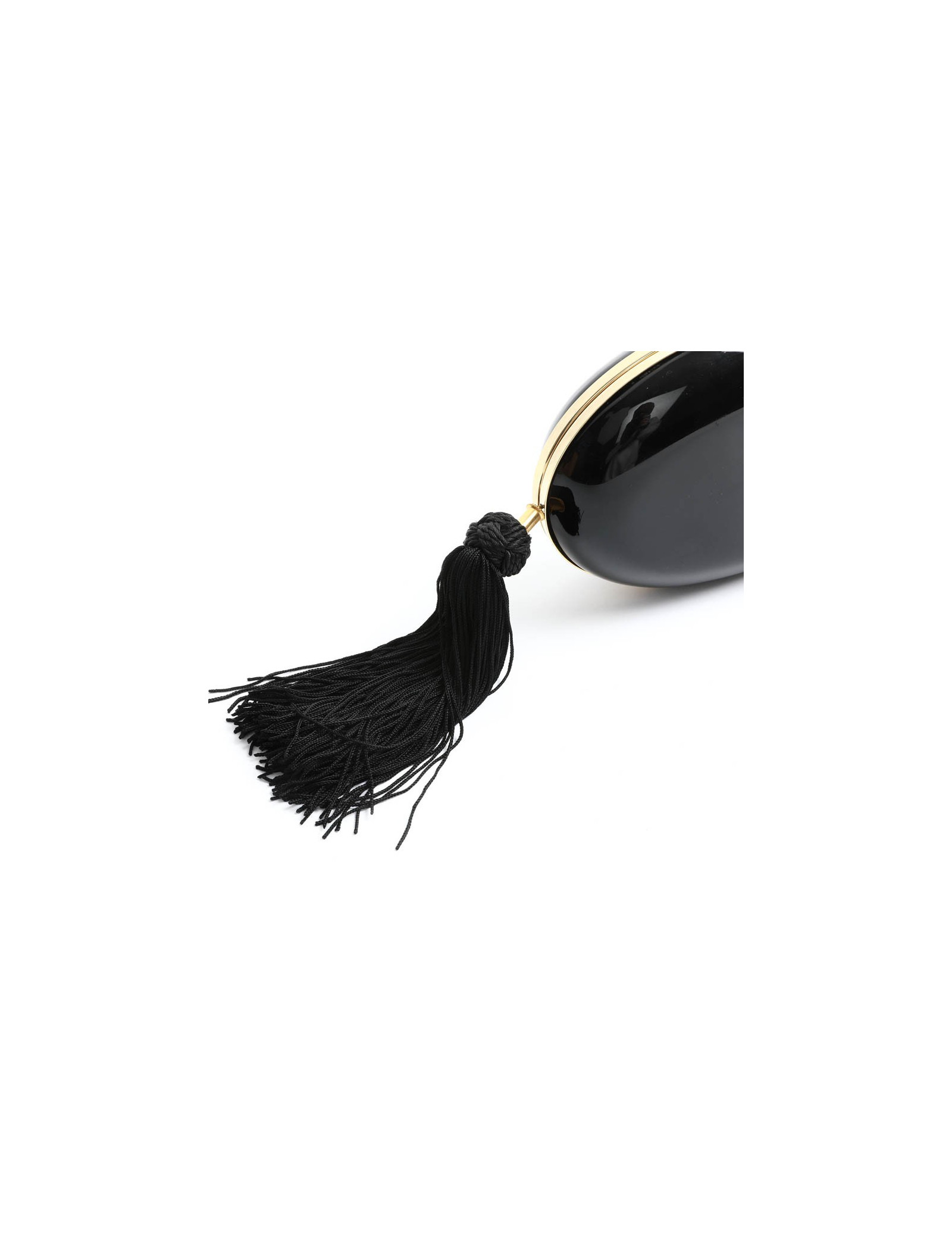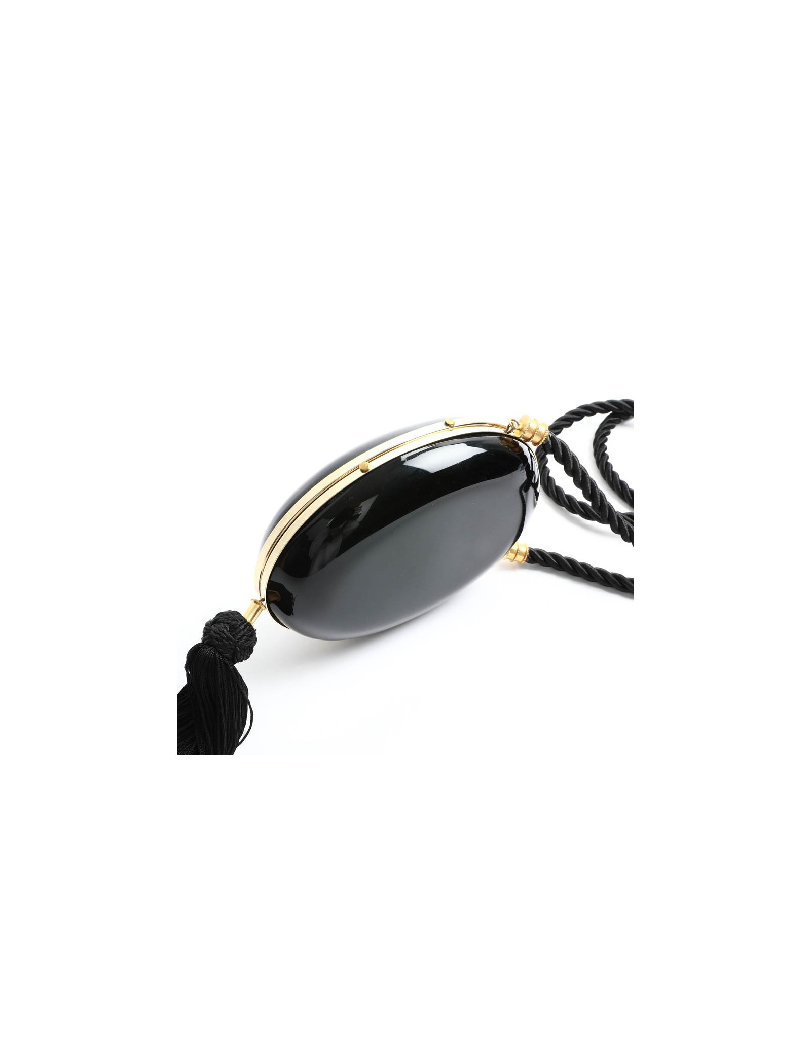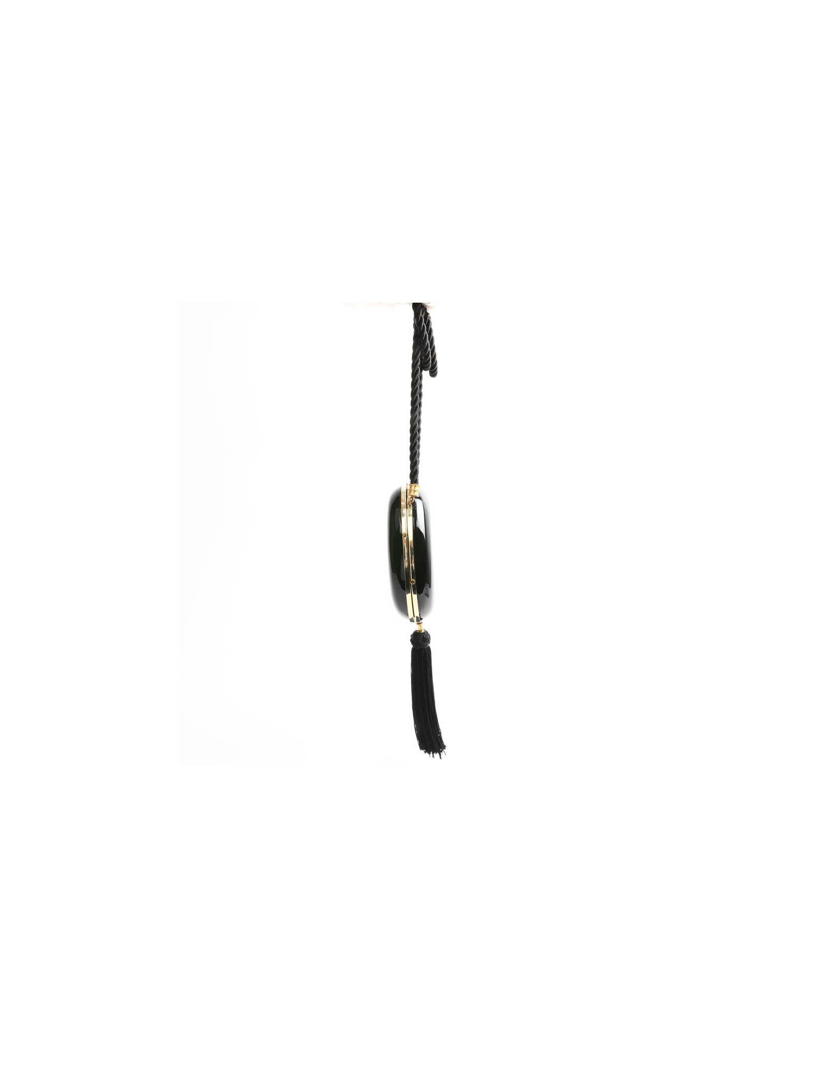 Ravissante minaudière en plexi noir se terminant par un pompon, typique des articles vintage YSL. Elle se porte à l'épaule ou croisée. En très bon état. La bijouterie est dorée.