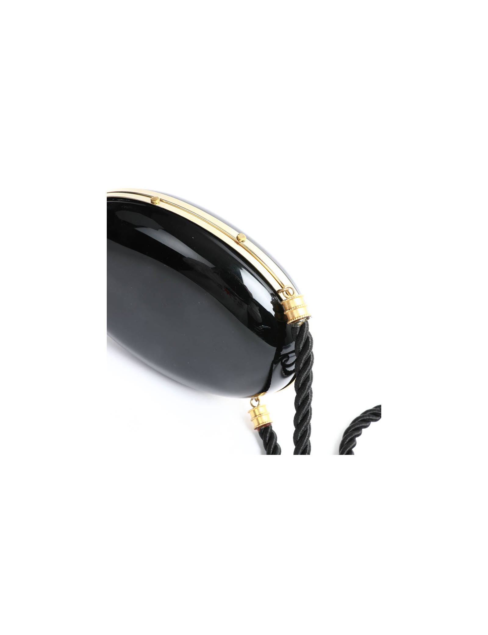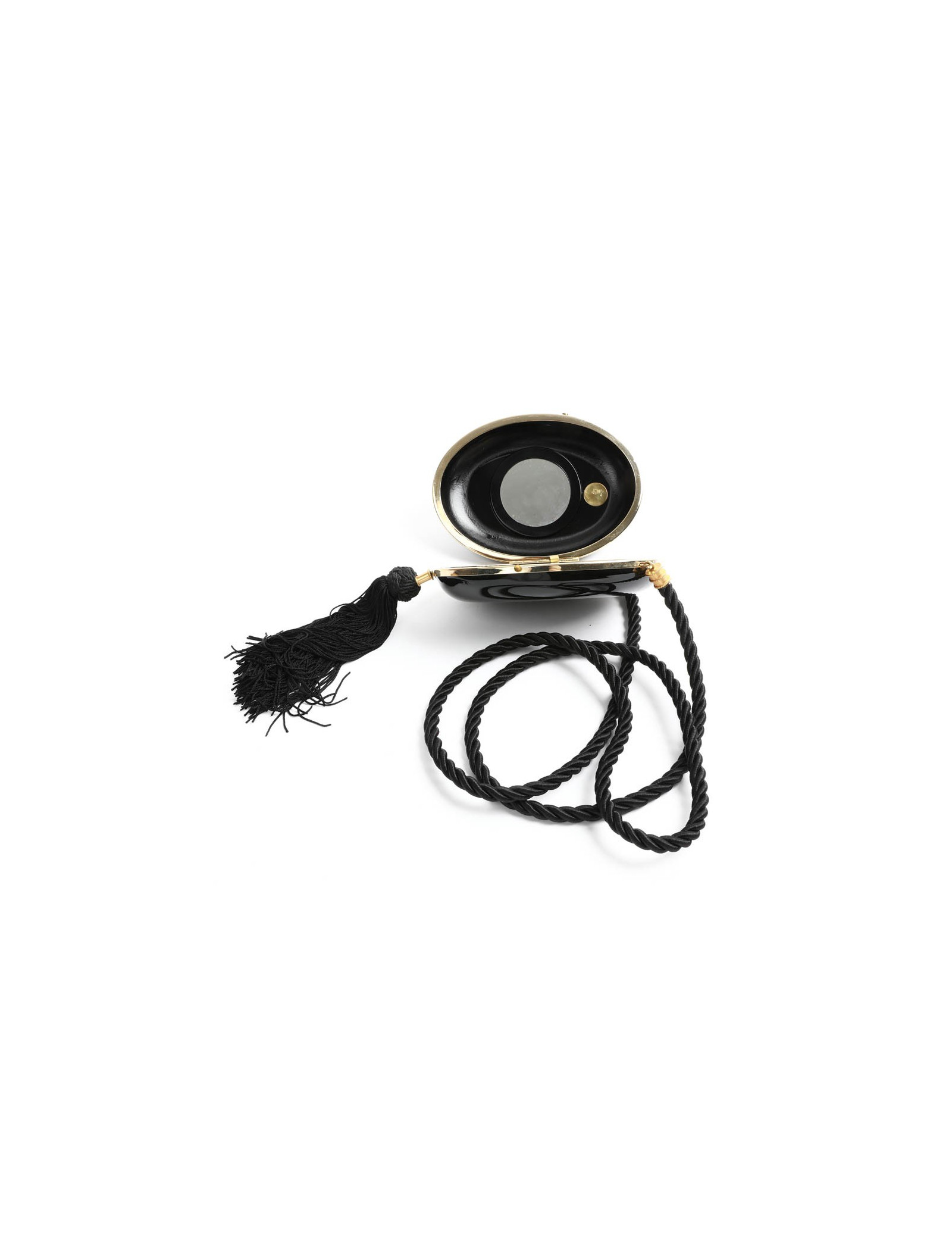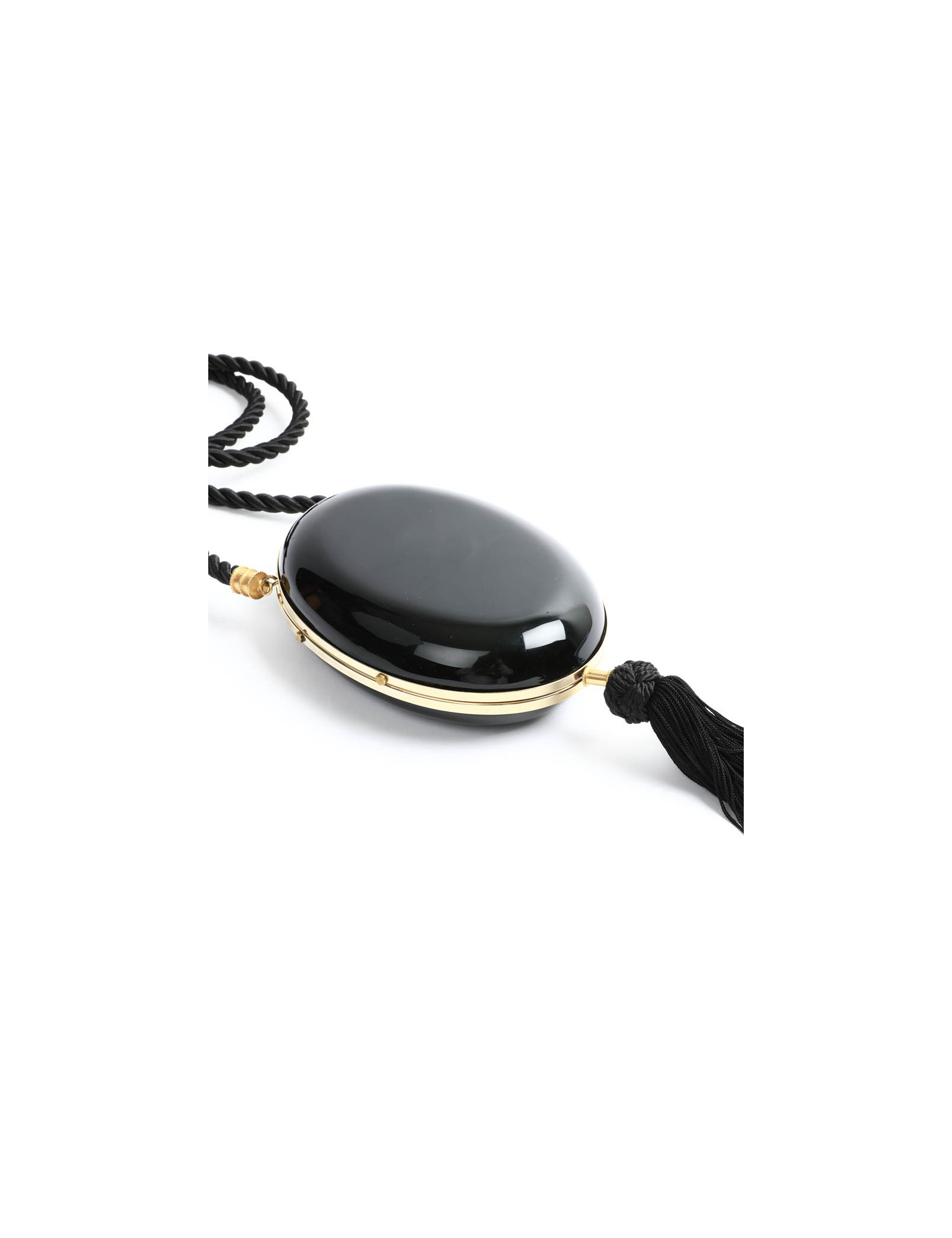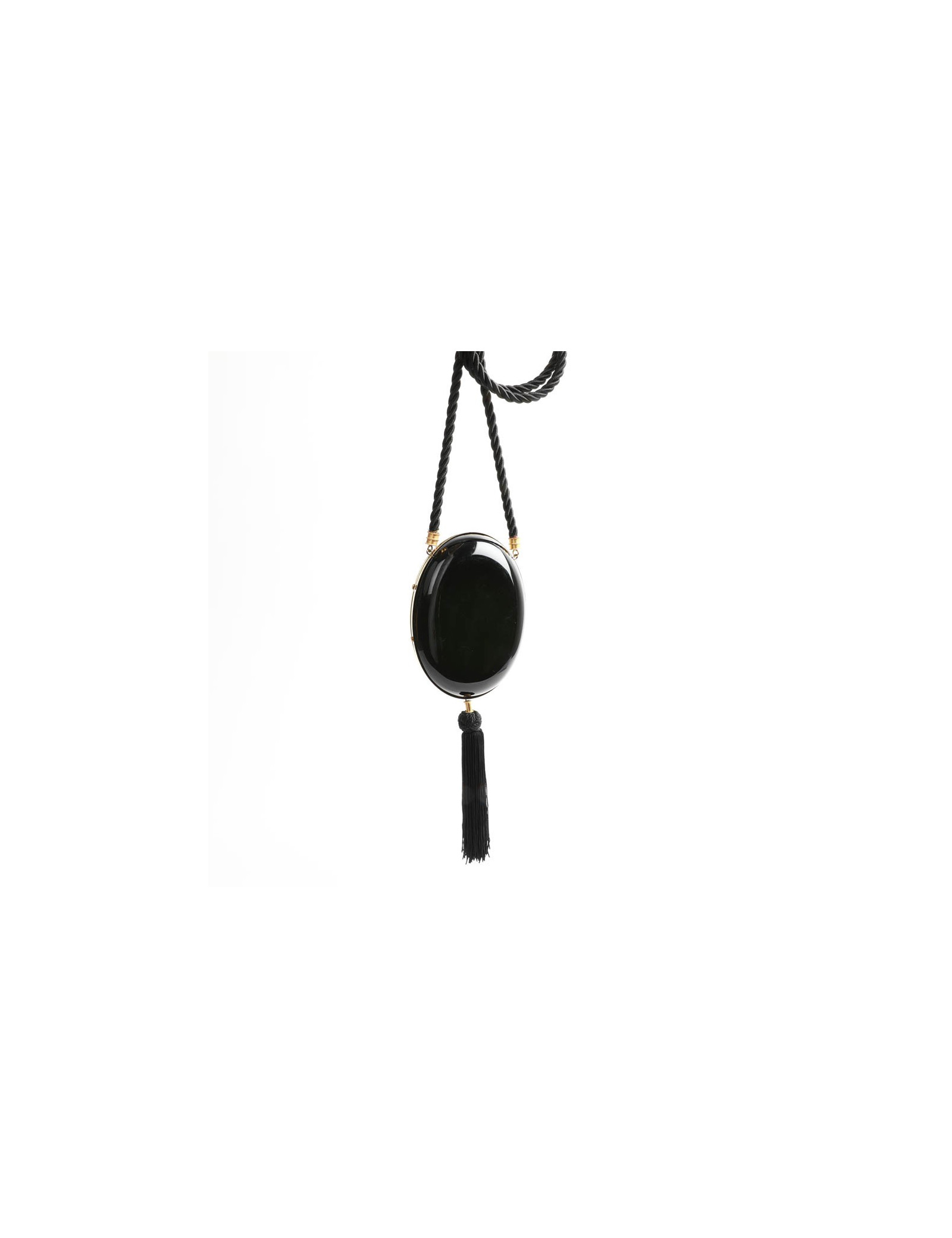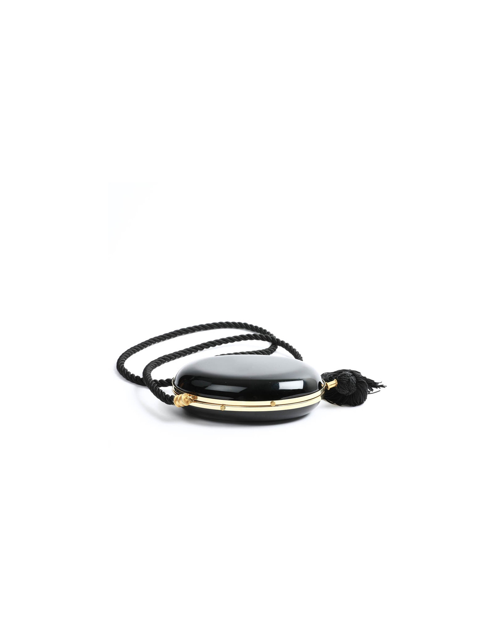 Ravissante minaudière en plexi noir se terminant par un pompon, typique des articles vintage YSL. Elle se porte à l'épaule ou croisée. En très bon état. La bijouterie est dorée.