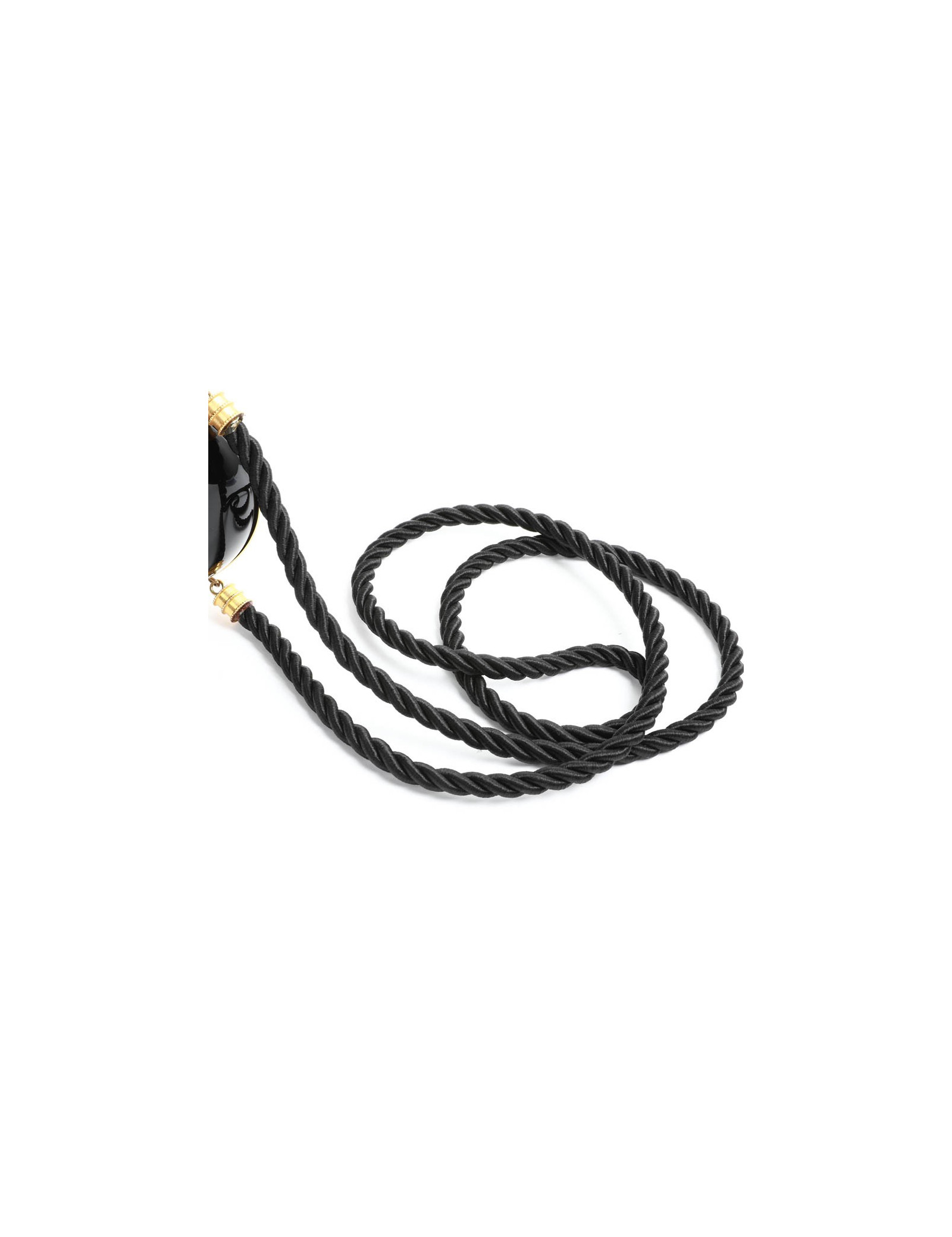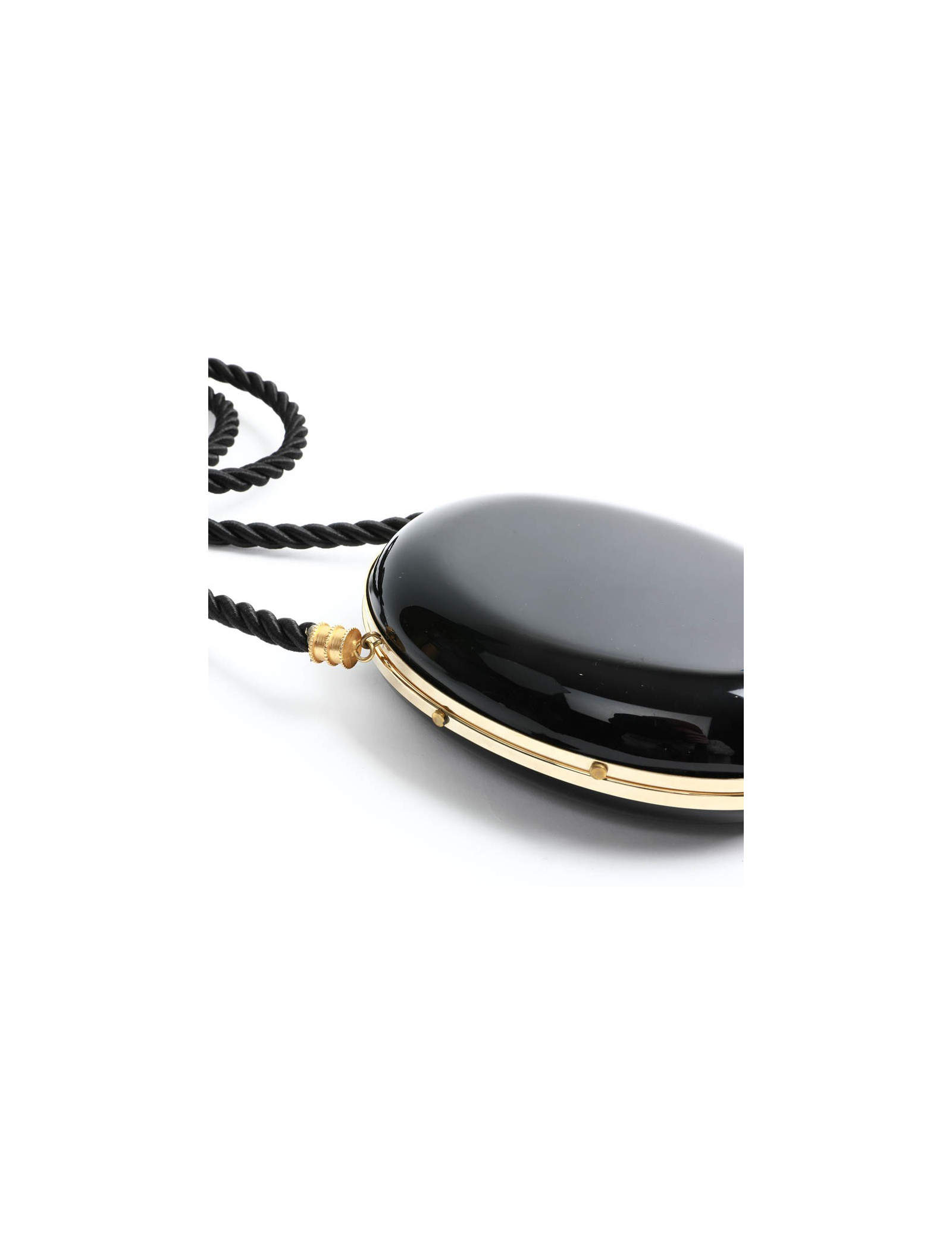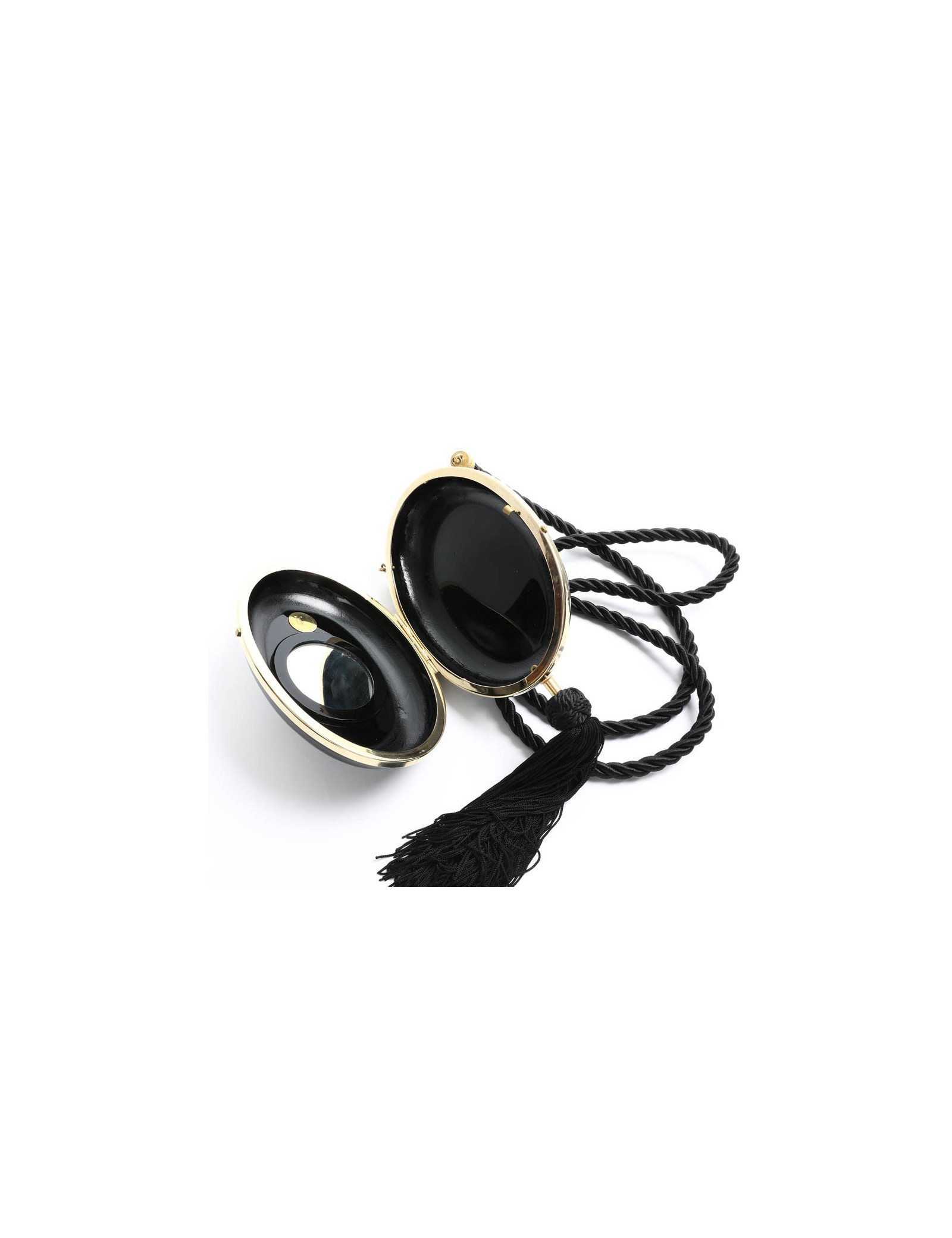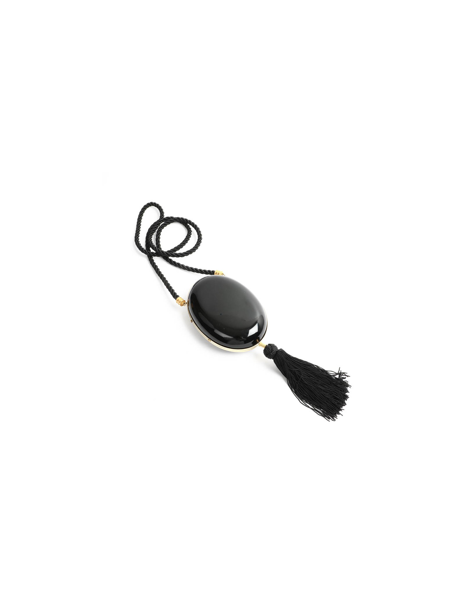 Ravissante minaudière en plexi noir se terminant par un pompon, typique des articles vintage YSL. Elle se porte à l'épaule ou croisée. En très bon état. La bijouterie est dorée.
