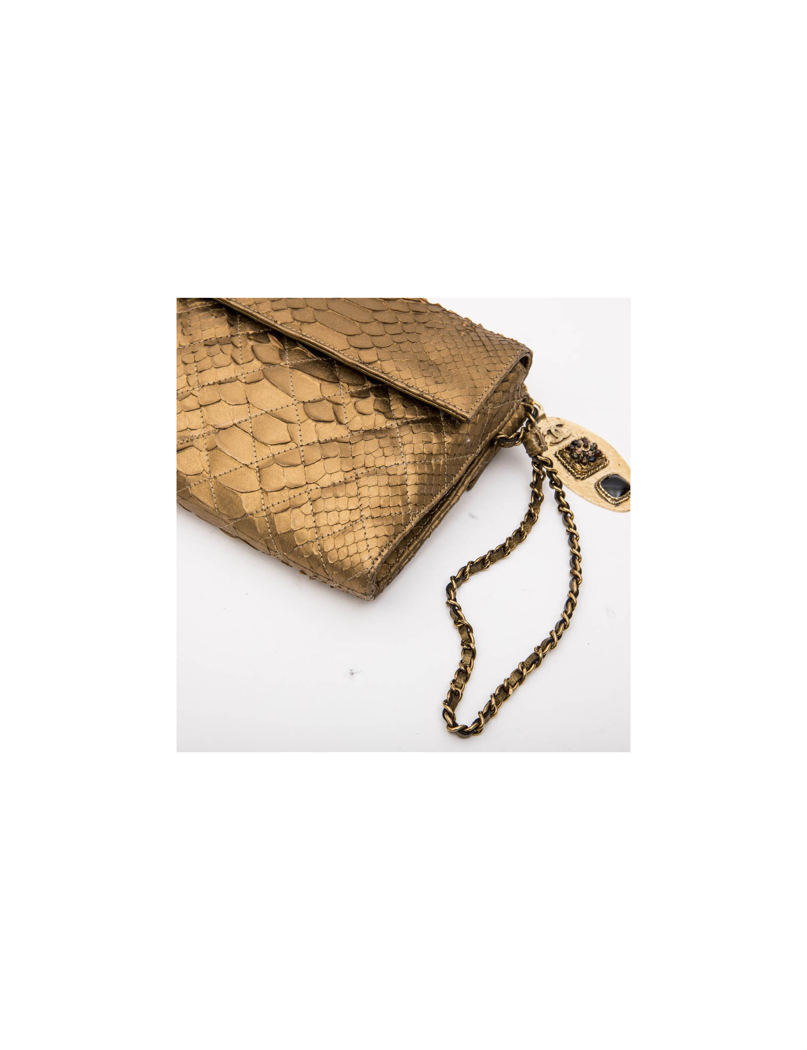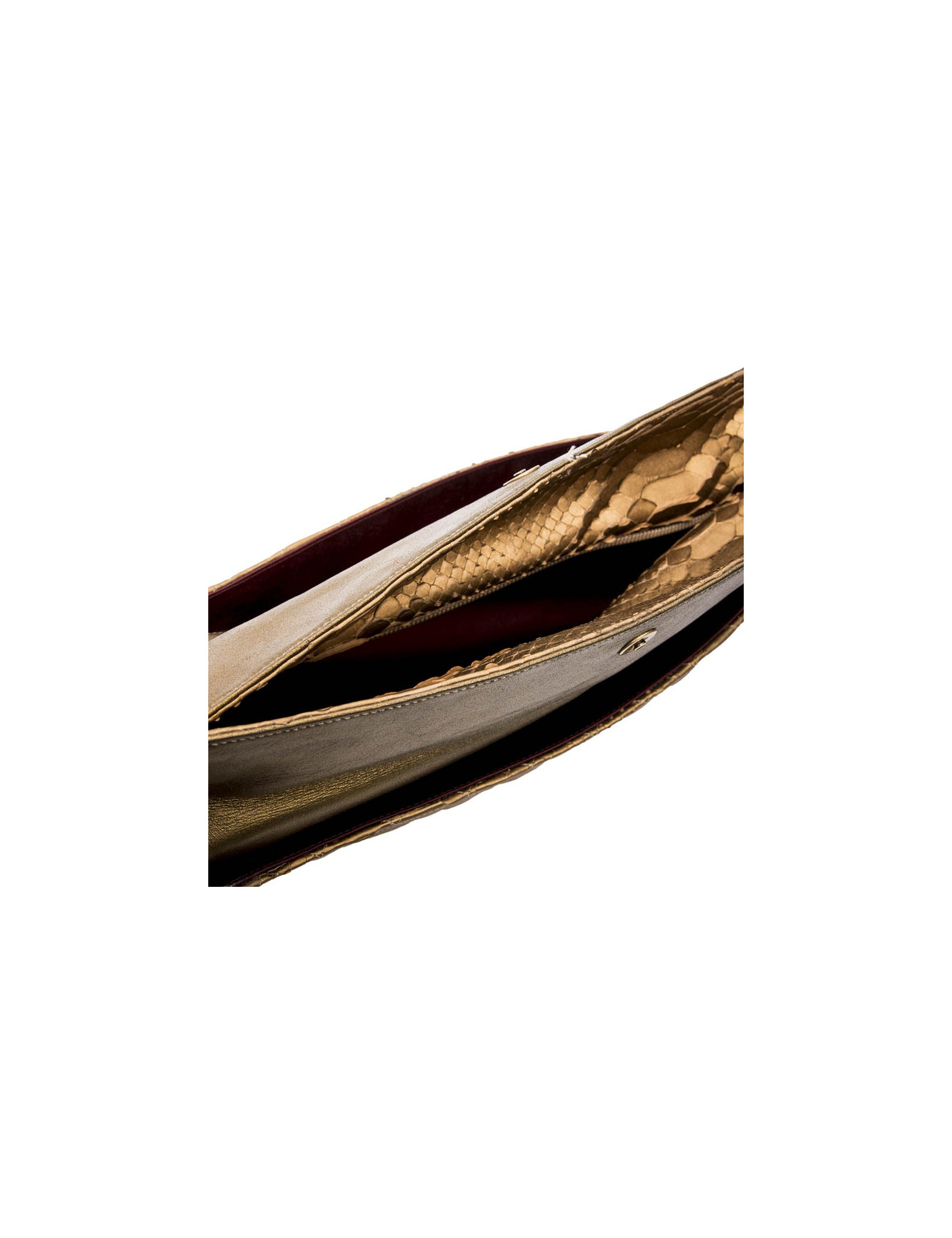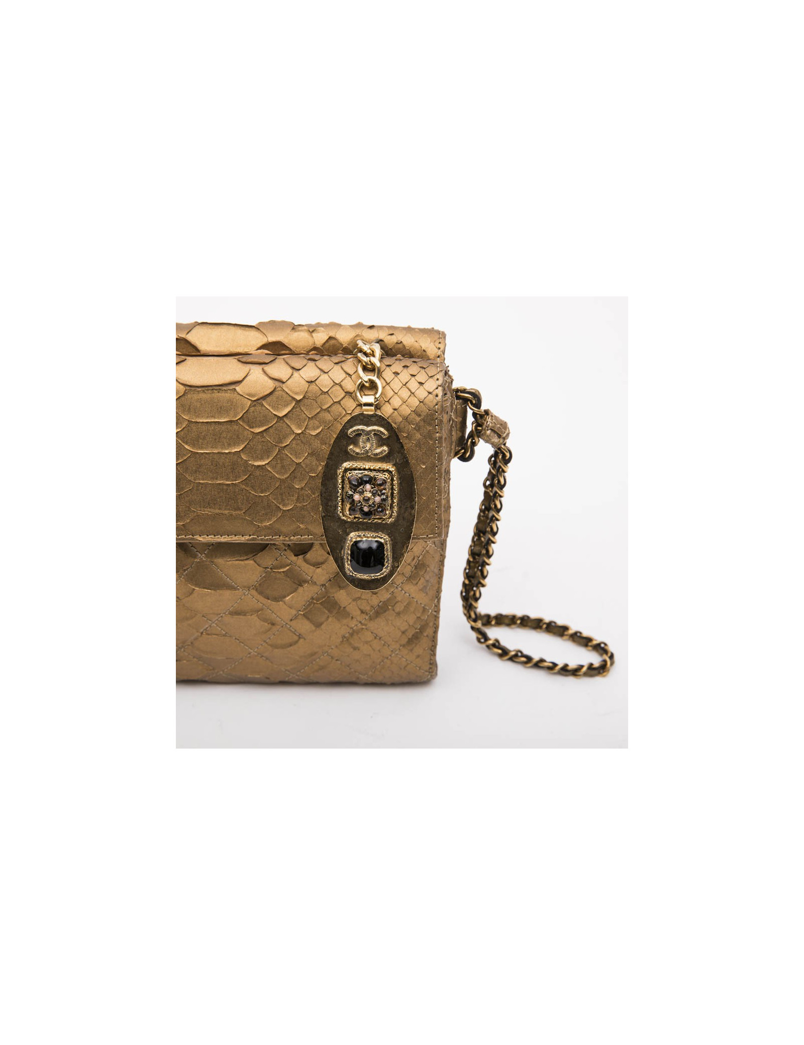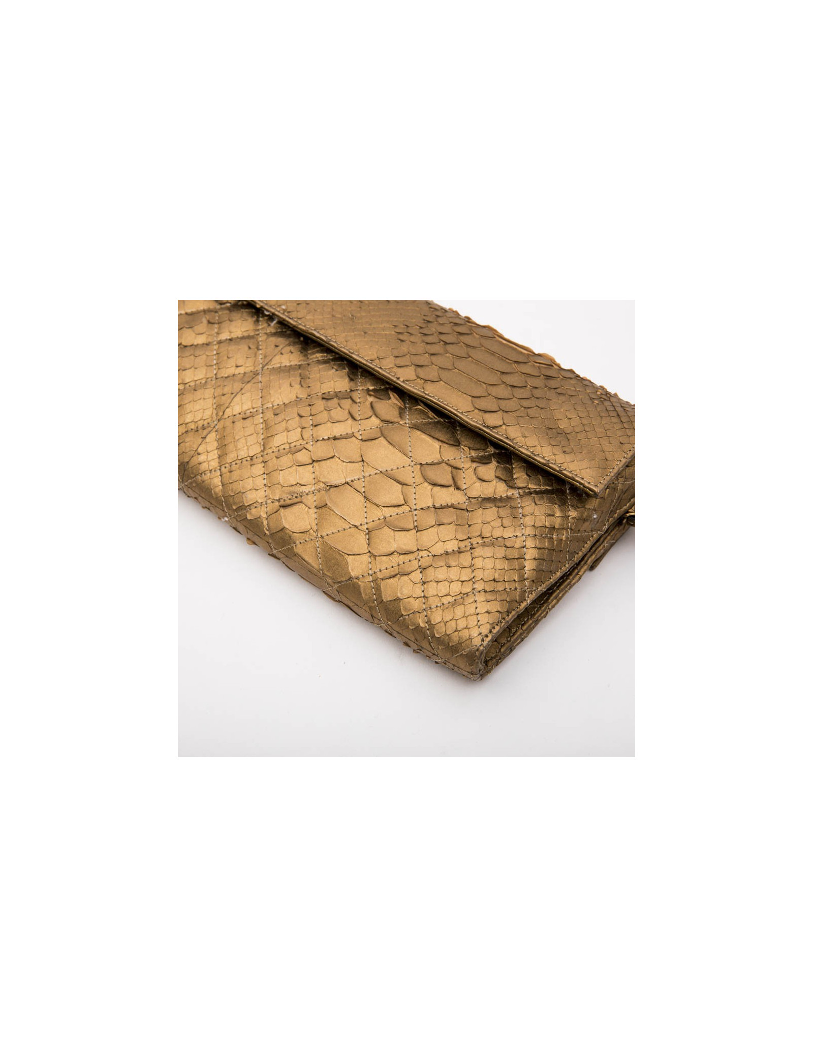 Rarrissime. Longue pochette Chanel en python or mat cuivré. L'intérieur est en satin duchesse bordeaux avec 3 soufflets dont un zippé. La bijouterie est en laiton doré.