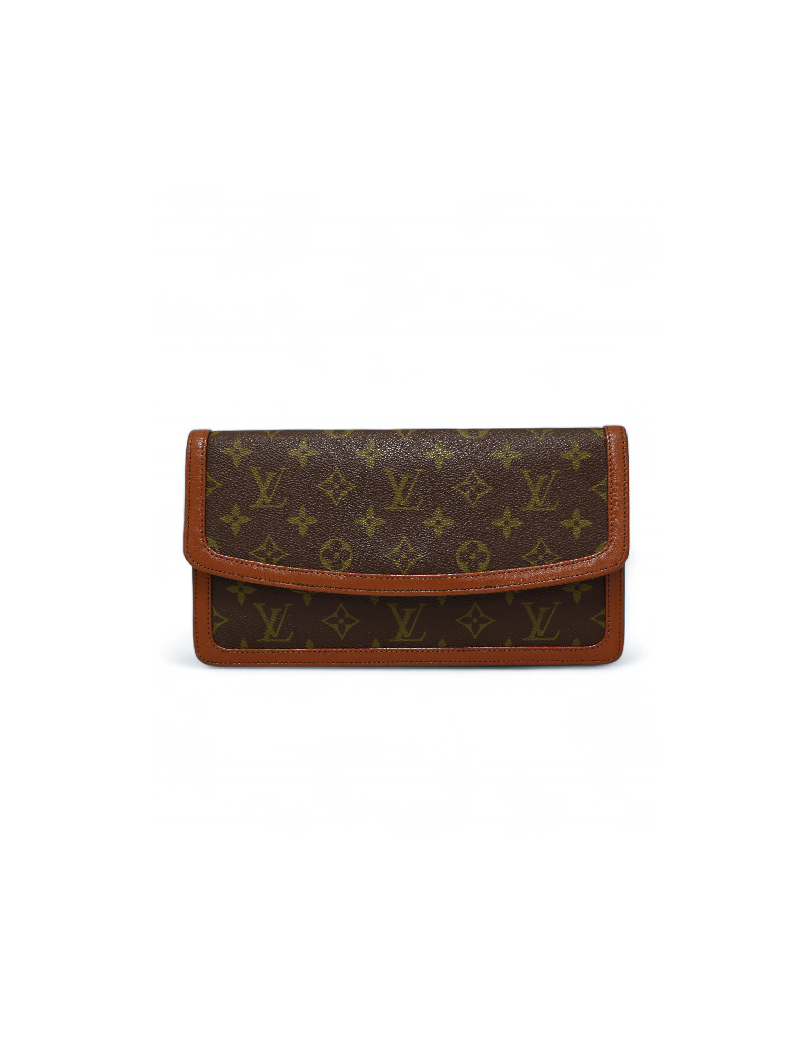 Détails : pochette vintage en toile enduite Monogram gansée de cuir de vache marron. Ouverture par un rabat fermé par un bouton pression. A l'intérieur une pochette zippée. Coins légèrement usés, intérieur propre.