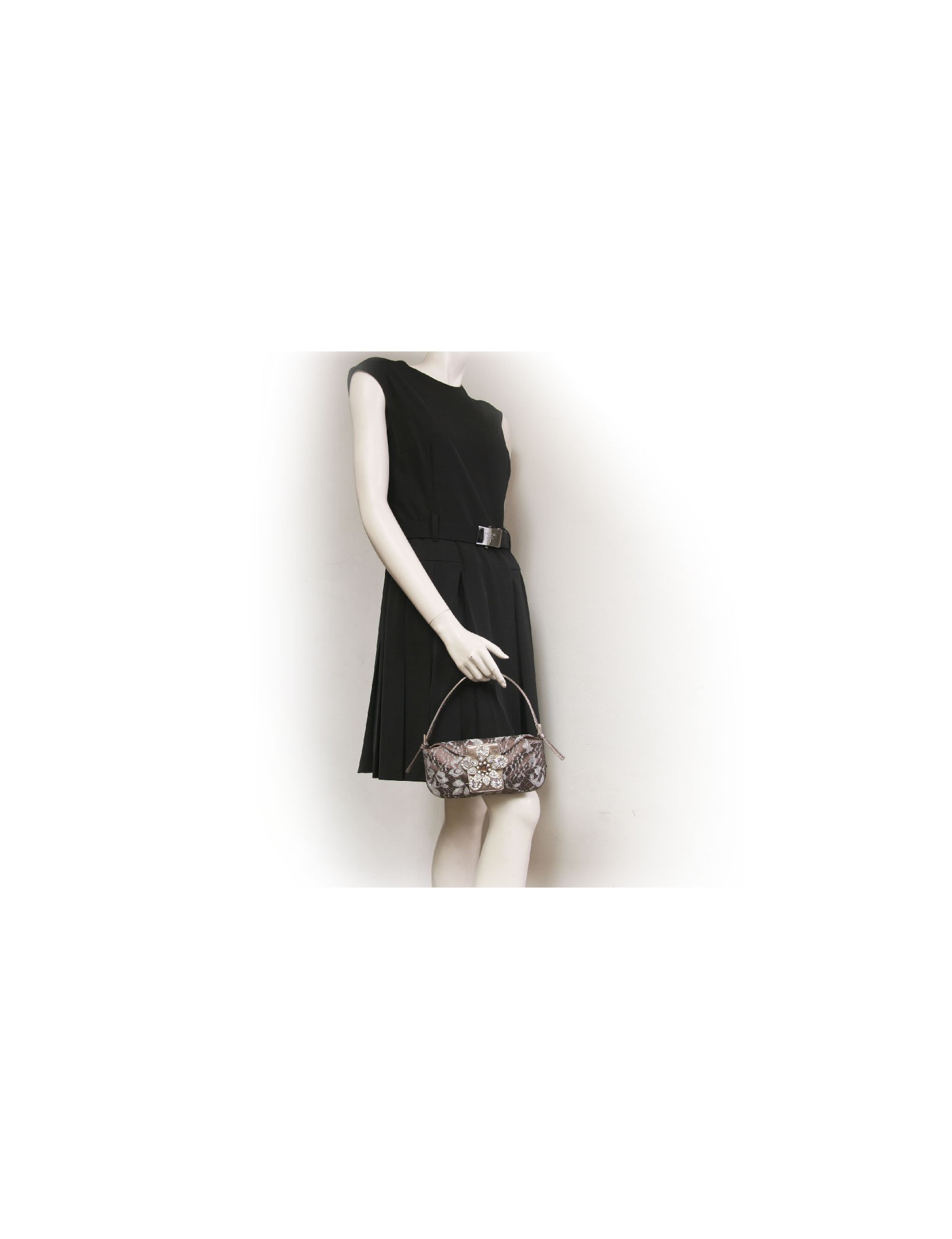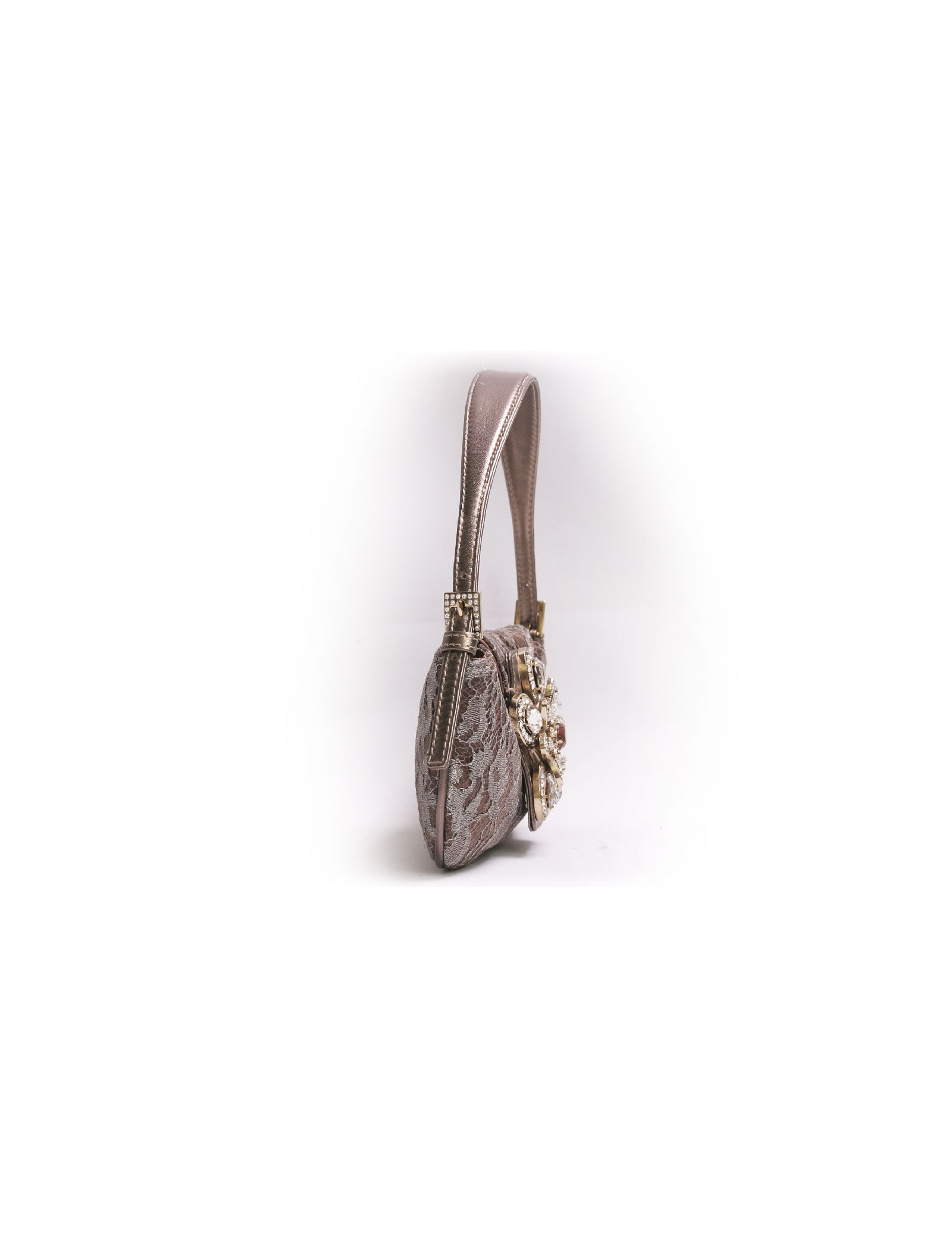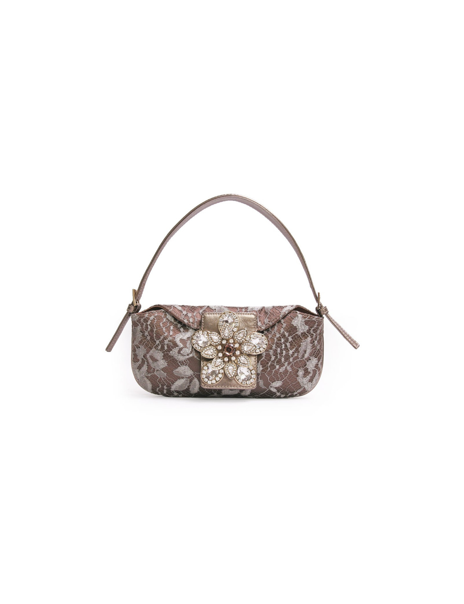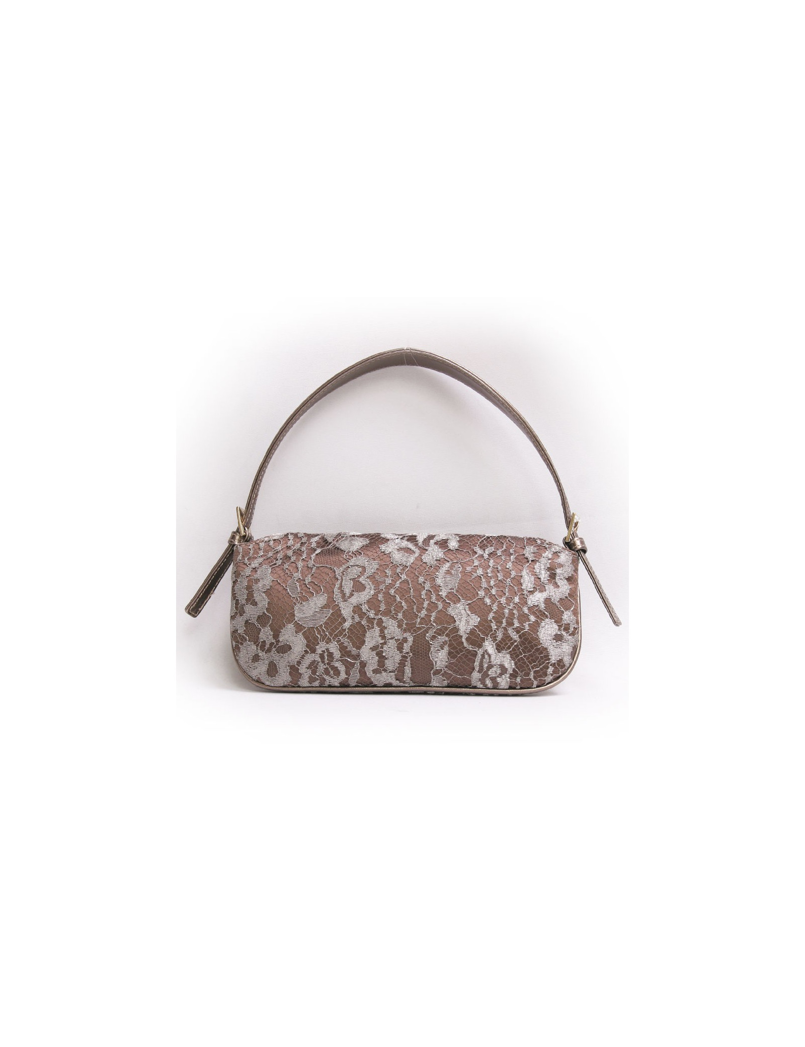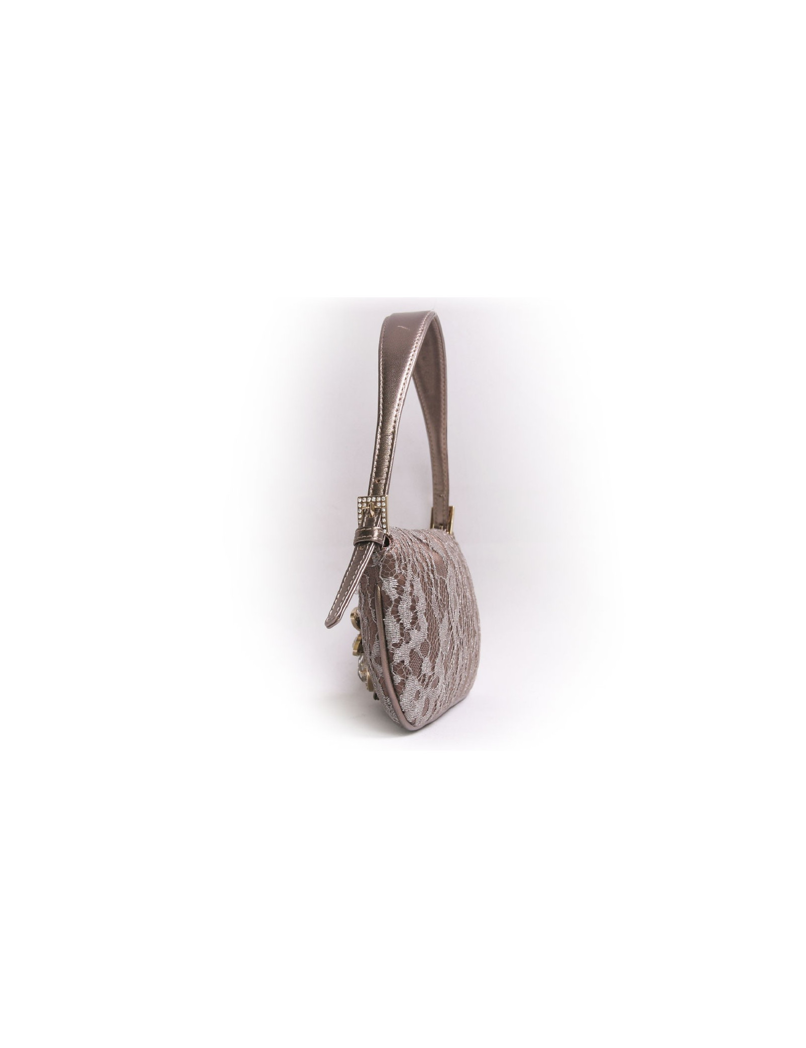 Mini sac du soir Valentino en satin et dentelle bronze. Fermeture par pression. Le fermoir est en forme de fleurs avec des pierres fantaisies. Il se porte au bras ou à l'épaule à l'aide d'une anse réglable et amovile en cuir doré.