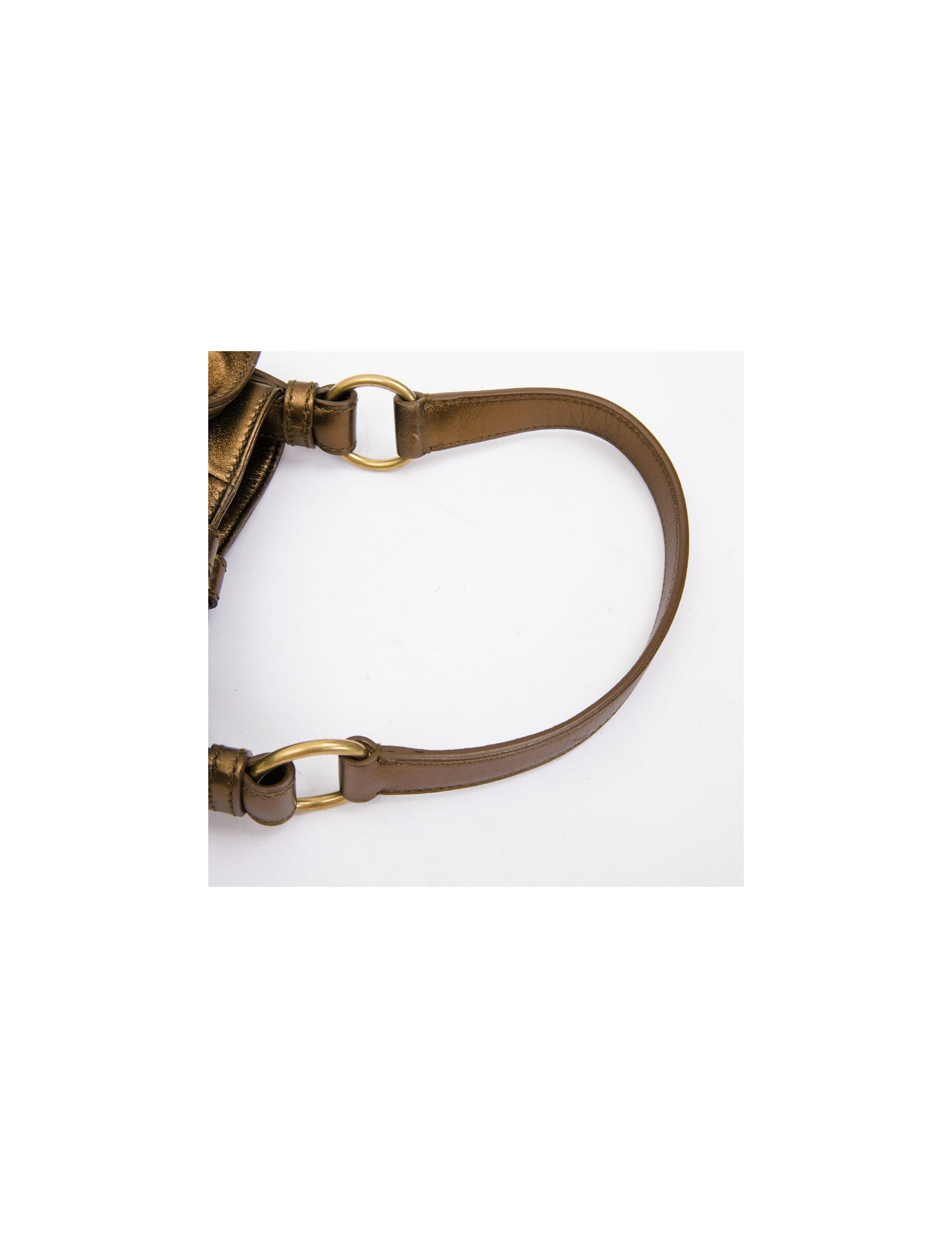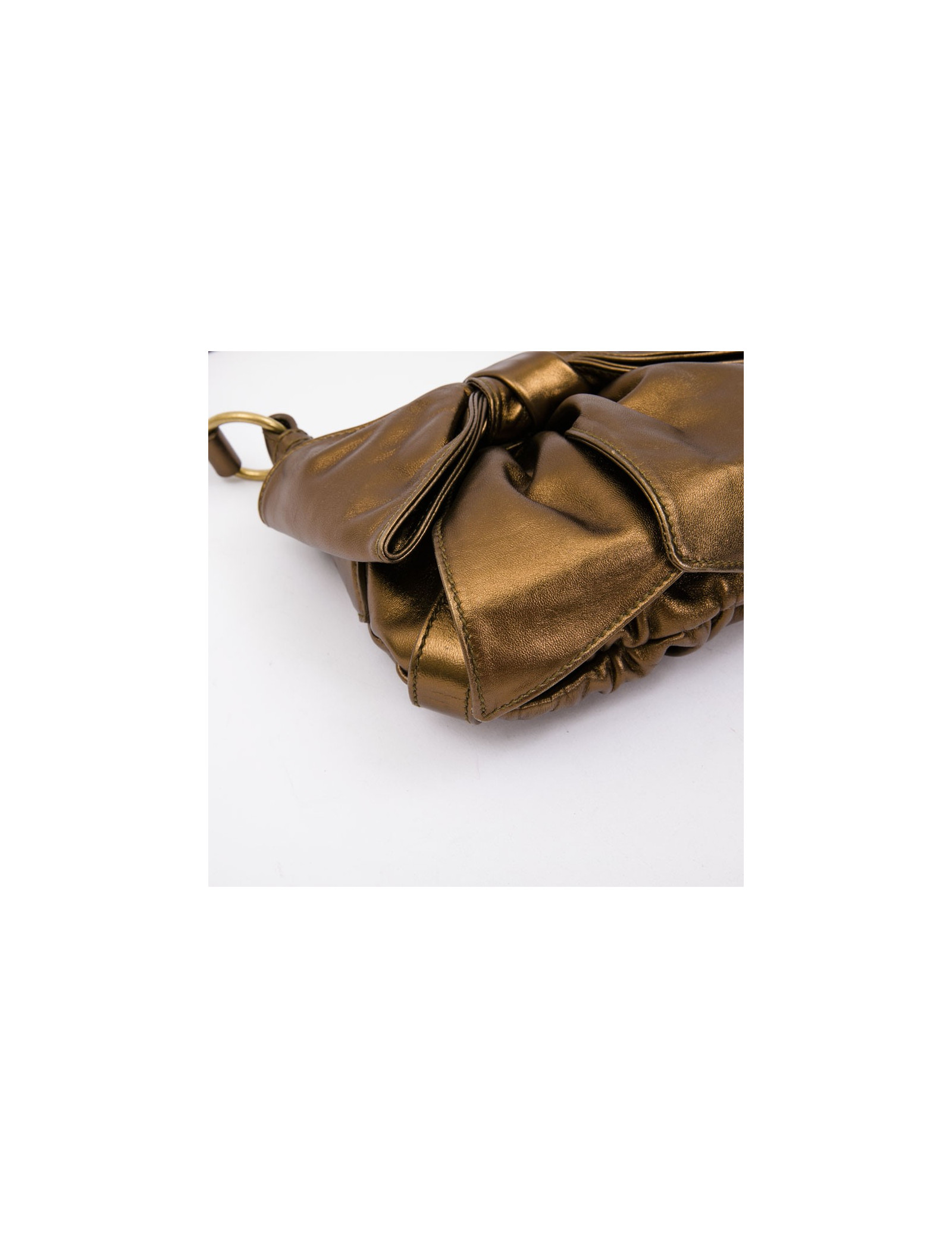Bijouterie en laiton dorée. Noeud en cuir à l'avant du sac.