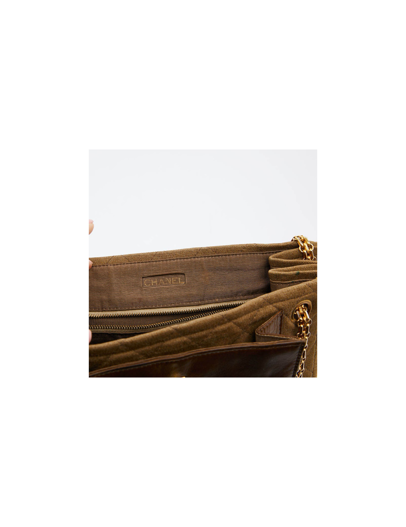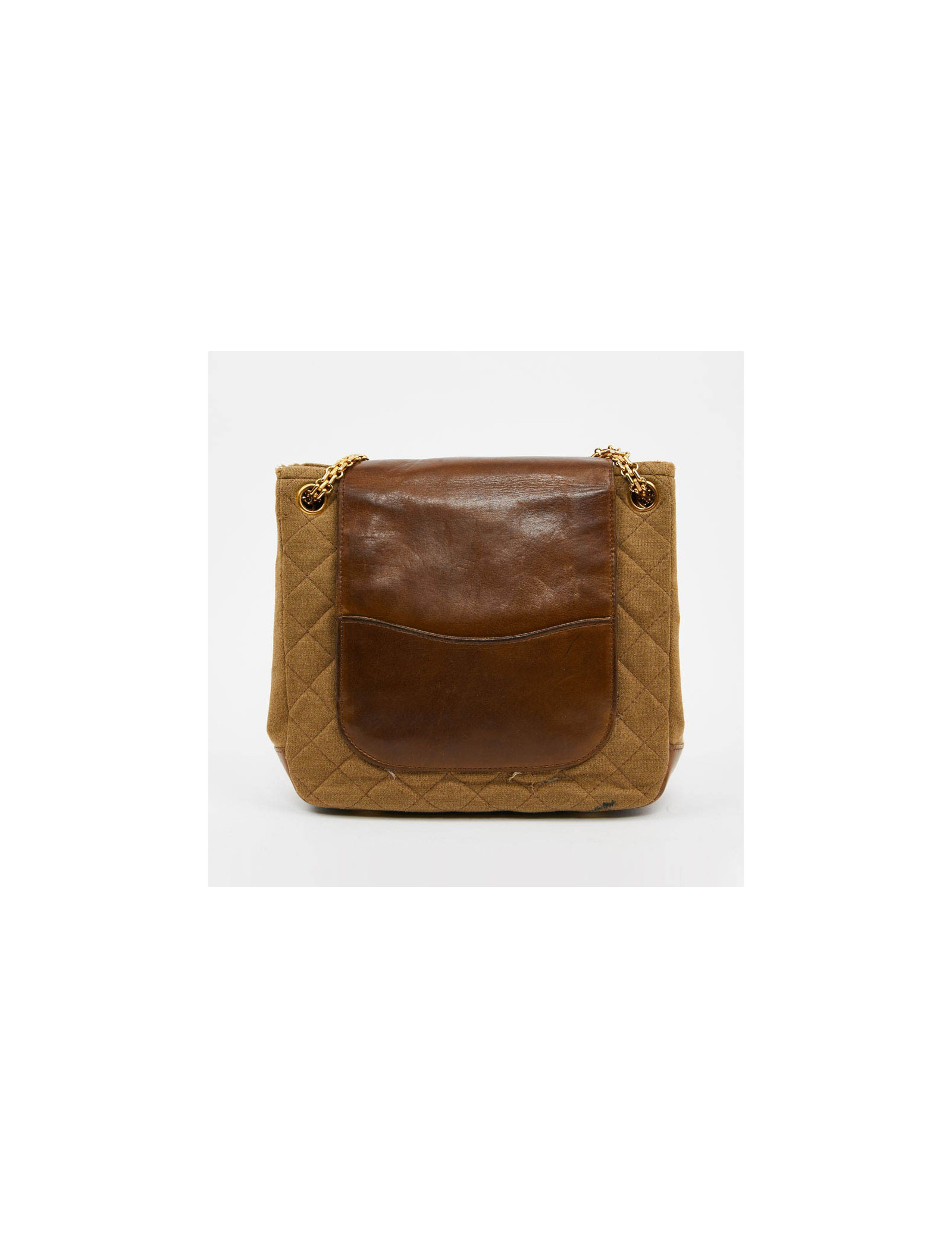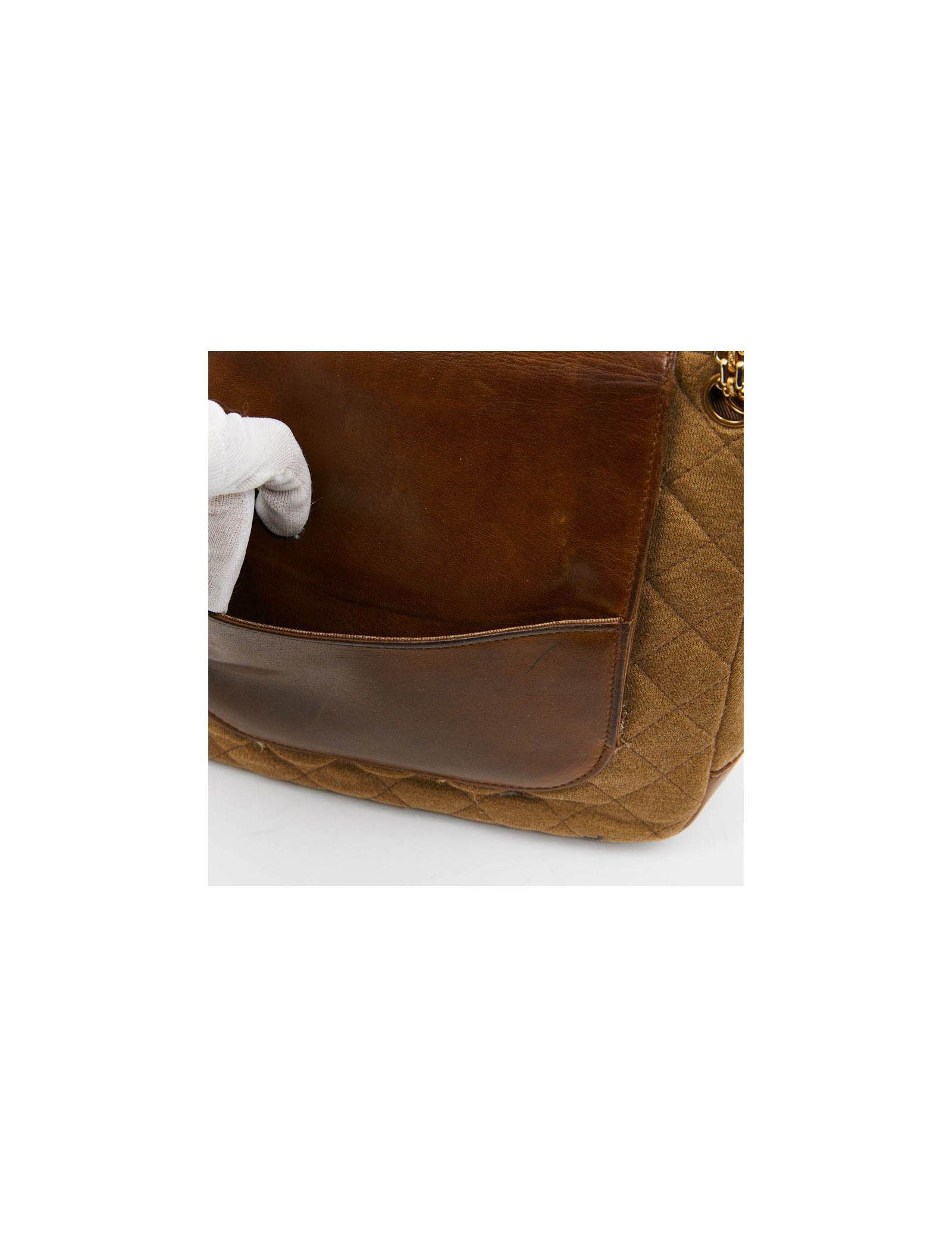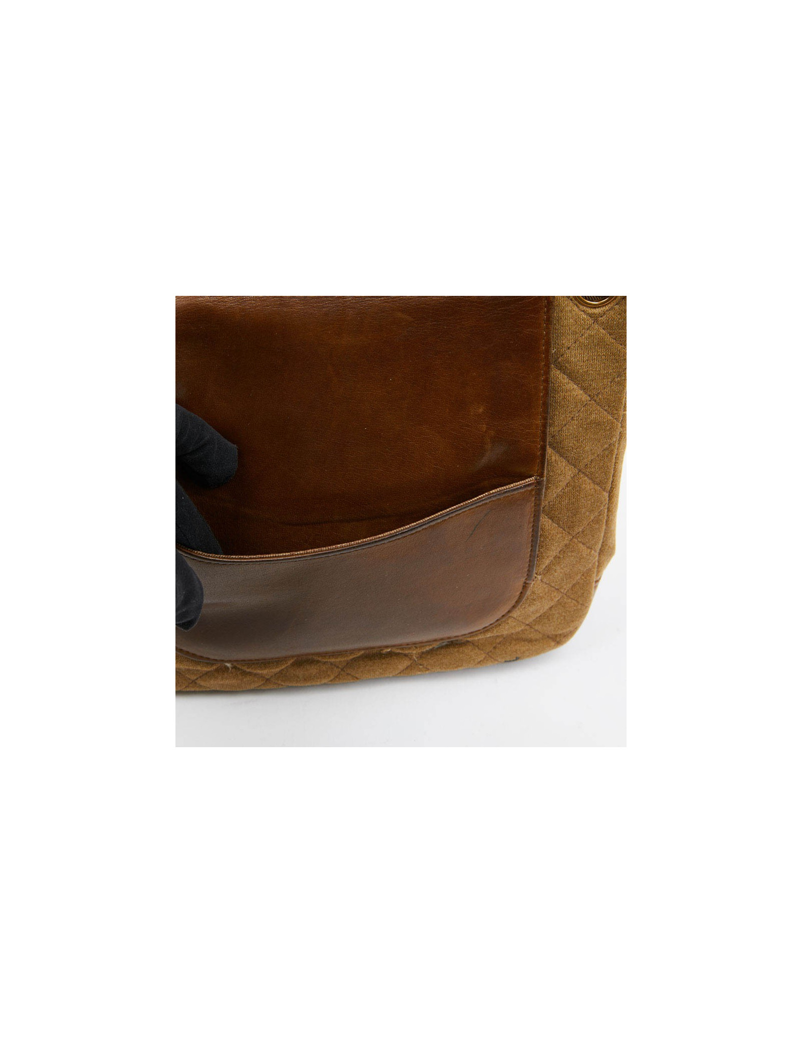 Ce sac CHANEL est en jersey matelassé et cuir marron. Ouverture par rabat. La bijouterie est en métal doré. Le fermoir carré tourne sur lui même. Il se porte à l'épaule ou en croisé. Le sac est en état correct : Le tissu a des accrocs à divers endroits sur le dessus et une marque noire est visible sur le jersey à l'arrière. Il a une poche plate à l'avant du sac sur la pièce en cuir, à l'intérieur plusieurs poches dont une zippée.