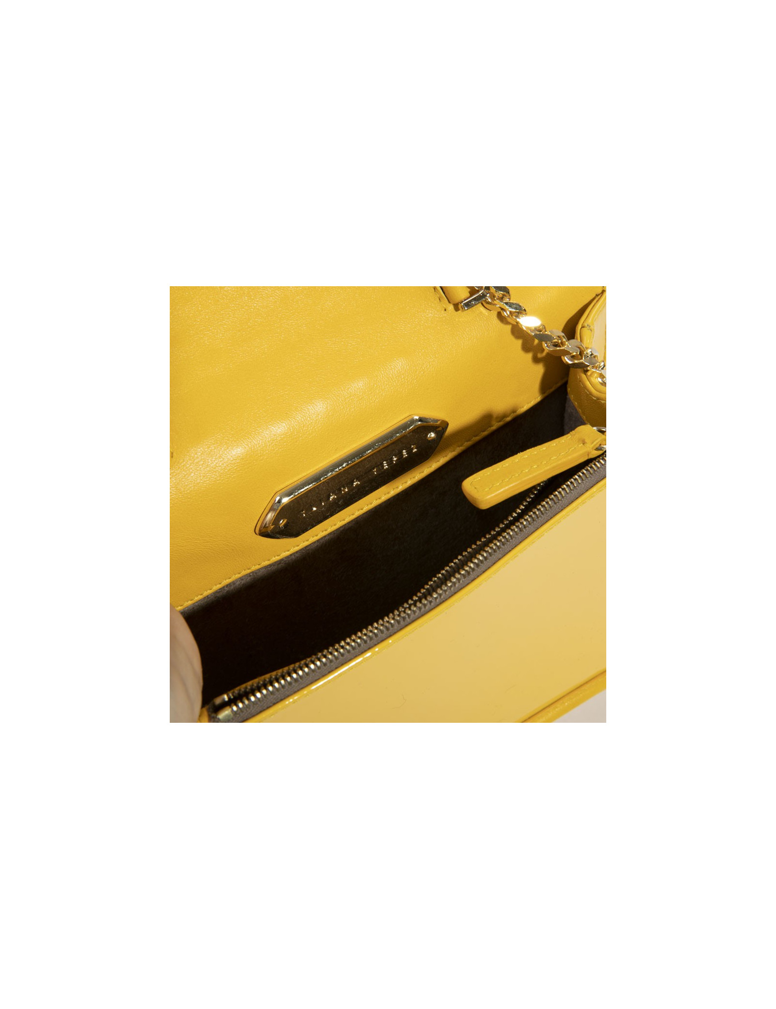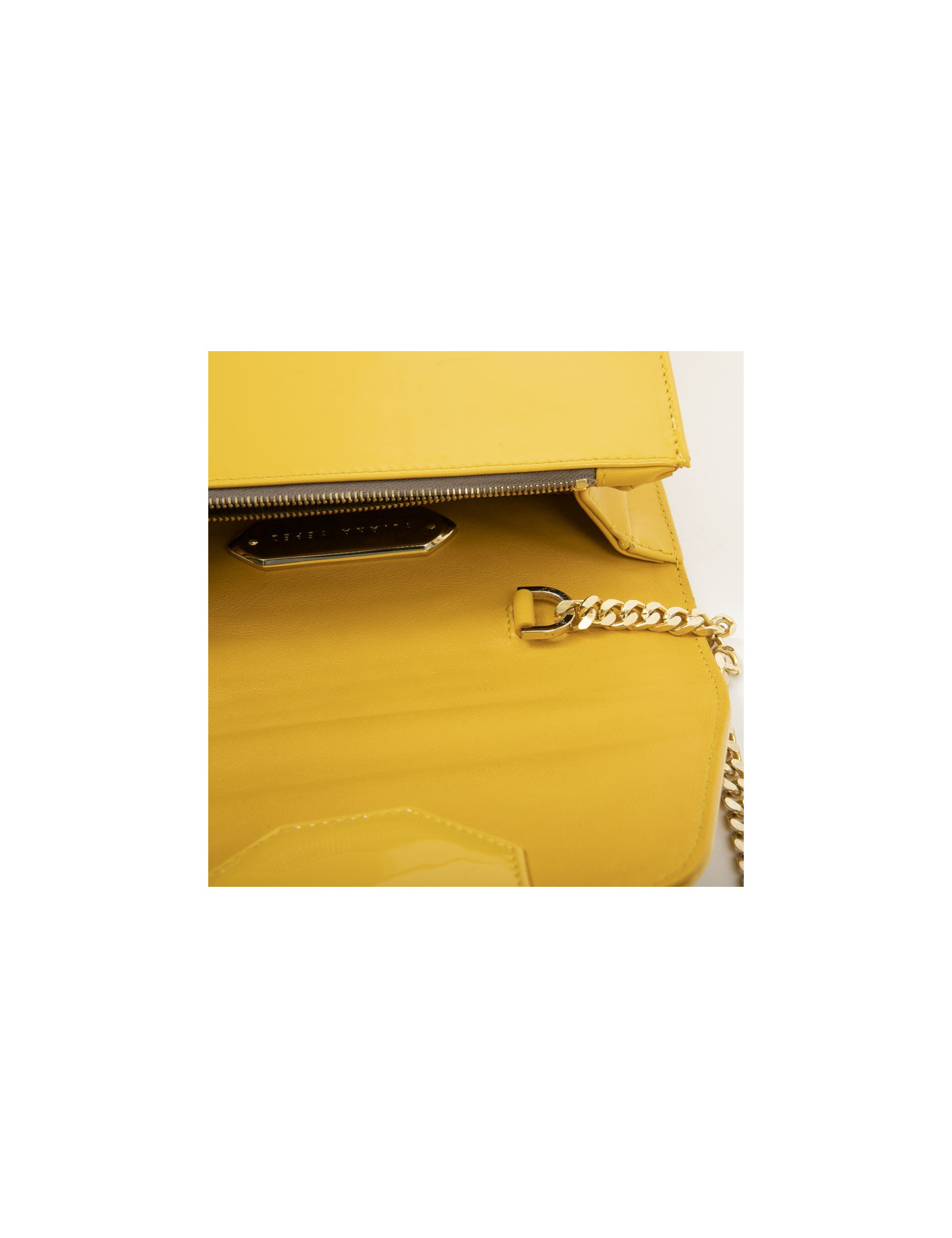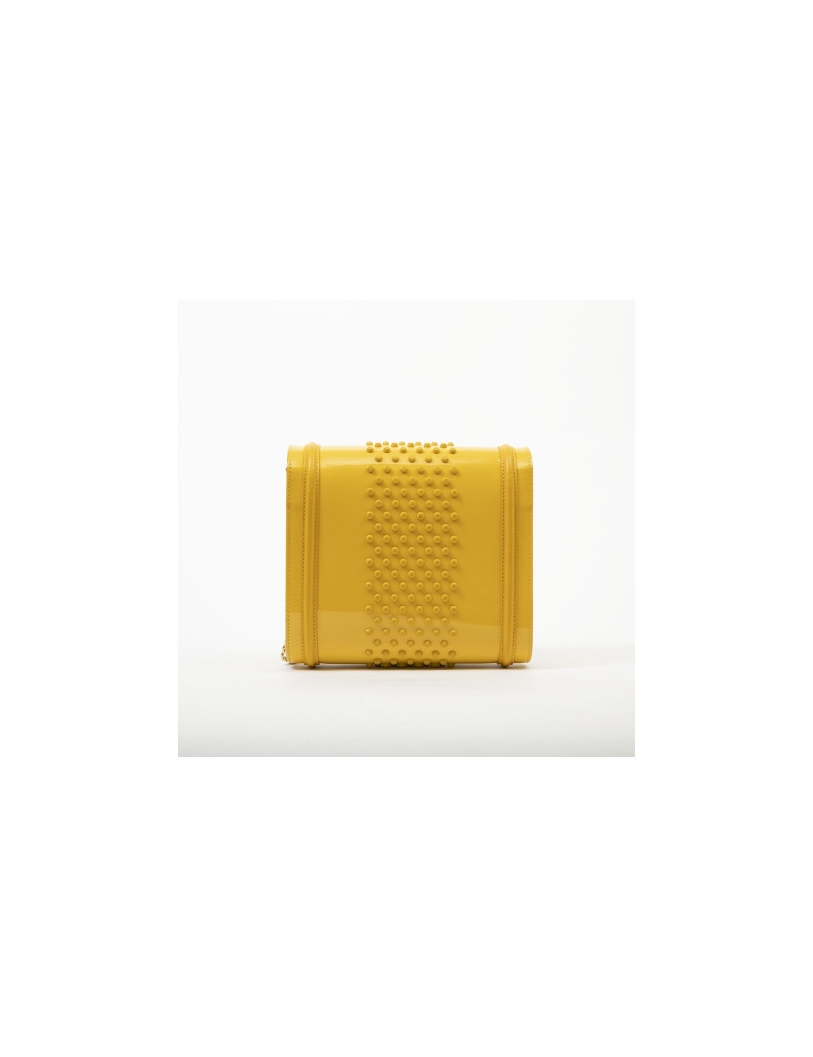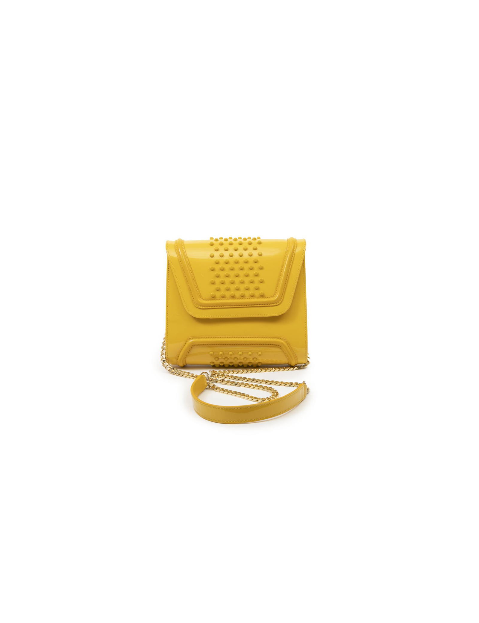 Sac Yliana Yepez en cuir jaune verni à picots. Doublure intérieure en feutrine marron clair. Une poche plate zippée. Anse bandoulière en métal doré.