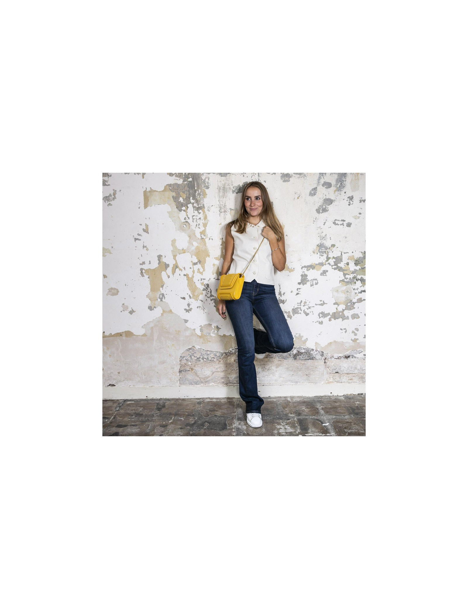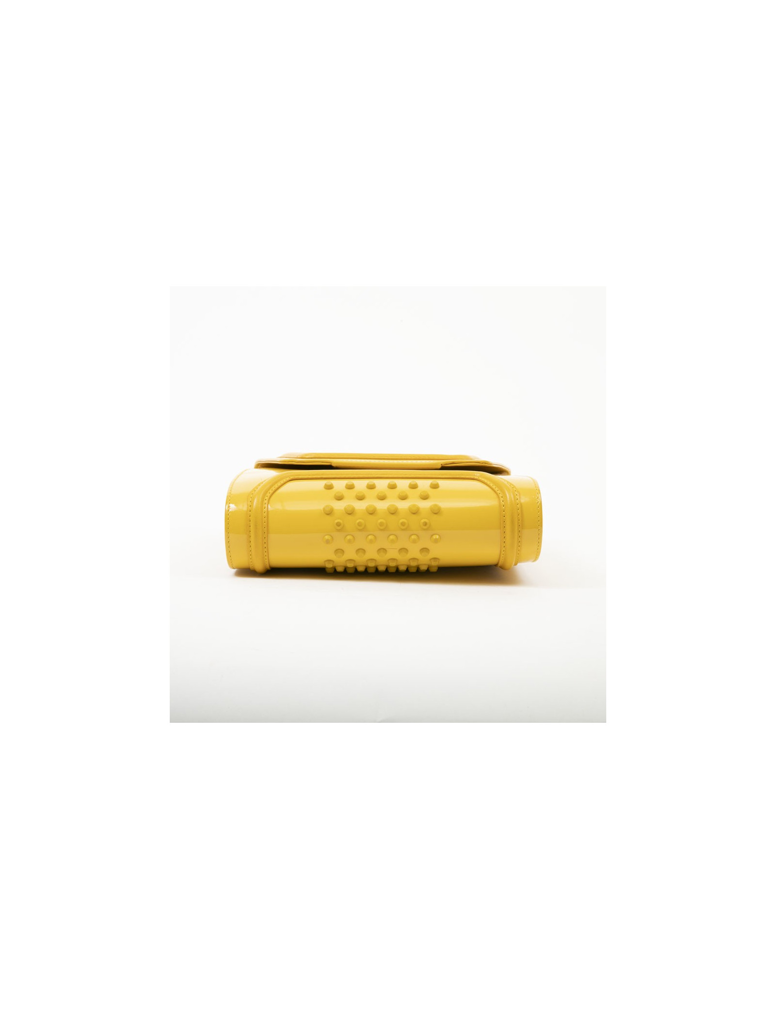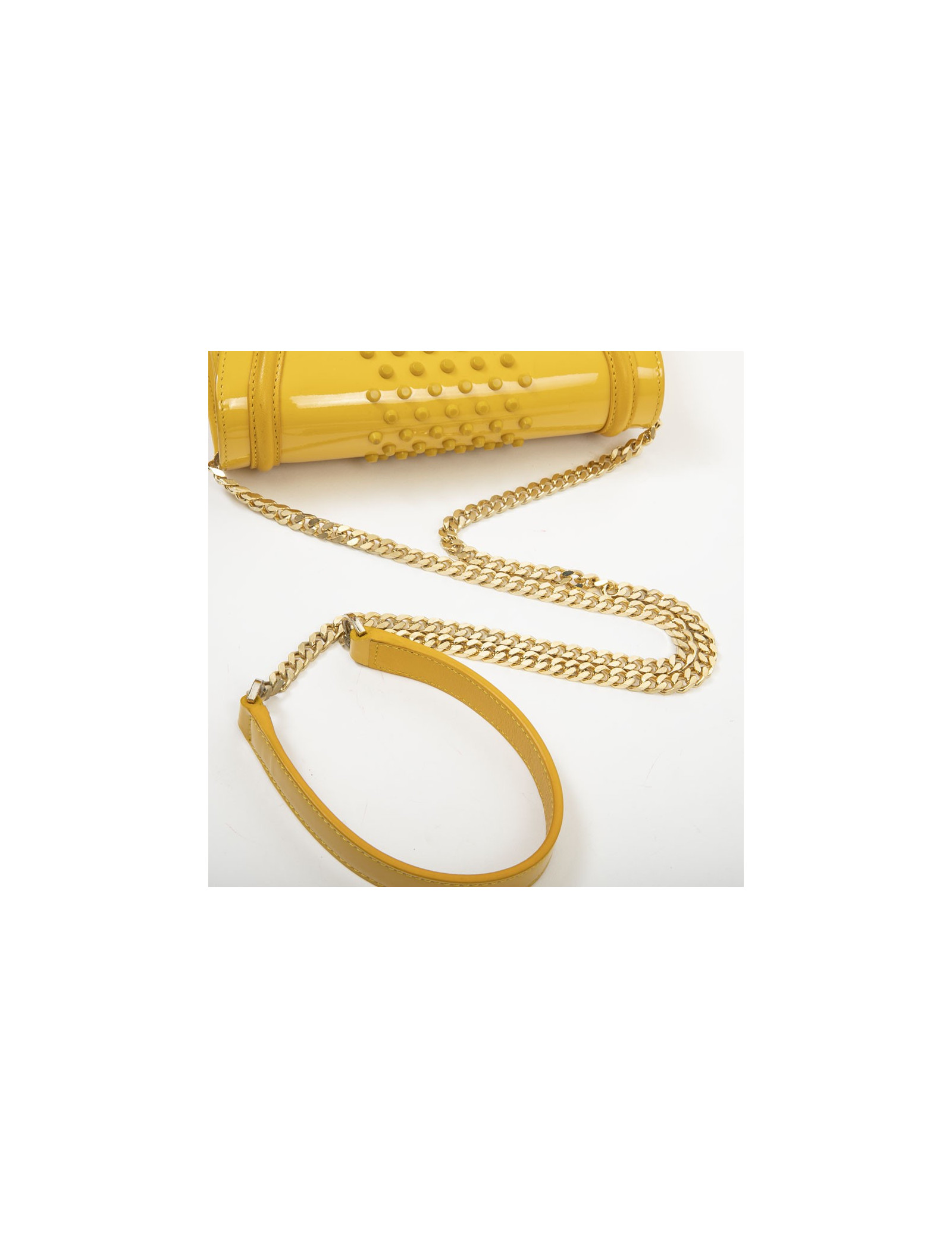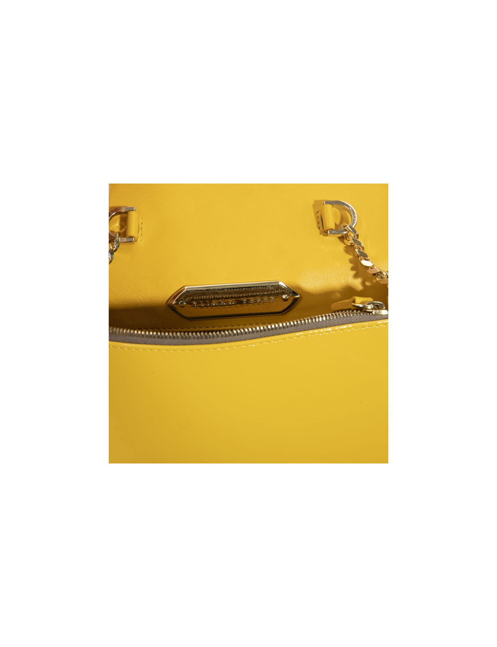 Sac Yliana Yepez en cuir jaune verni à picots. Doublure intérieure en feutrine marron clair. Une poche plate zippée. Anse bandoulière en métal doré.