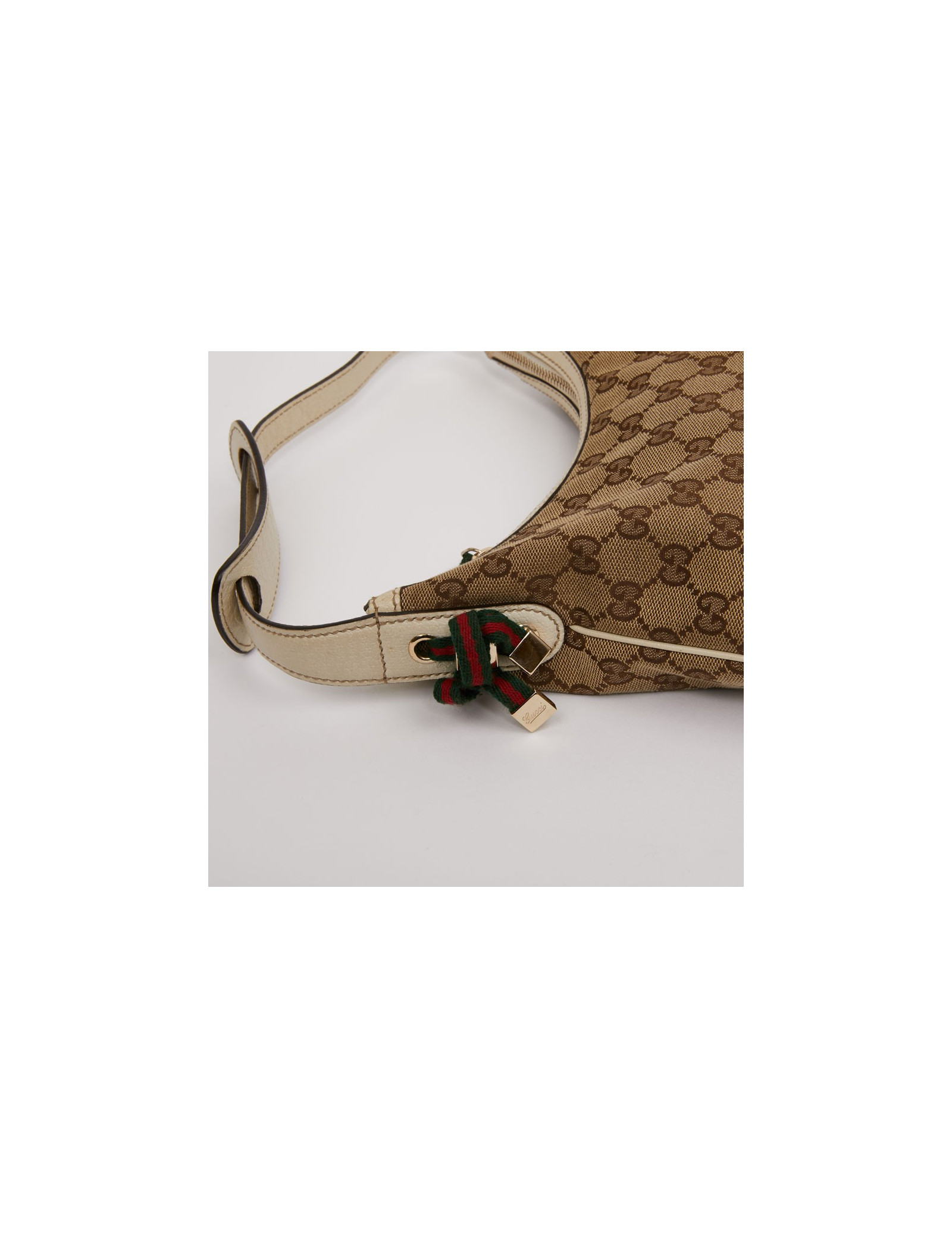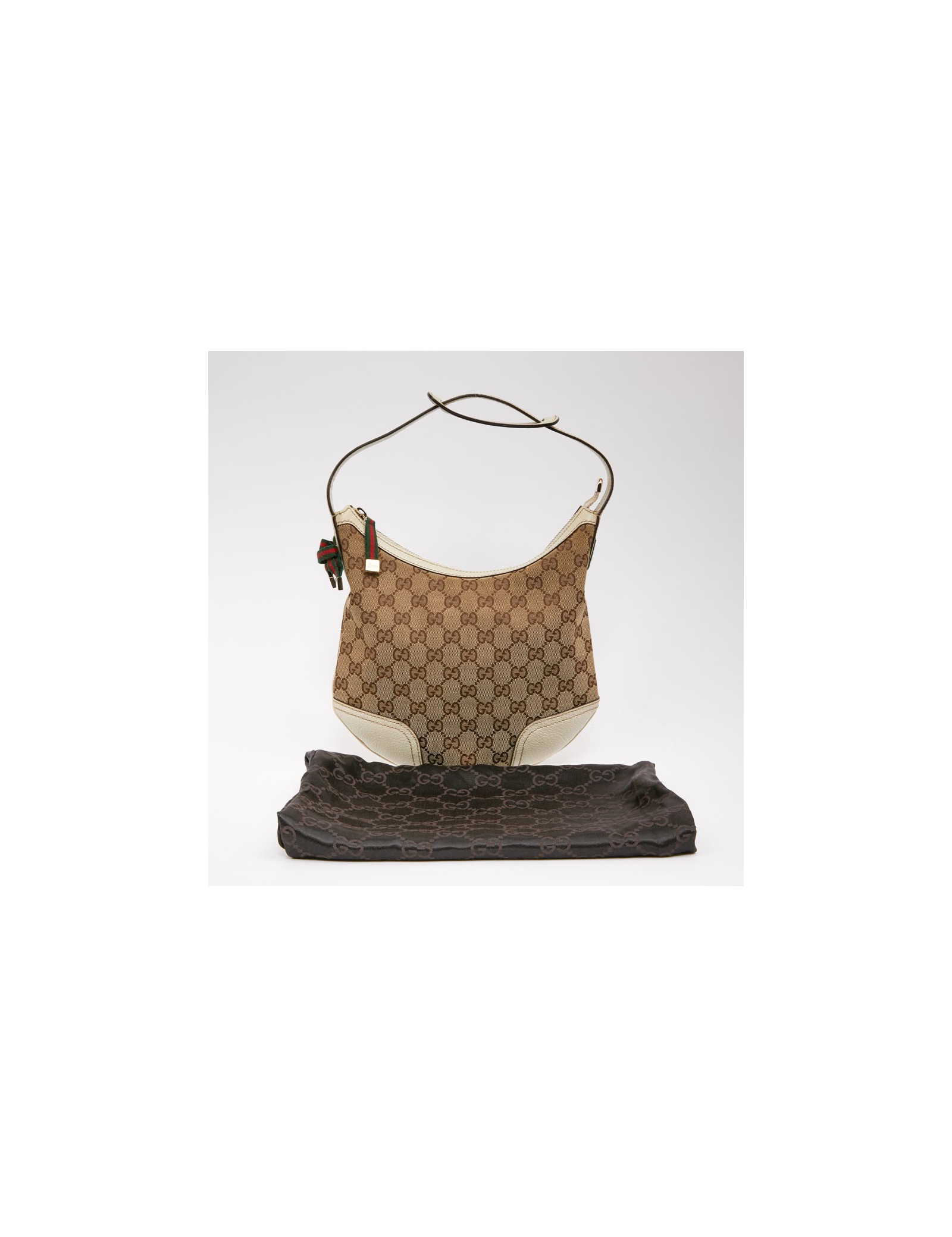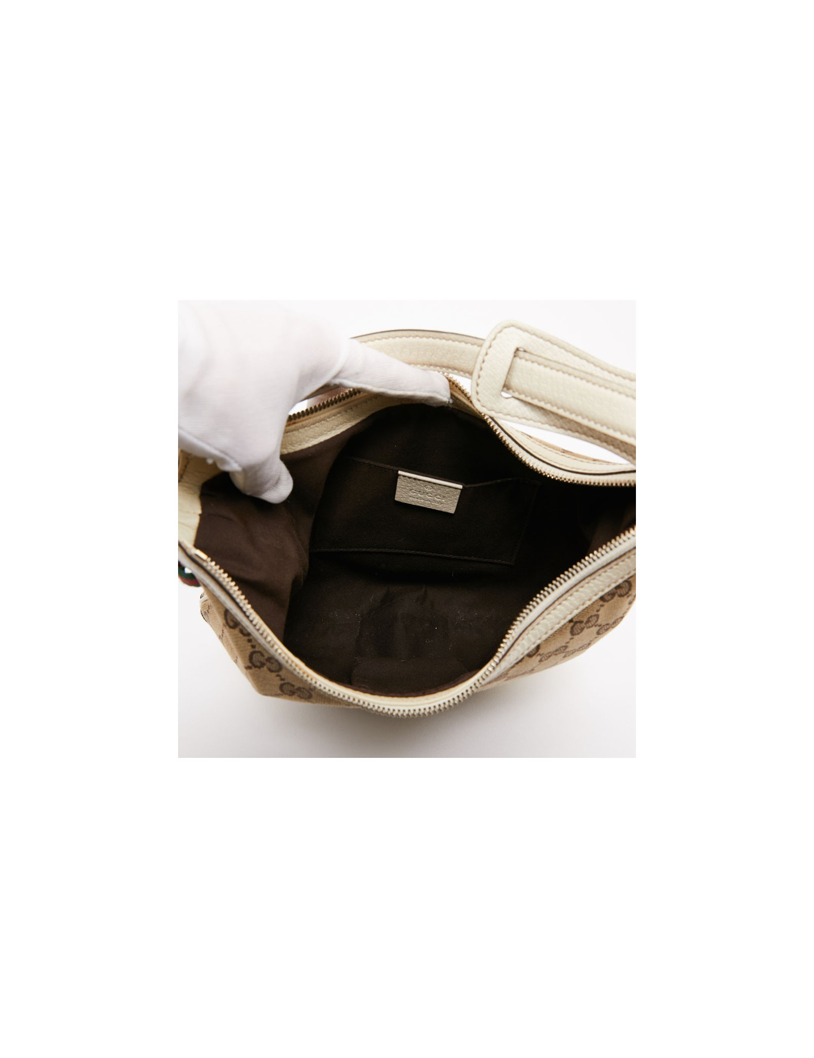 Très joli sac à main GUCCI d'occasion. Il est en toile monogramme et cuir beige. Il se porte à l'épaule grâce à son anse en cuir. L'intérieur est en tissu marron, avec une petite poche plate et une poche pour smartphone. Il a un noeud bande web (vert et rouge) sur le côté. Il est en parfait état, aucune usure des coins.