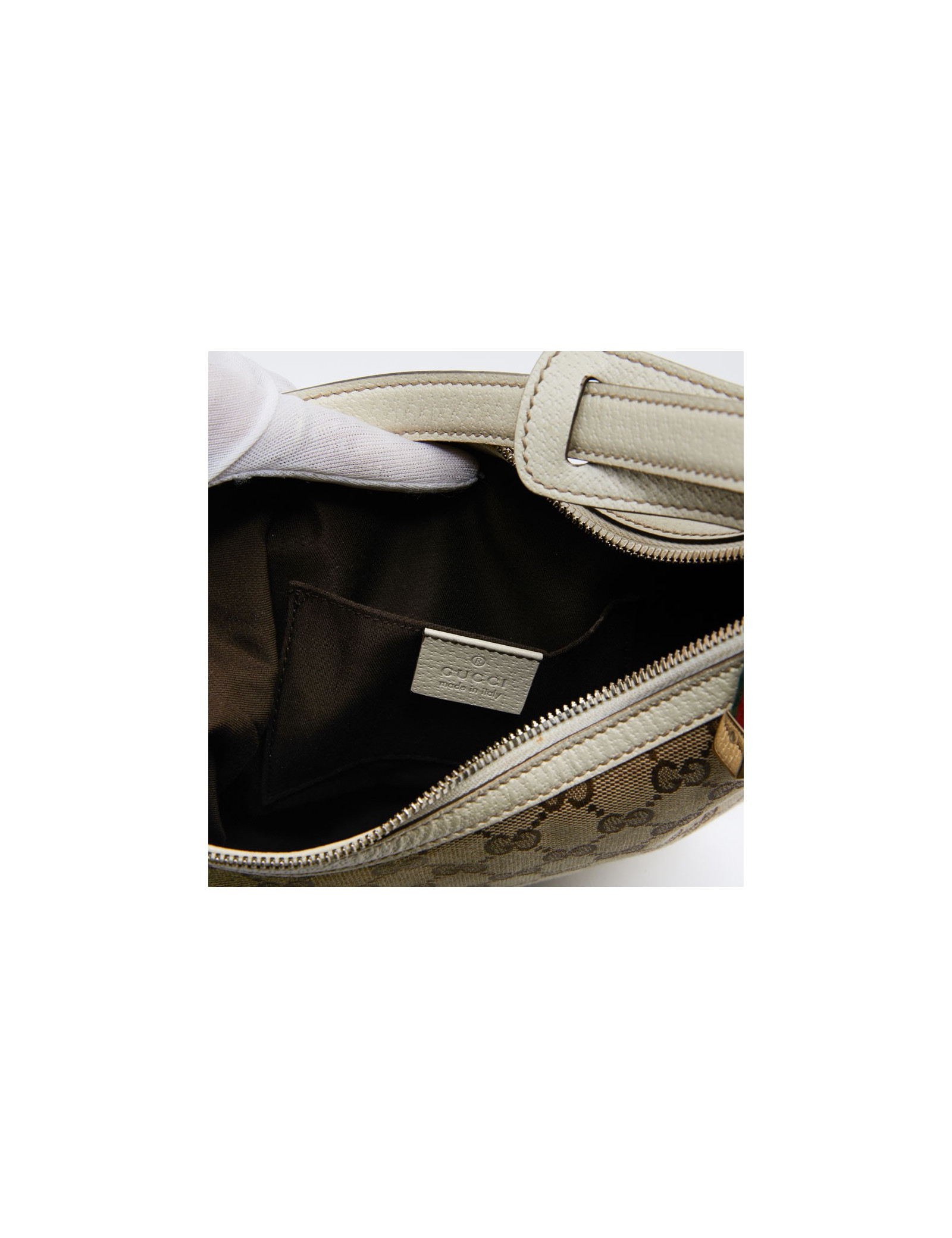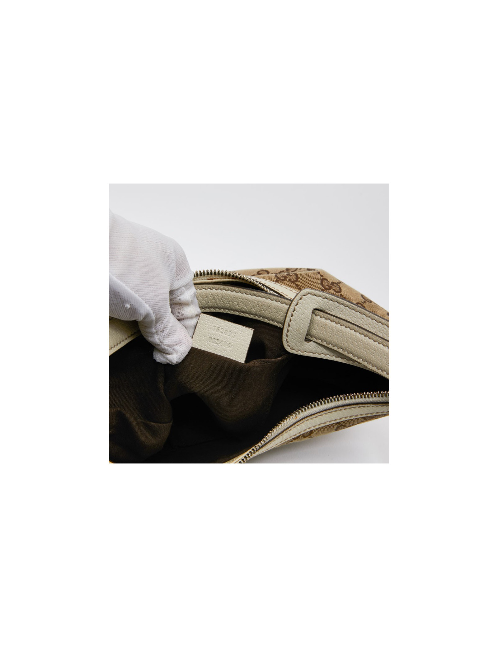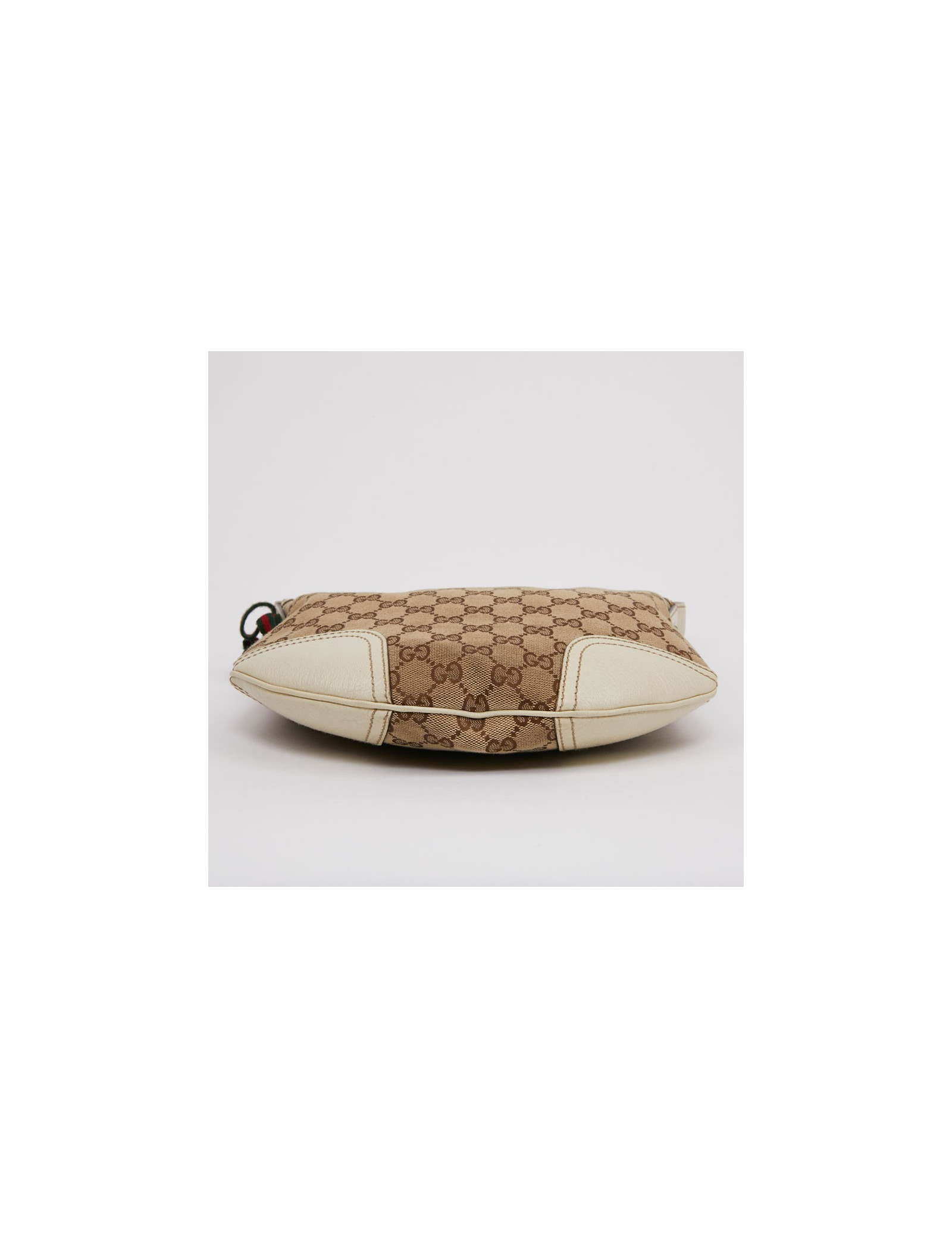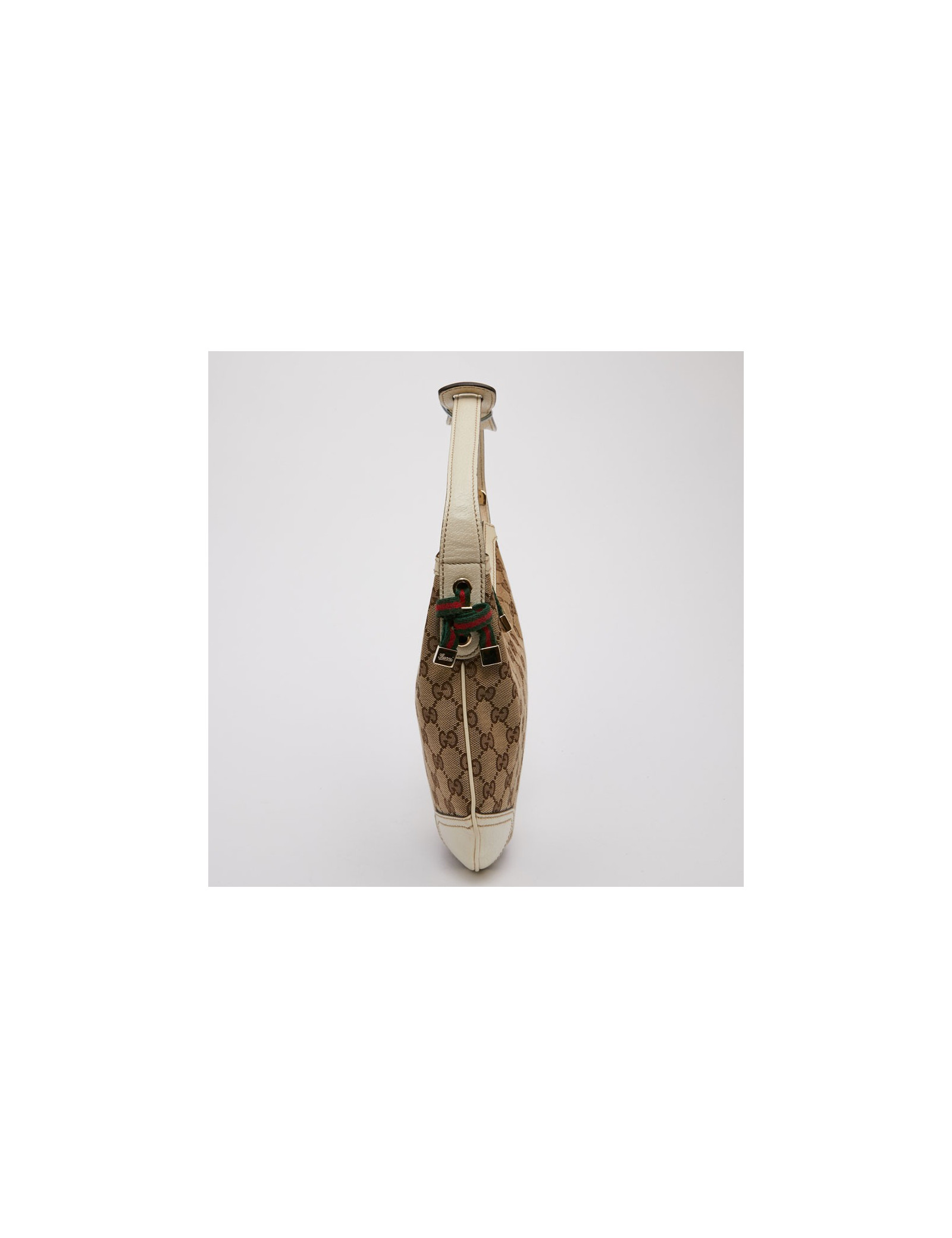 Très joli sac à main GUCCI d'occasion. Il est en toile monogramme et cuir beige. Il se porte à l'épaule grâce à son anse en cuir. L'intérieur est en tissu marron, avec une petite poche plate et une poche pour smartphone. Il a un noeud bande web (vert et rouge) sur le côté. Il est en parfait état, aucune usure des coins.
