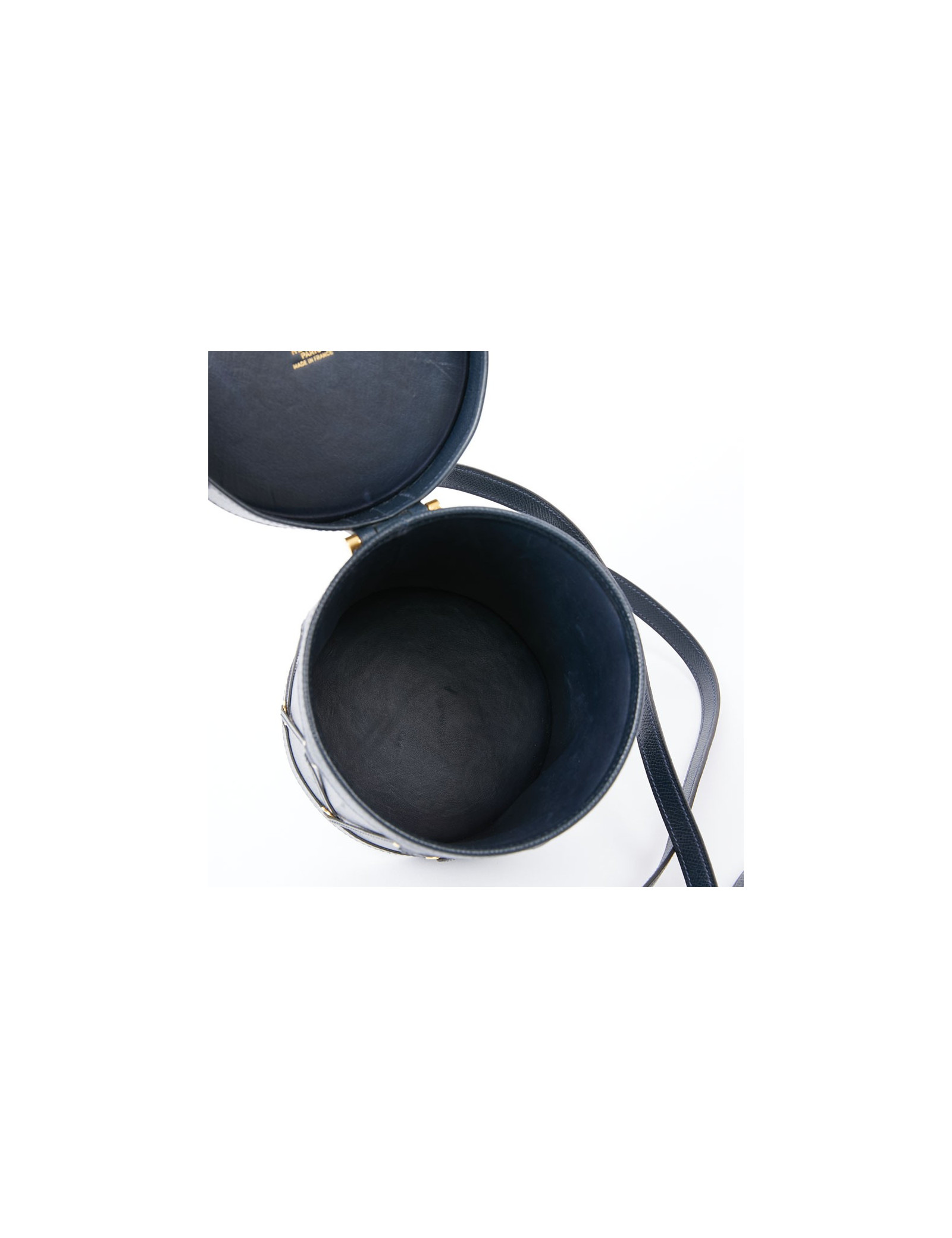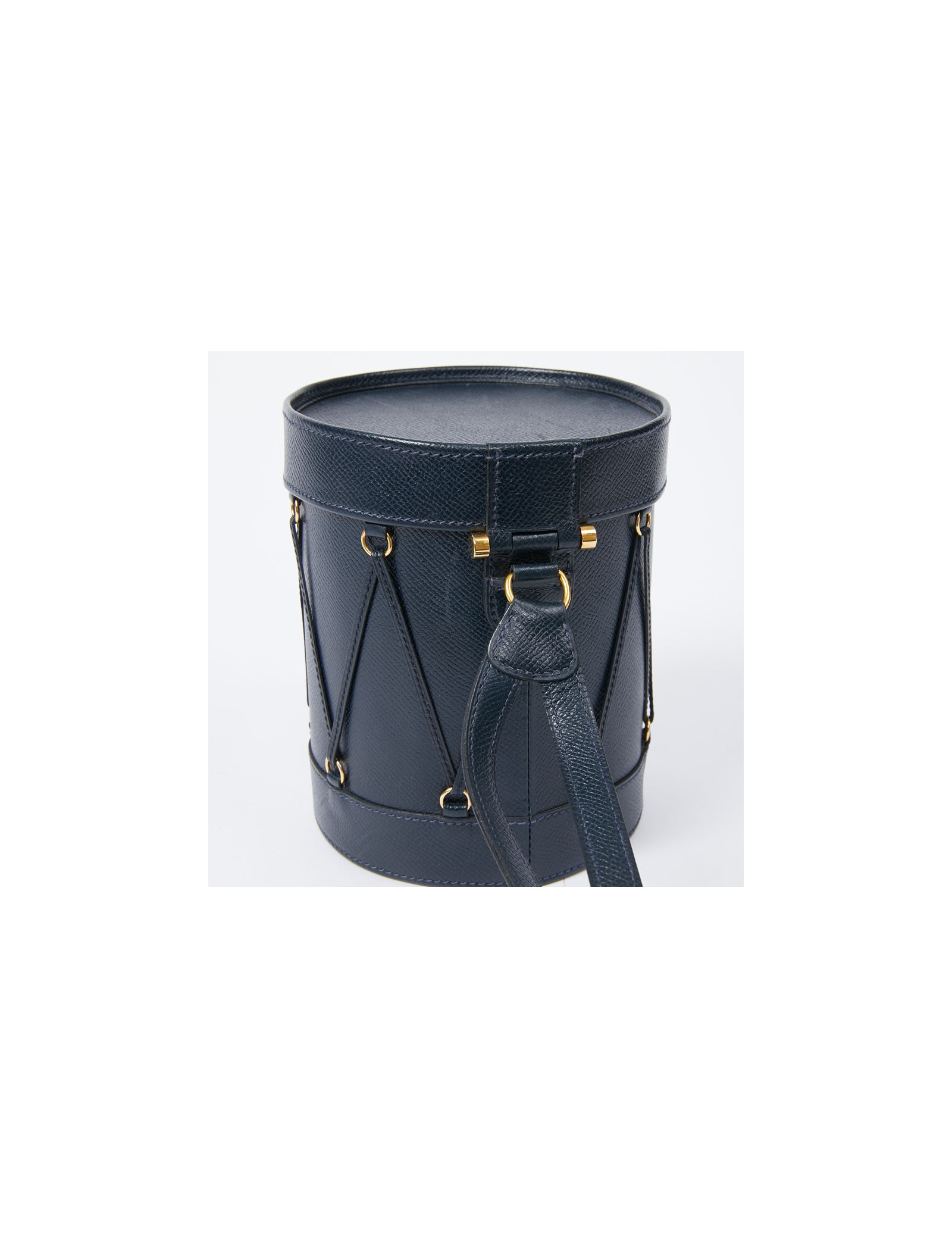 Collector. Sac tambour très original en cuir grainé Courchevel bleu. L'intérieur est doublé en cuir lisse bleu. Il se porte à l'épaule ou croisé. Il a quelques égrenures sur le cuir. Lettre S dans un cercle au niveau de la terminaison de la bandoulière. Il est en en très bon état.