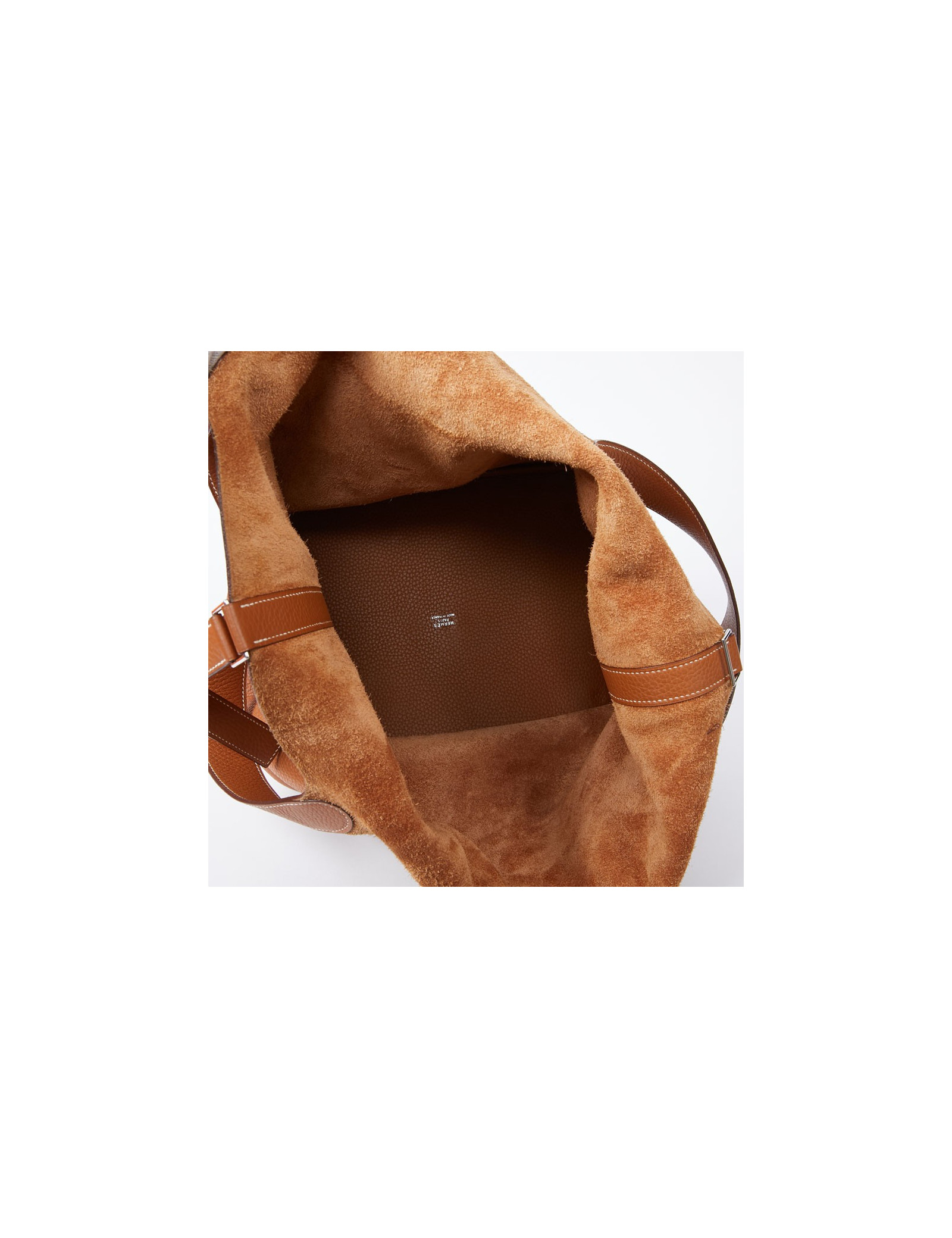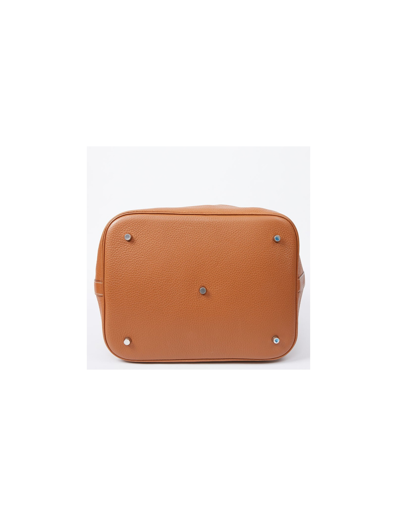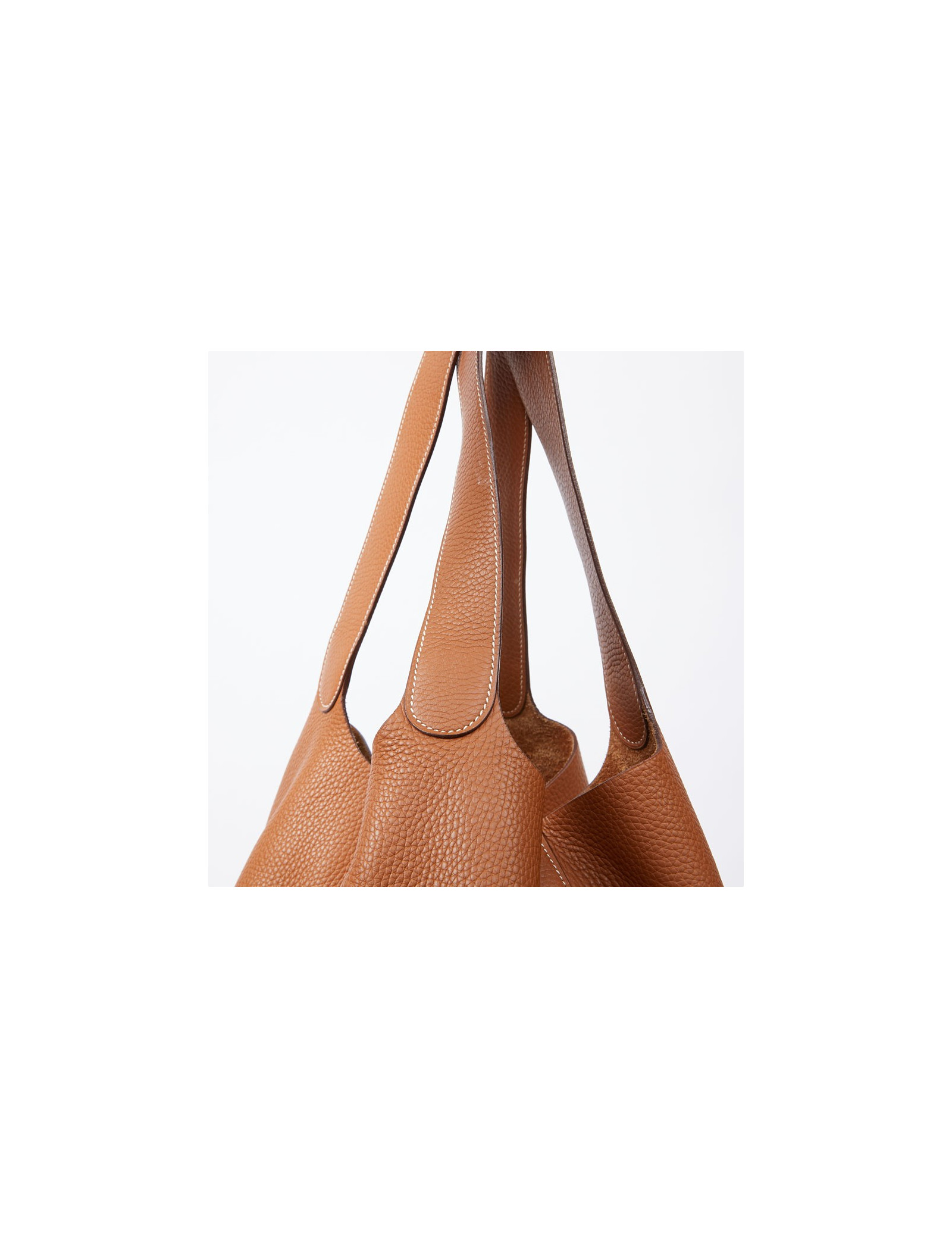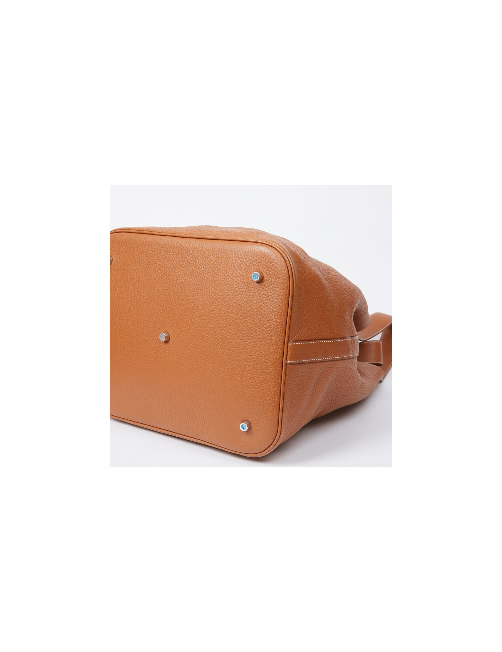 Pour tous les jours, cet intemporel sac Picotin XL de la Maison Hermès est en cuir taurillon Clémence gold. Double poignée en cuir permettant un portage main ou épaule. Pas de poche intérieur. Fermeture par une patte en cuir. Les coins sont légèrement patinés.