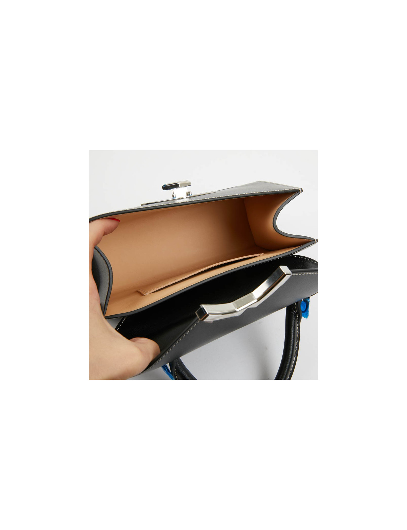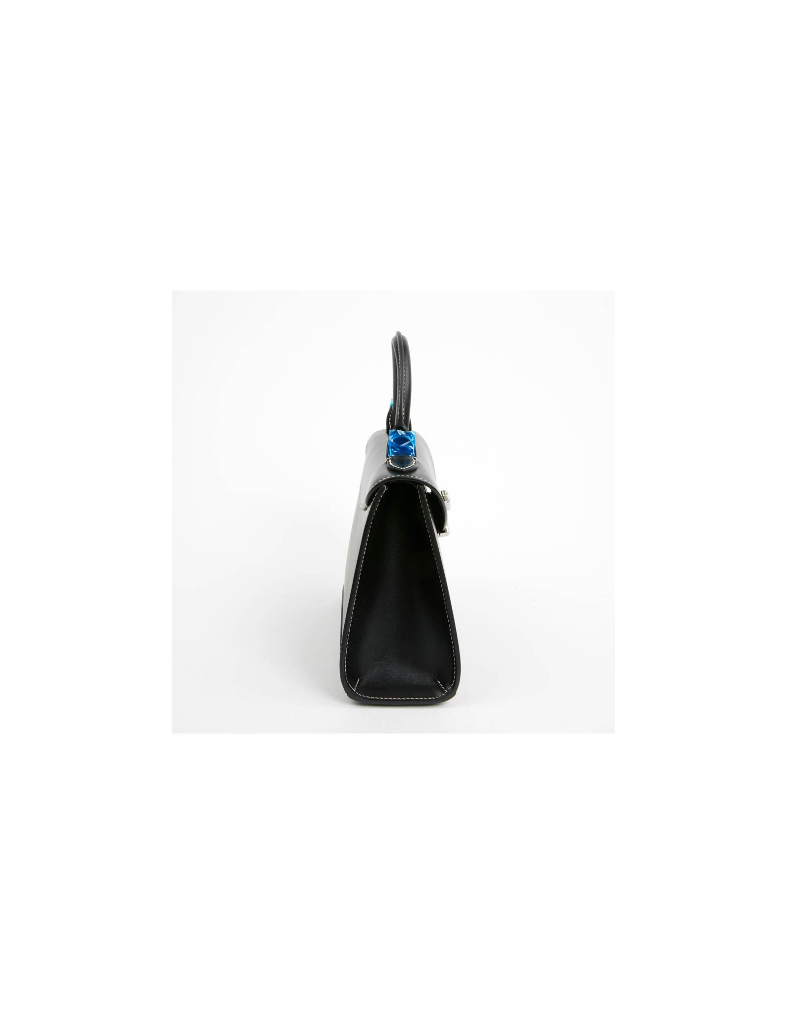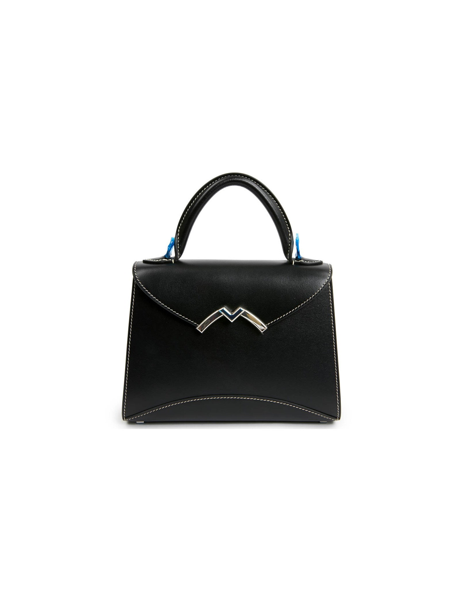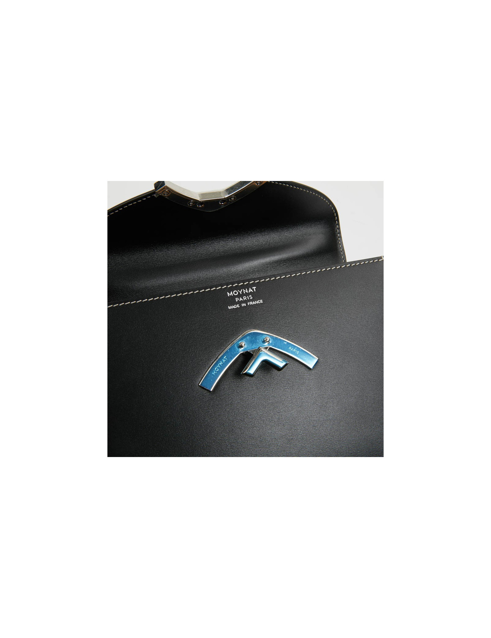 Petit sac Gabrielle de la Maison MOYNAT. Il est en cuir de veau noir avec une surpiqûre blanche. La bijouterie est en argent palladié. Un fermoir V pivotant laisse apparaître un M comme MOYNAT. La doublure est en cuir beige, une petite poche fente. ce sac se porte à main avec sa poignée en cuir ou à l'épaule avec sa bandoulière amovible.