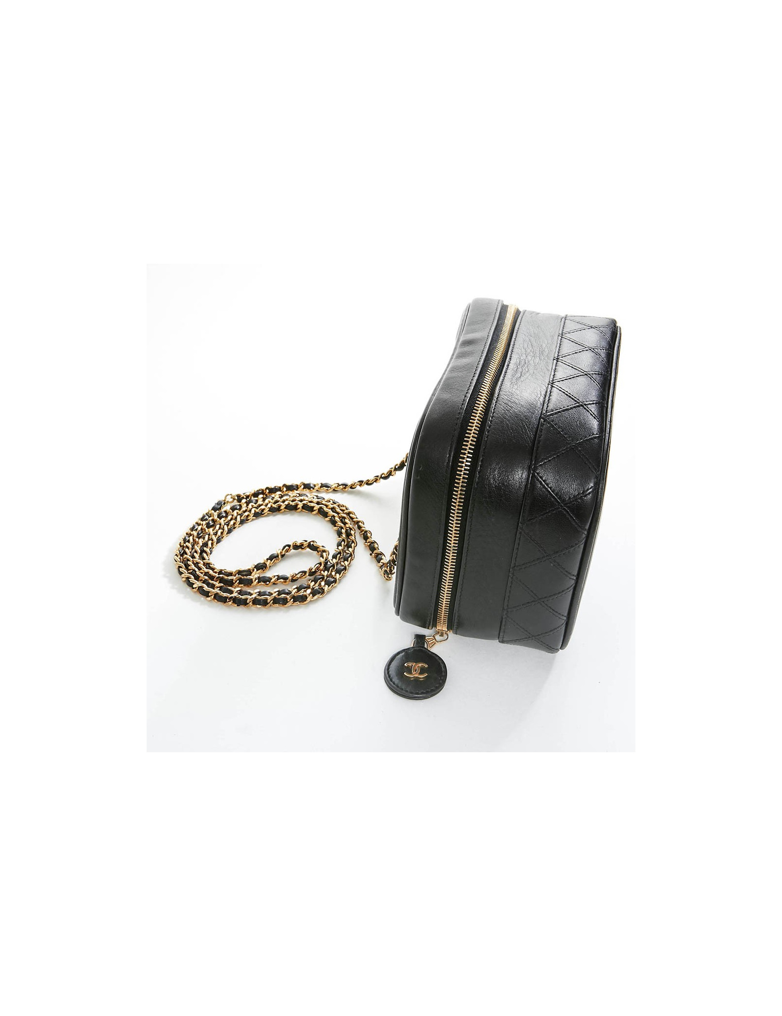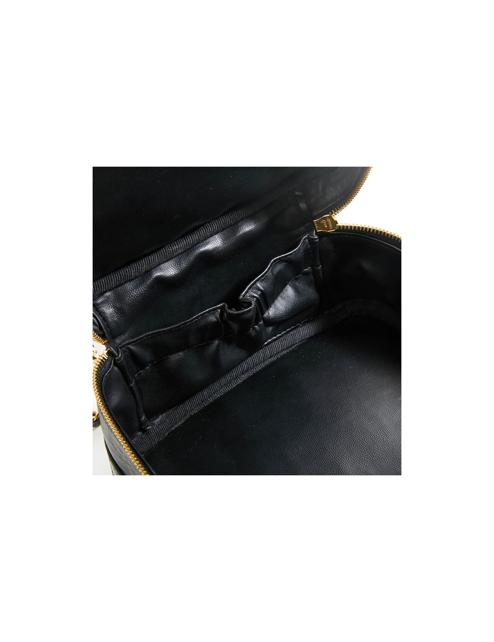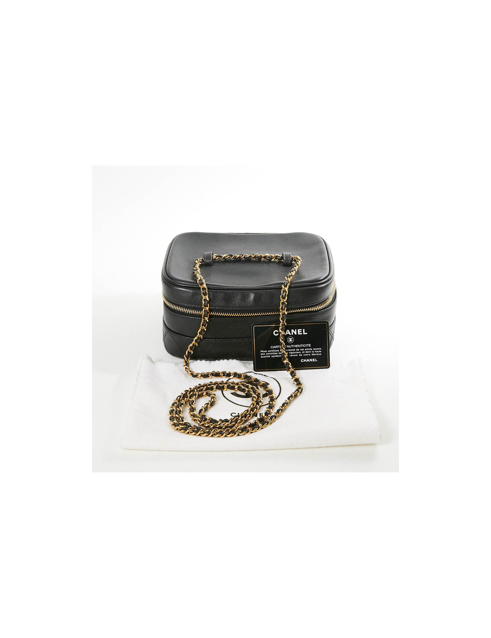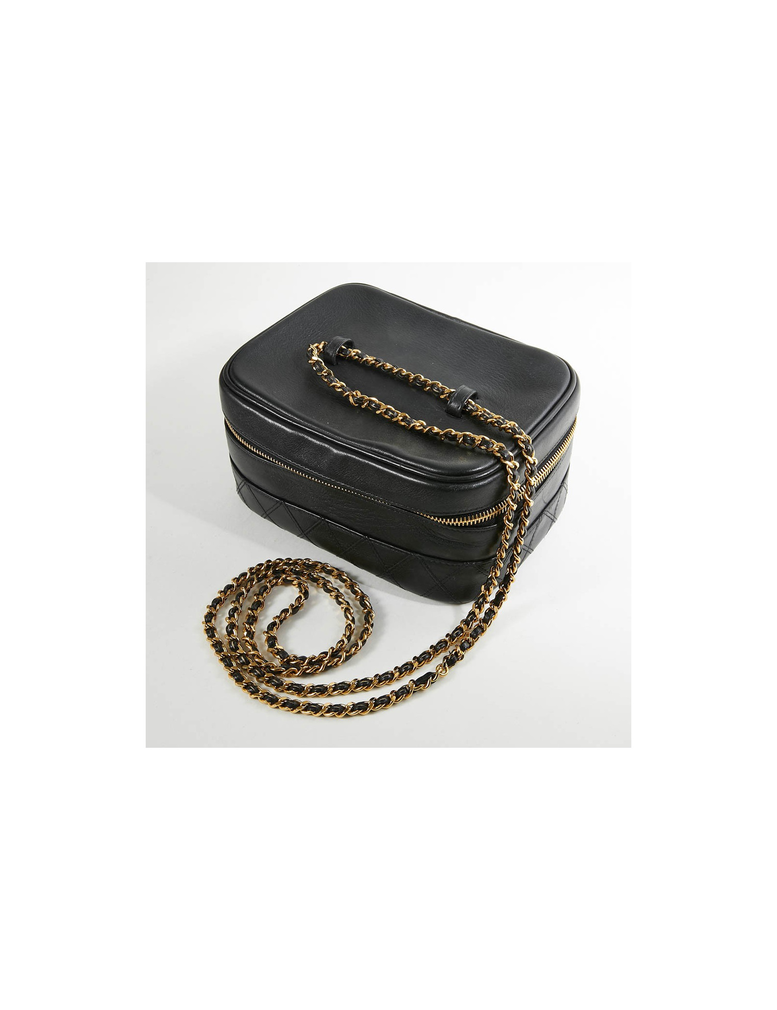 Ce sac, à l'origine servait de boite à bijoux. Avec la tendance vintage, il sera détourné comme un sac de jour. La chaîne métal doré entrelacé de cuir a été remplacée à l'identique. Il se porte à l'épaule ou croisé. C'est un cuir lisse et matelassé. Se ferme par une fermeture à glissière. Il est doublé en plastique noir avec une poche fente.