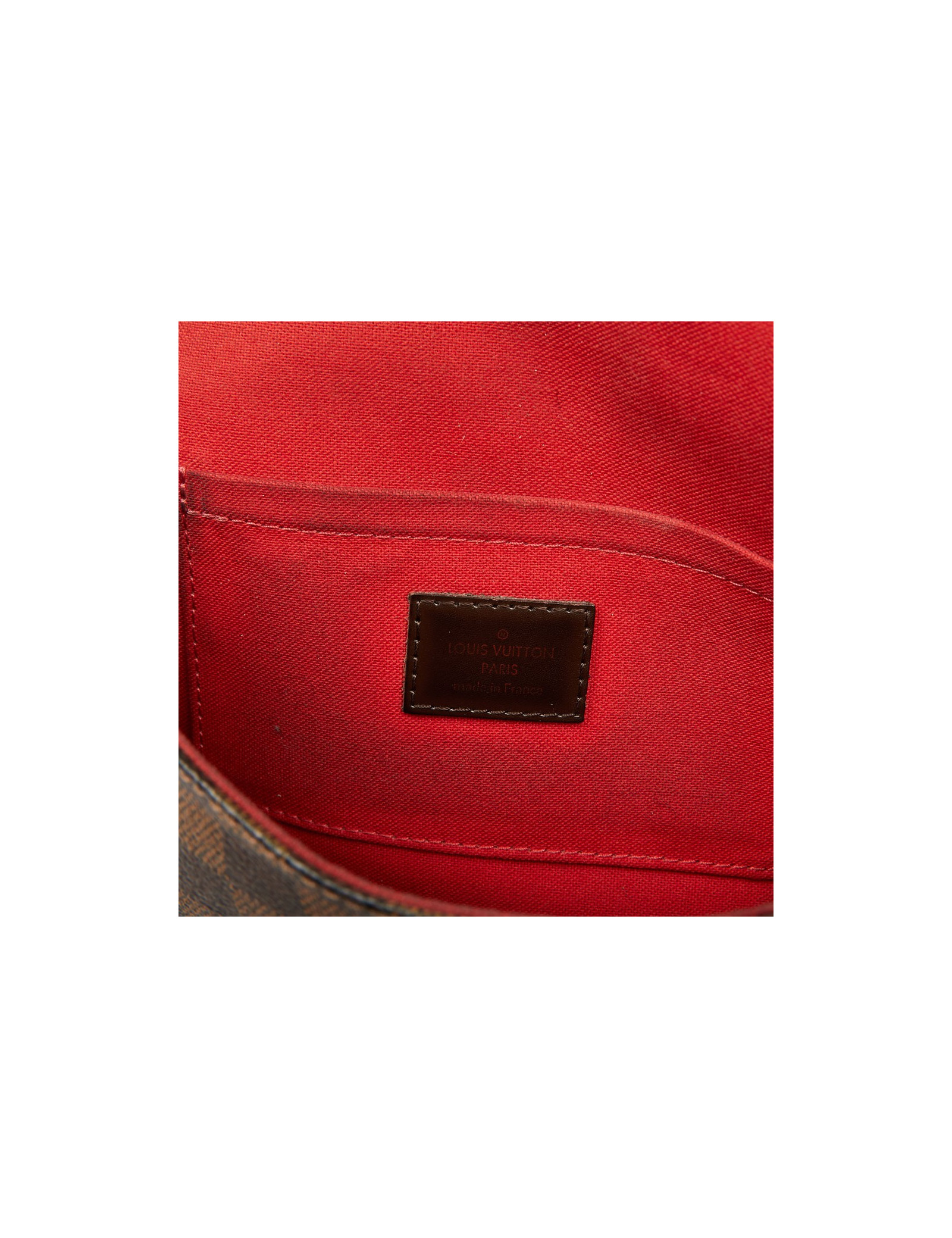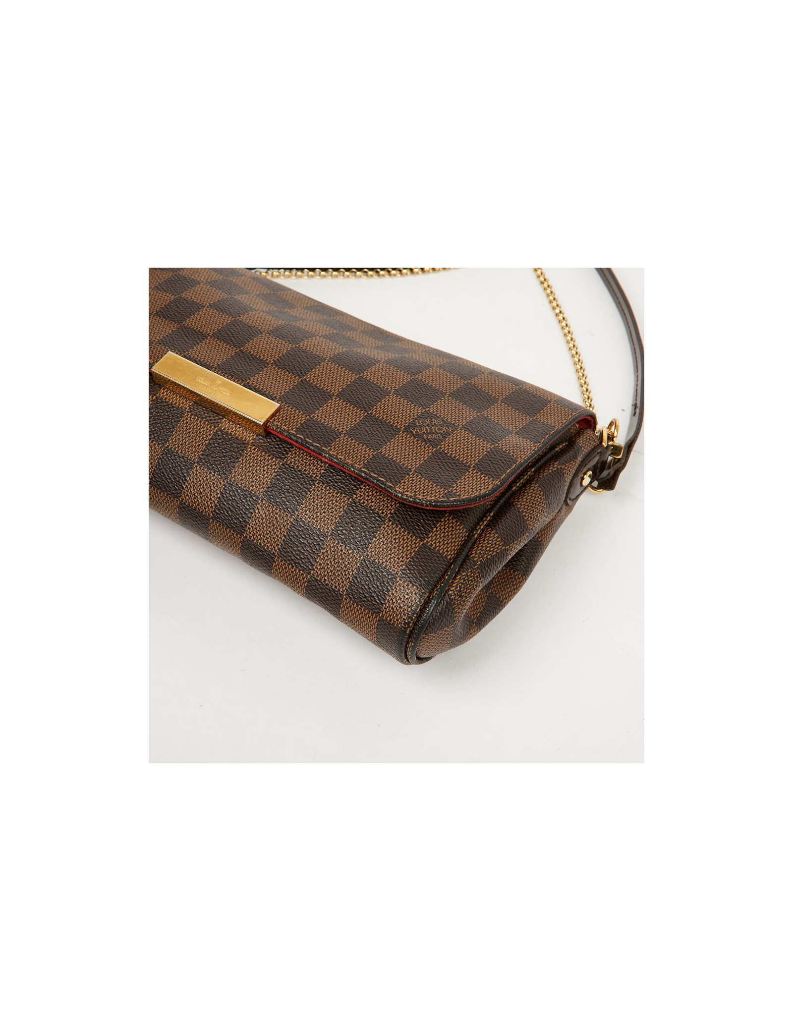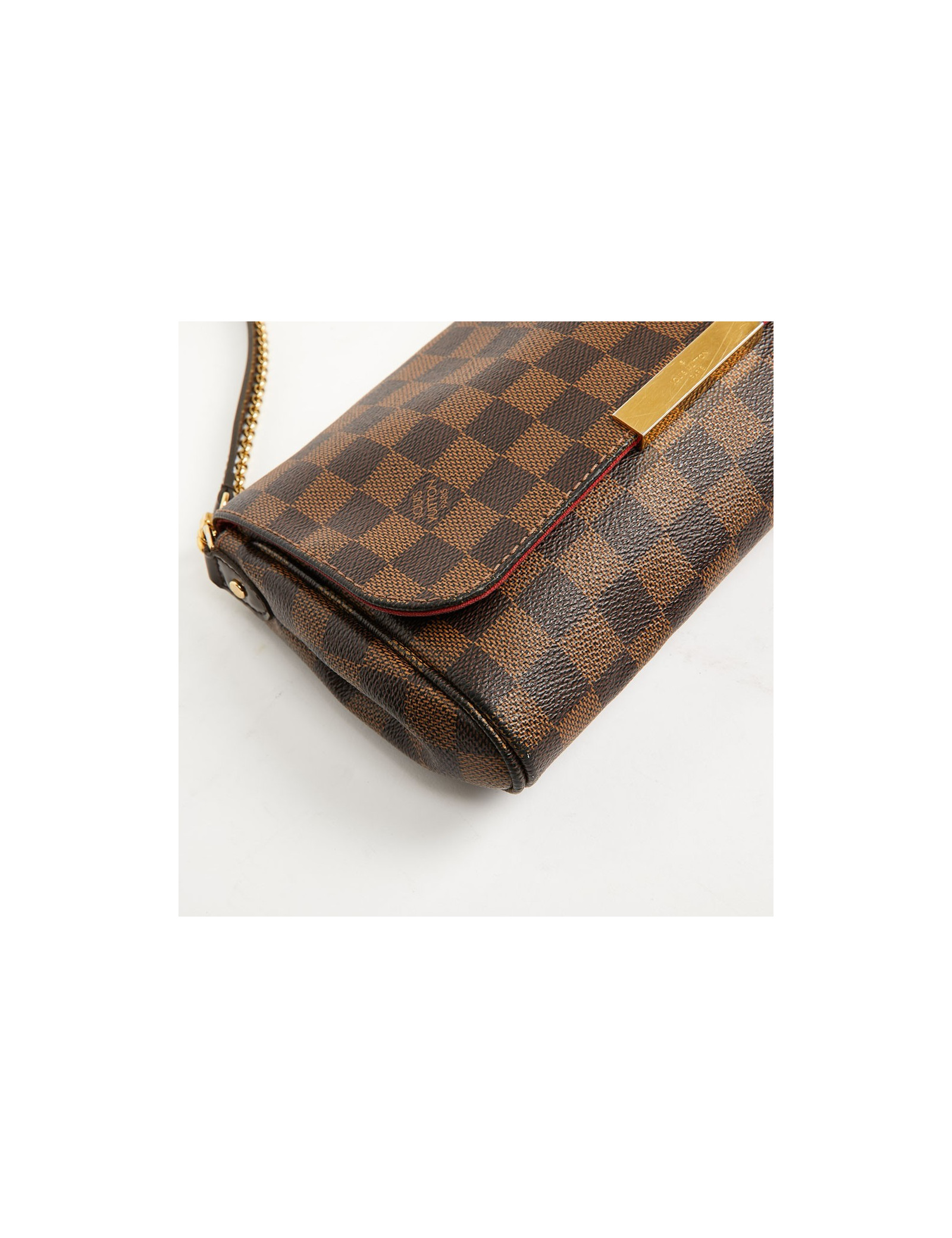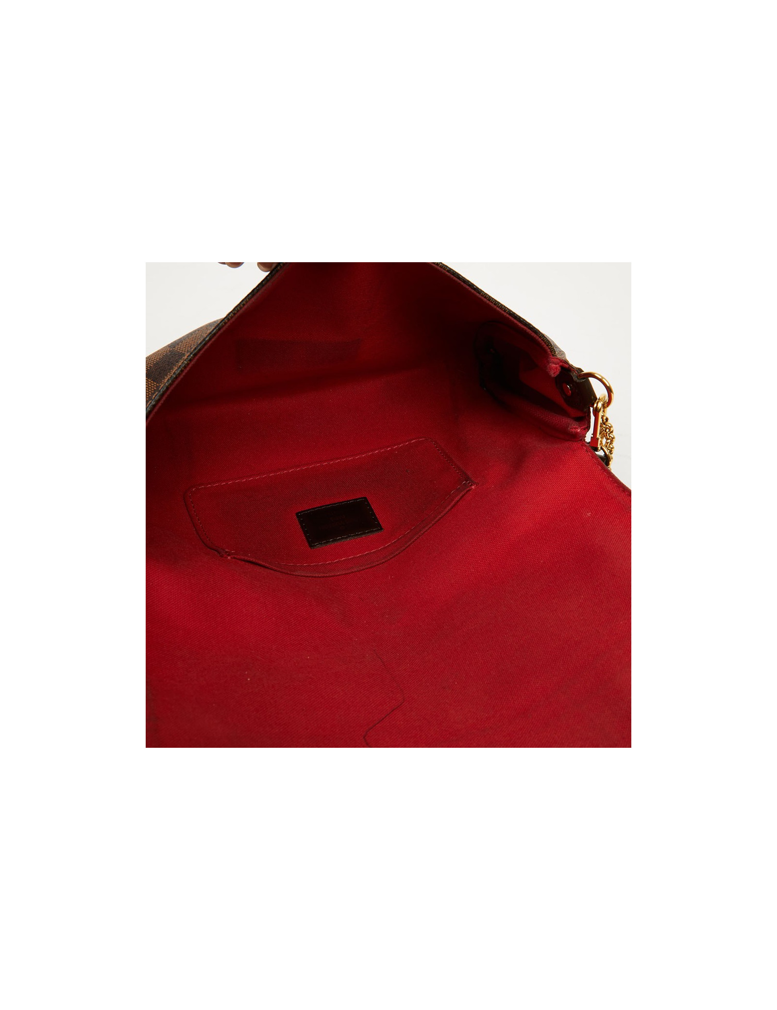 Pochette de taille moyenne de la Maison Louis Vuitton, ce modèle Favorite est en toile enduite. La bijouterie est en métal doré. Elle est doublée de tissu rouge avec une petite poche plaquée.