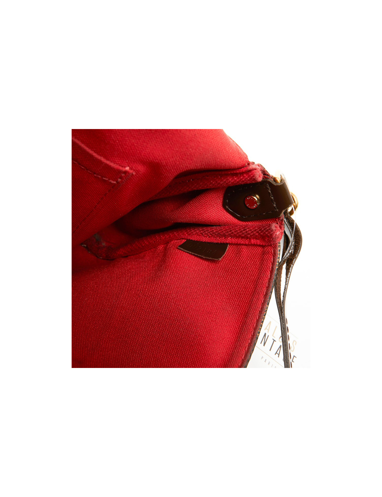 Sur la doublure intérieure du rabat une marque de stylo et de salissure. Le cuir de la bandoulière se décolle au niveau de l'attache. Ce sac est en très bon état.