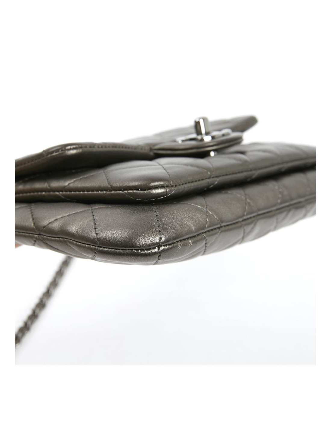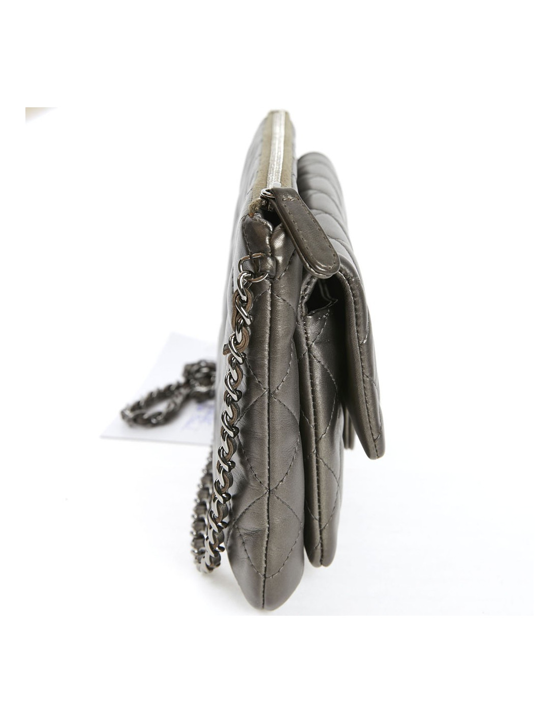 Indispensable wallet on chain Chanel. Il provient des ventes privées Chanel. Il est en cuir souple matelassé, avec une couleur kaki léger et irisé (il se rapproche d'un gris). L'intérieur du sac est gris irisé. Il se ferme par un zip. Il y a un poche à l’avant. Il se porte à l’épaule ou croisé.