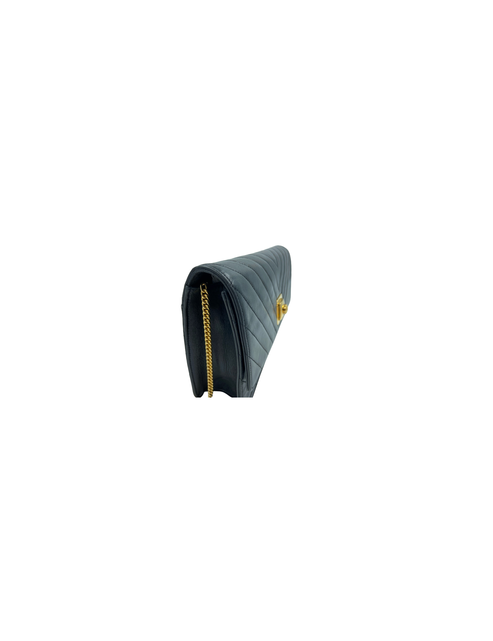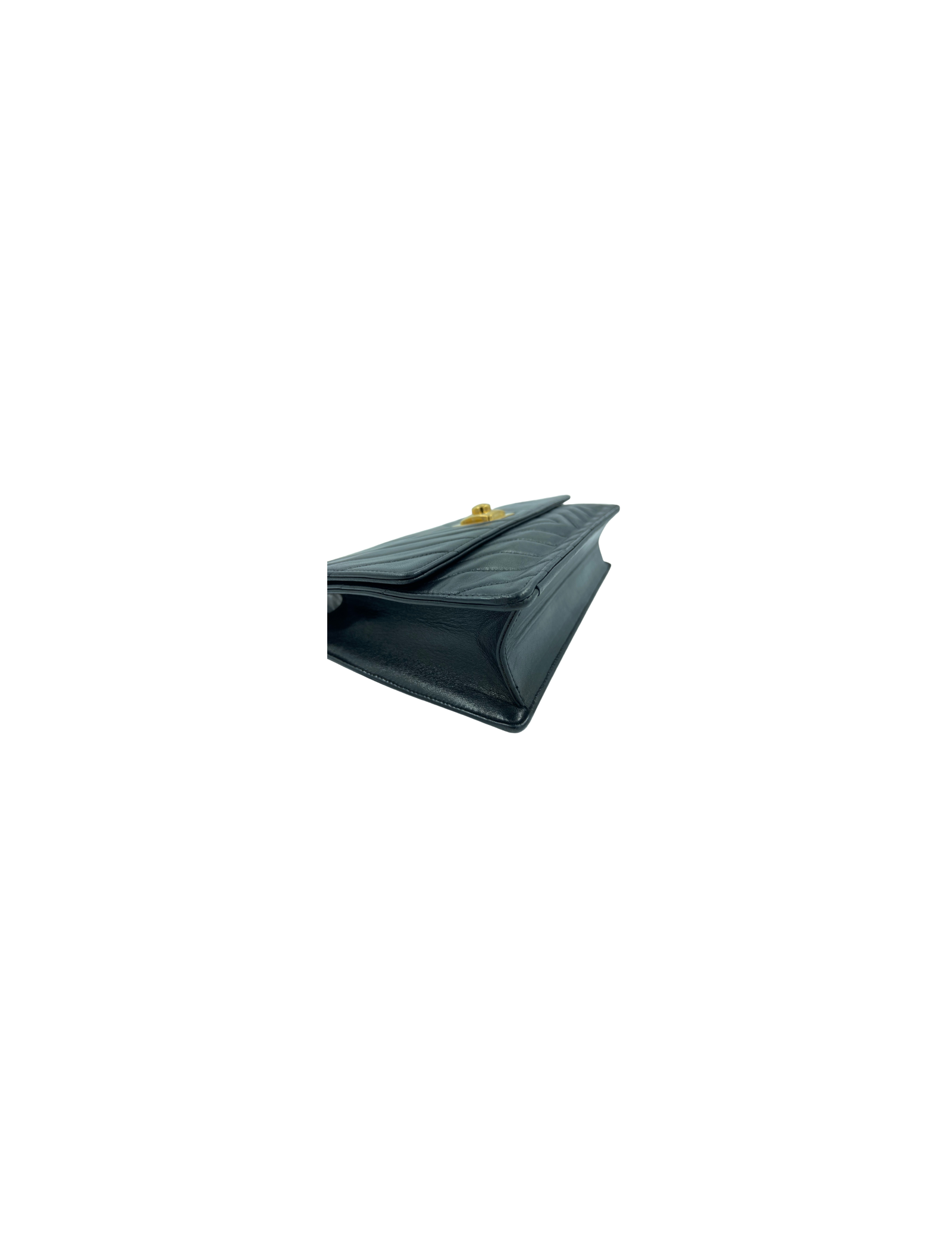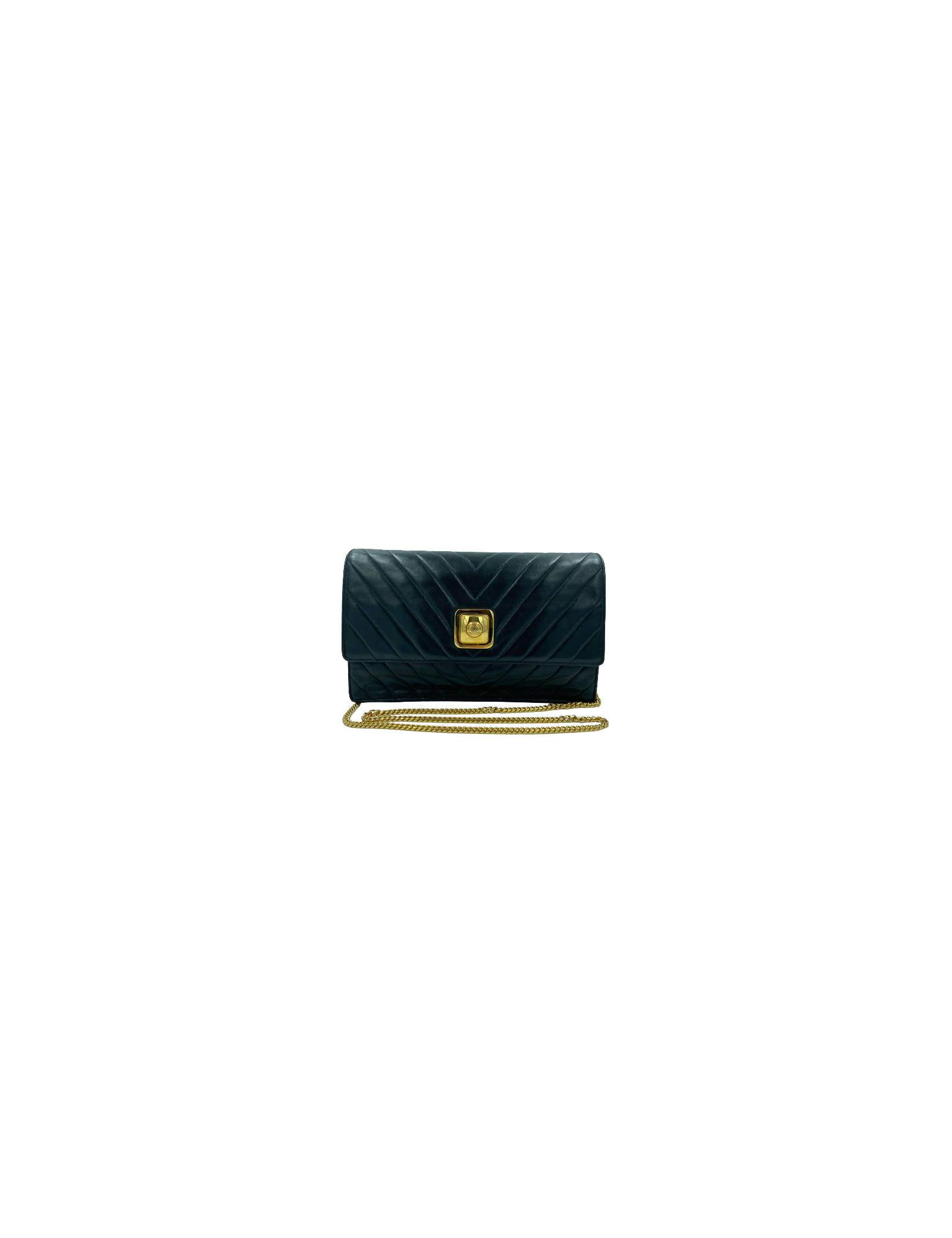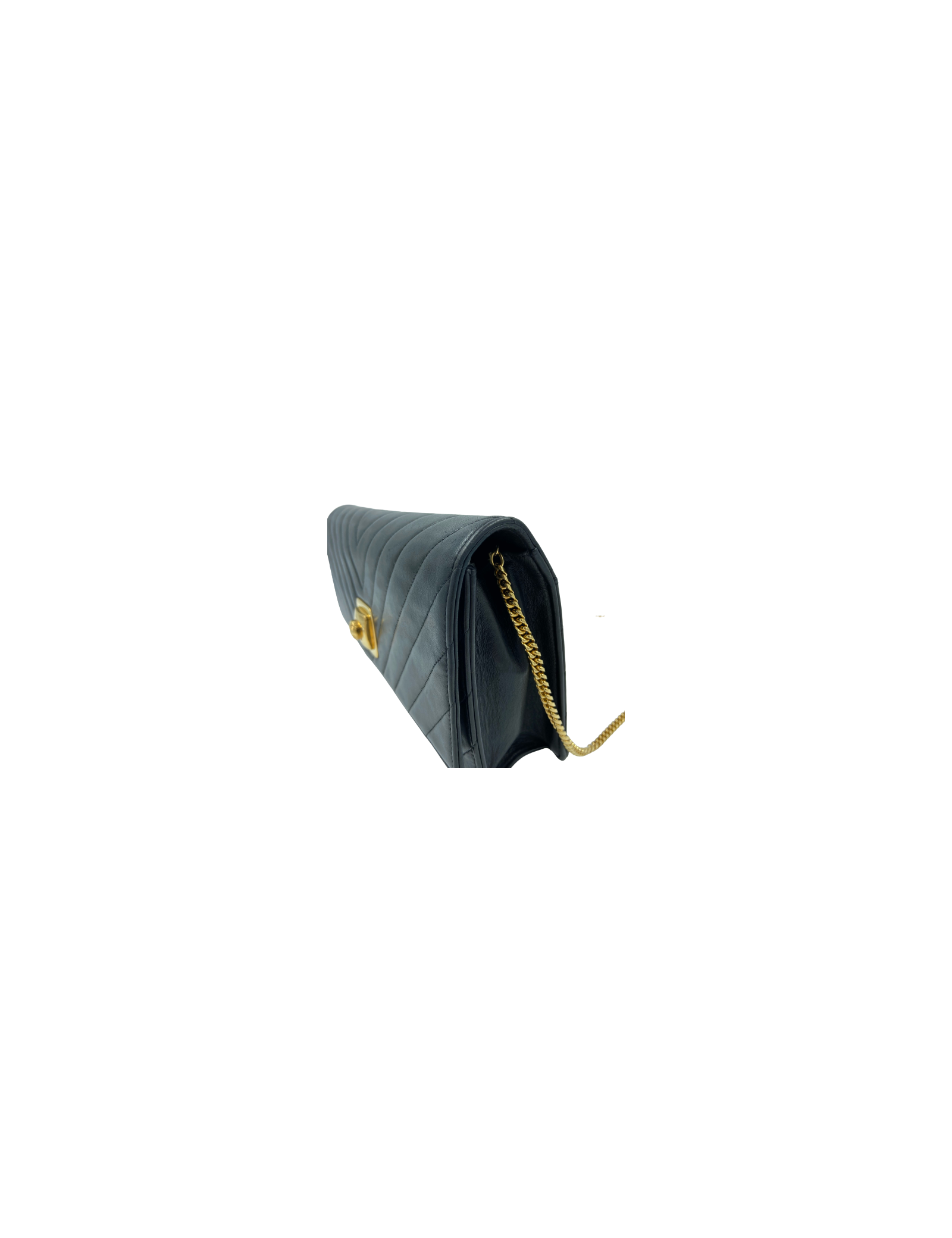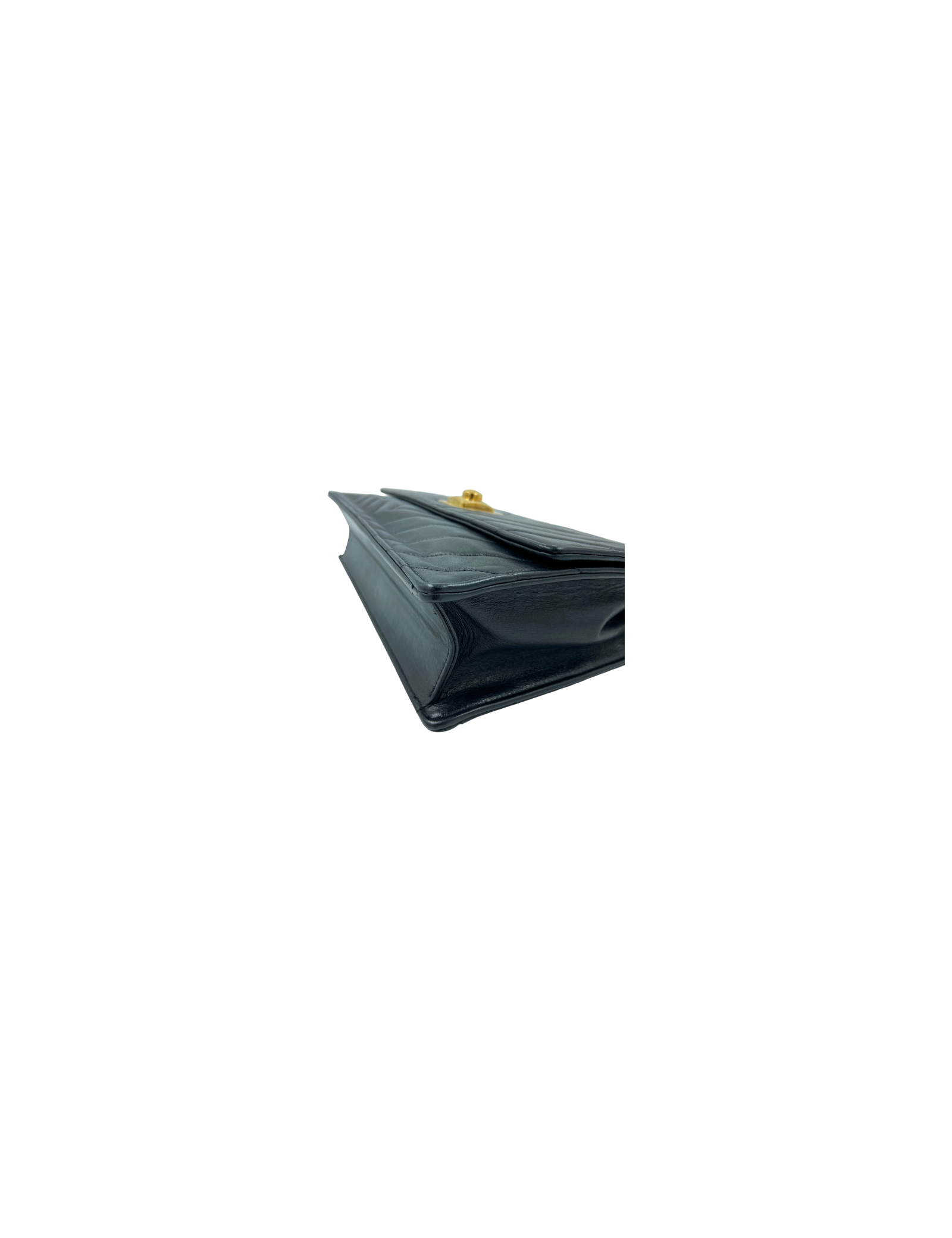 Pièce vintage CHANEL, ce sac pochette est en cuir d'agneau à chevrons noir. Il est en très bon état. La bijouterie est en métal doré, fermeture par un bouton pressoir.