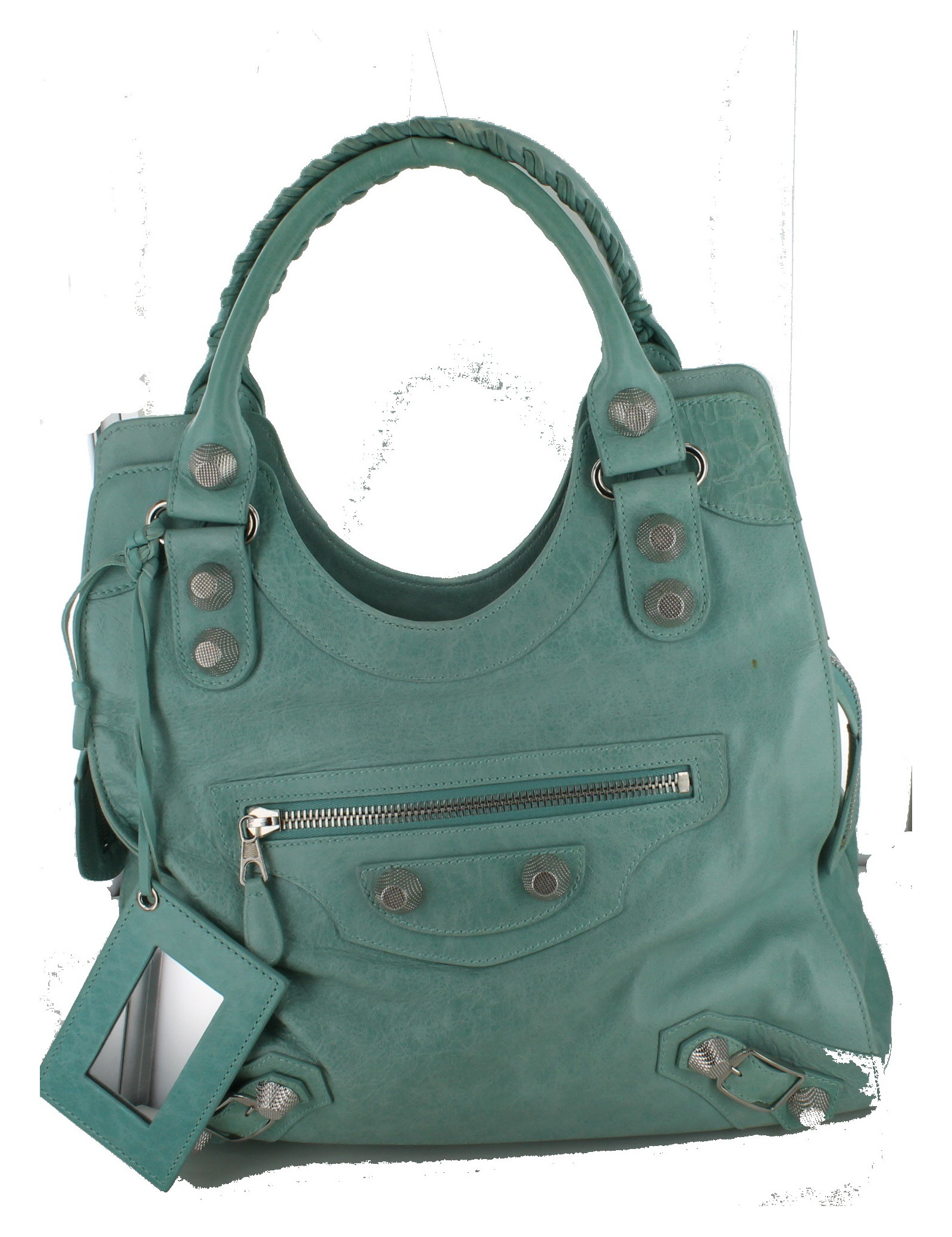 Joli sac Balenciaga en cuir vieilli de couleur turquoise verte. Son cuir est lisse et très souple, la doublure est en toile noire et il y a 2 poches ouvertes.Les ferrures sont de couleur argentée. Il est en très bon état (très légères taches sur la fermeture éclair et une toute petite tache sur l'avant (voir photo).
