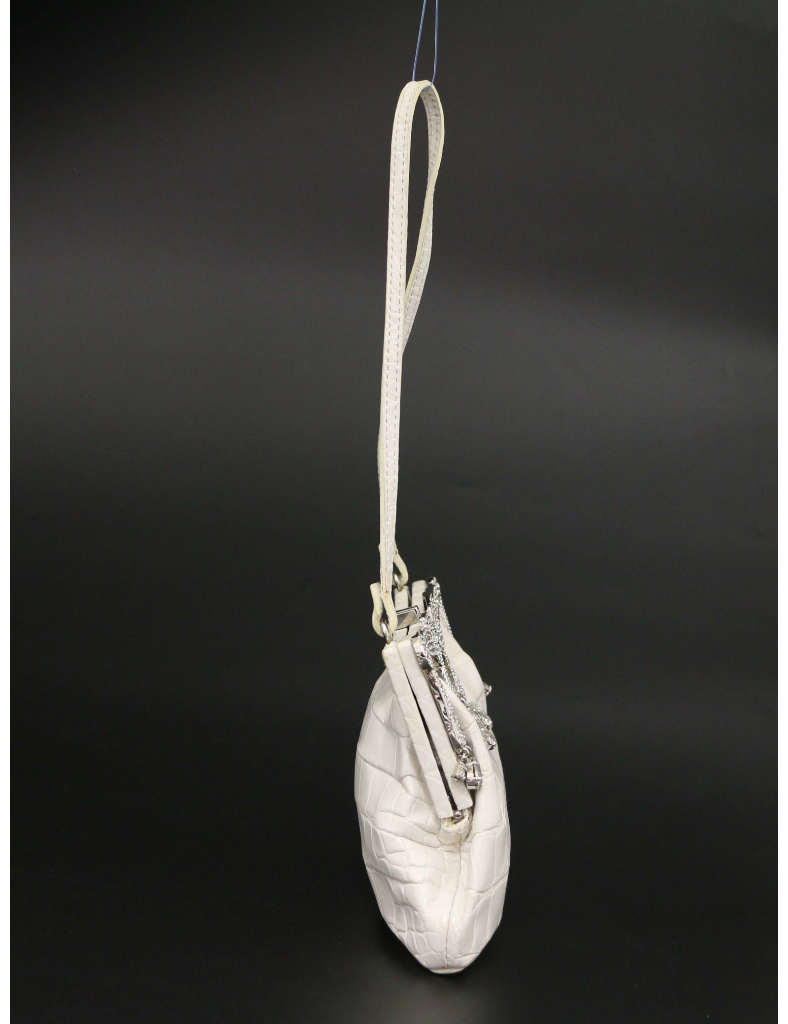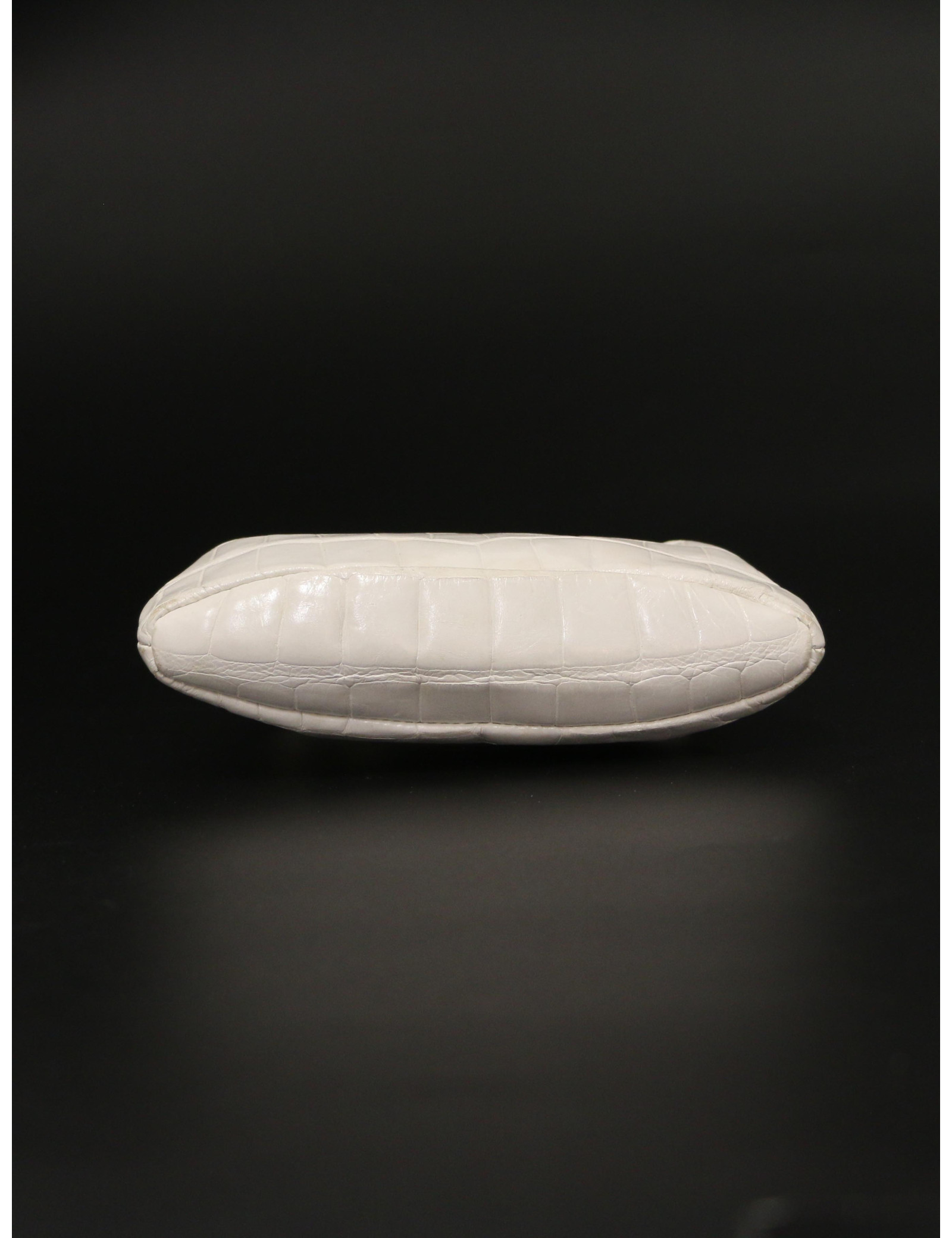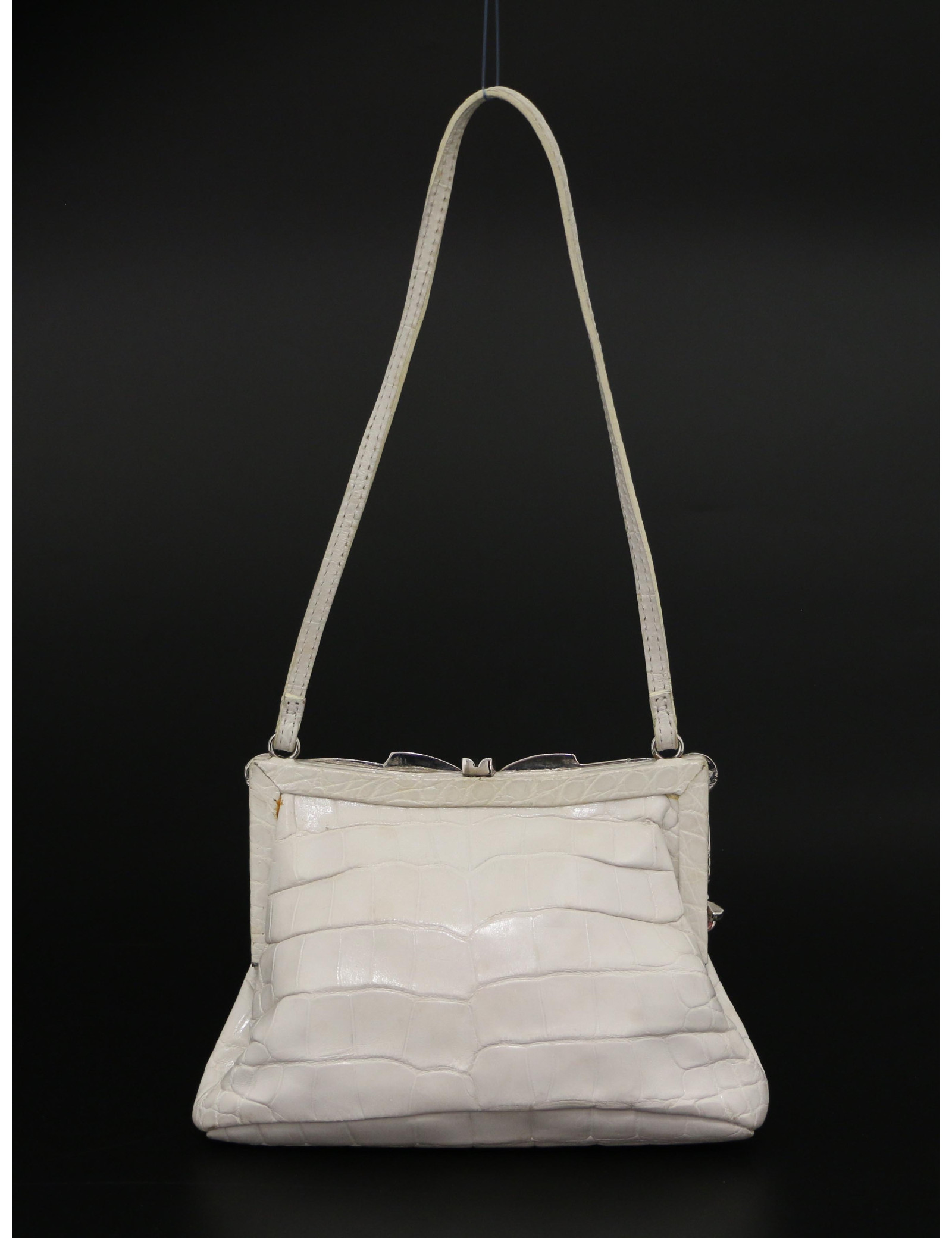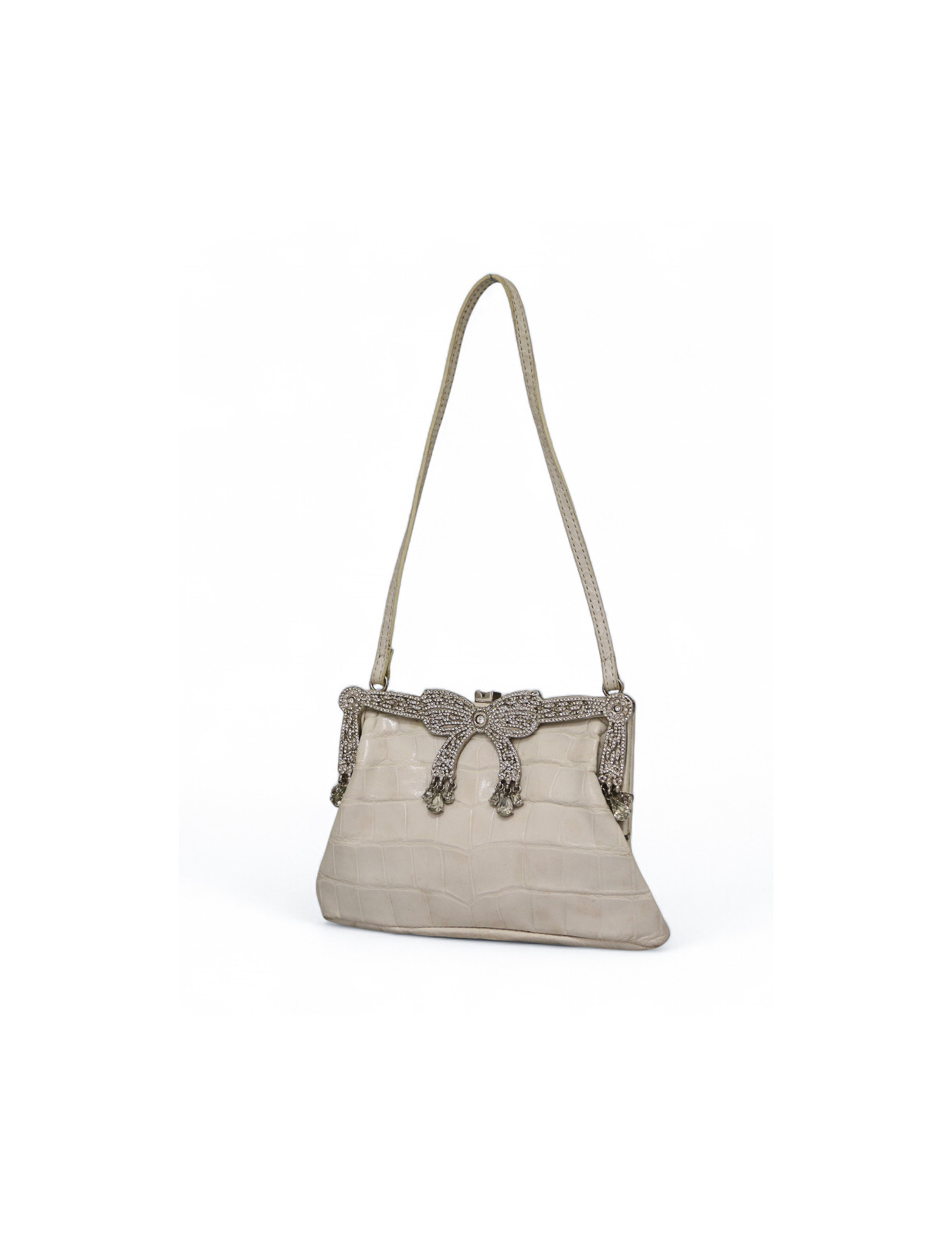 Détails : magnifique mini sac entièrement en alligator écru. L'avant est orné de strass formant un noeud. Il est en très bon état, légères traces par endroits peu visibles.
