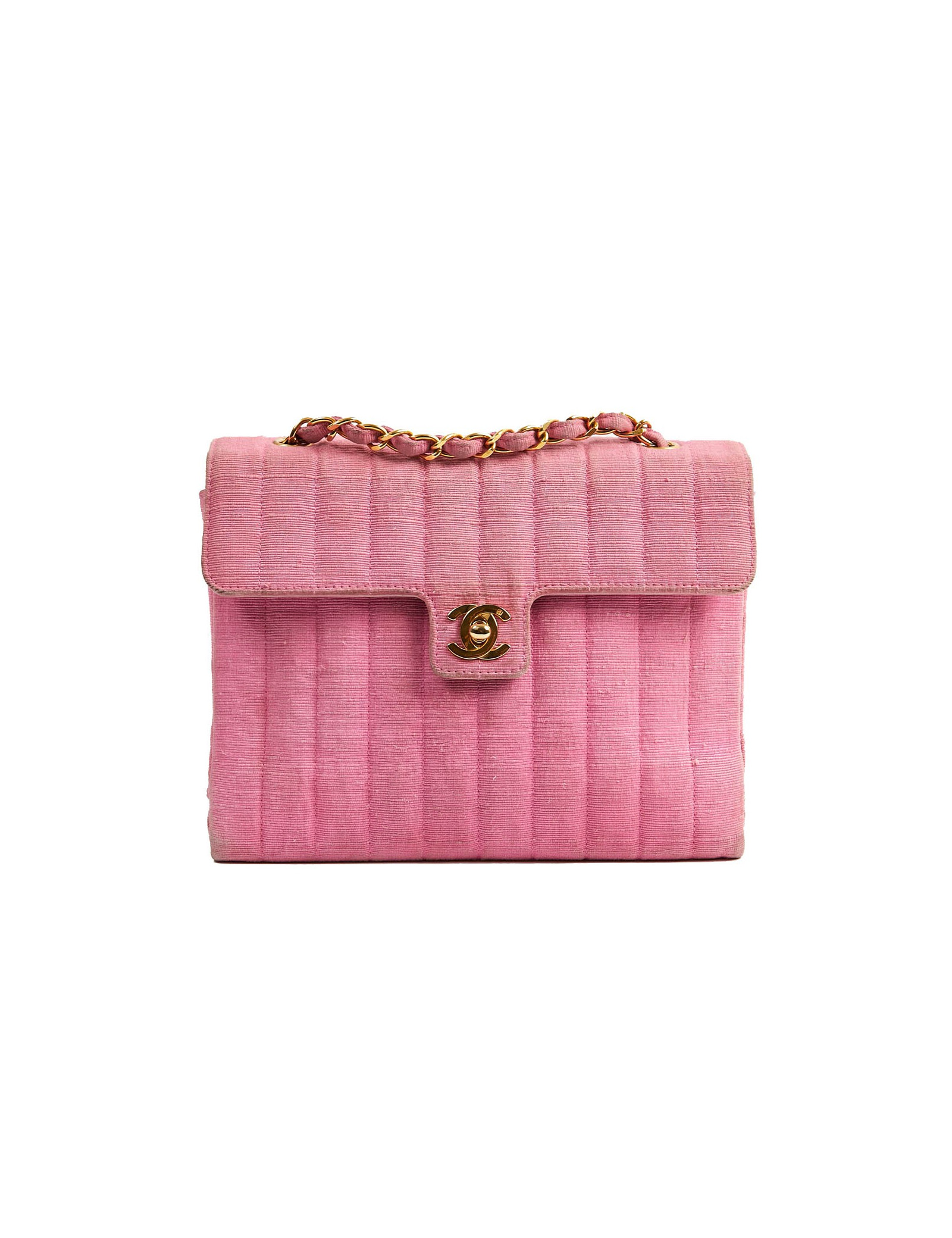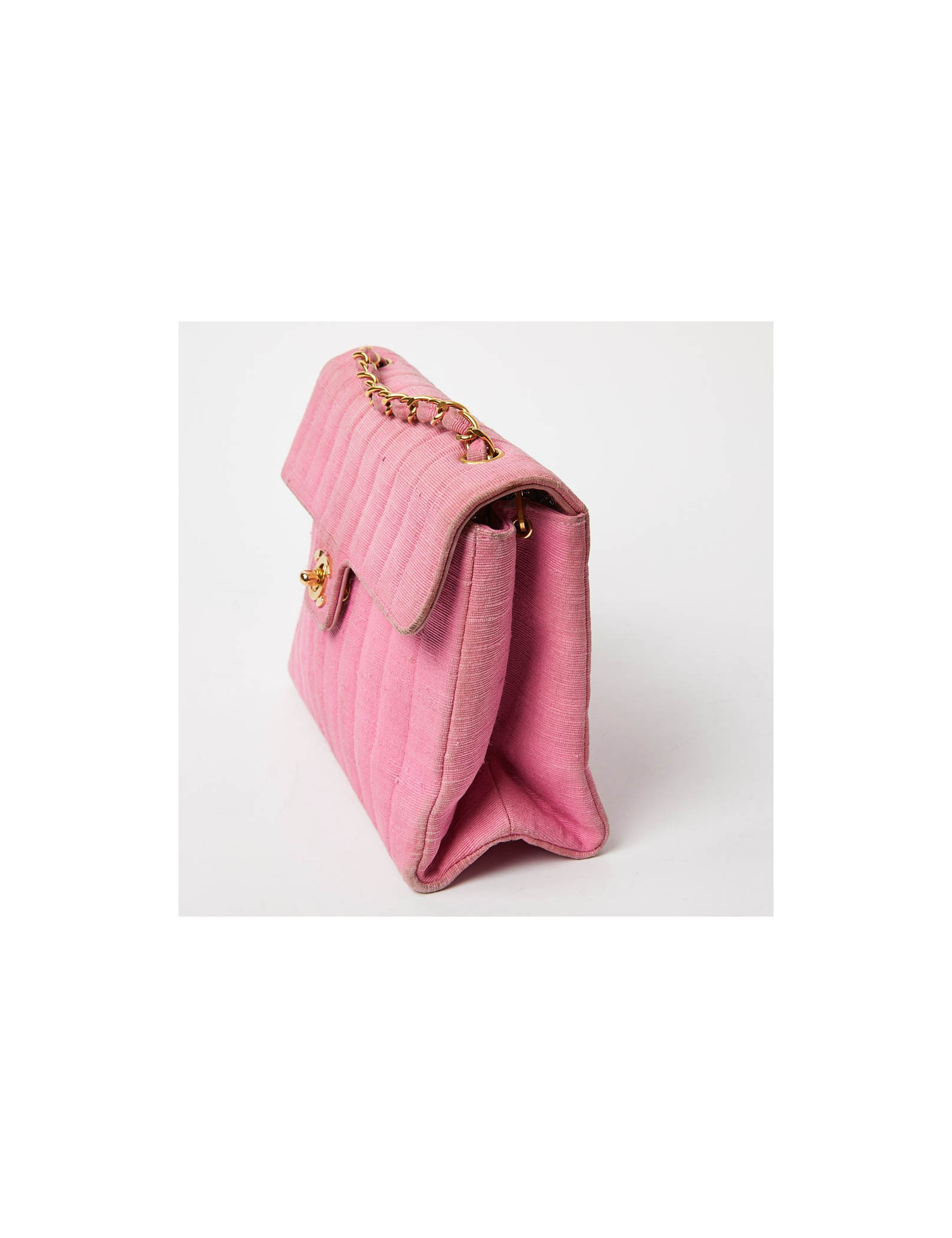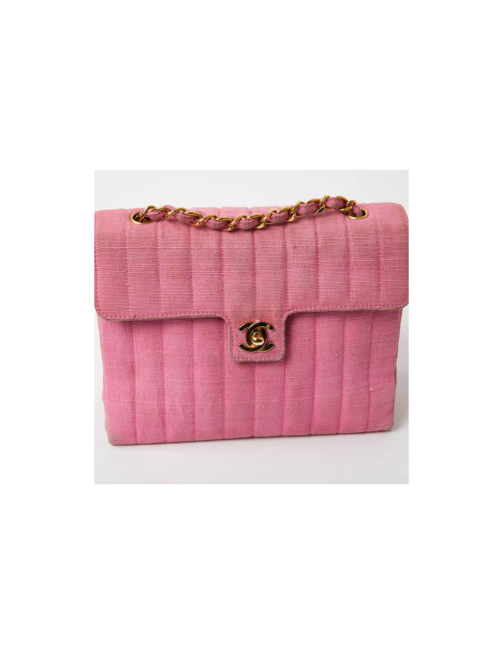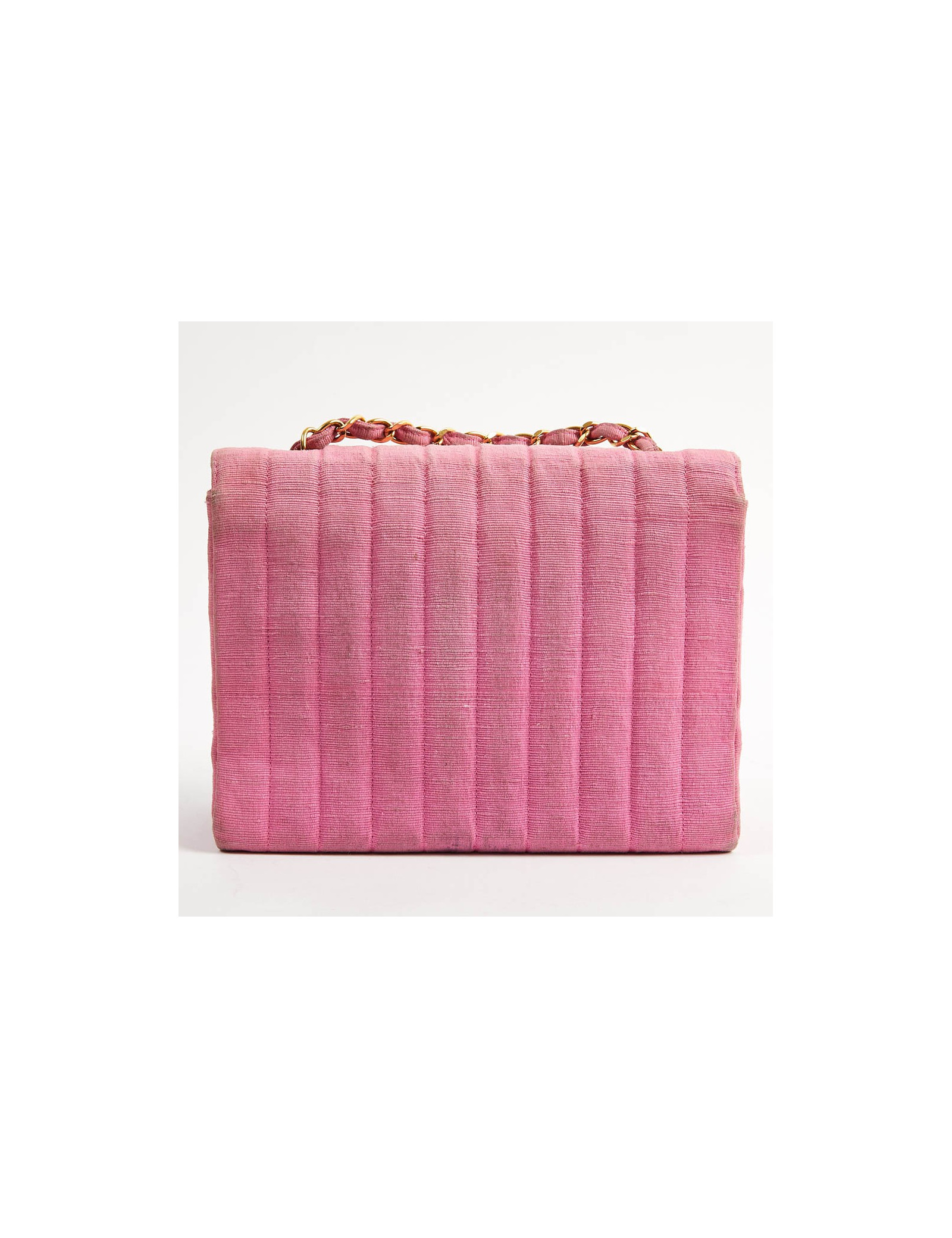 Sac CHANEL des années 90, époque des couleurs vives. Il est en tissu ottoman rose avec la bijouterie dorée. Il est à rabat avec un fermoir CC. La bandoulière est une chaine en métal entremêlée de tissu. A l'intérieur se trouvent 2 poches dont une avec fermeture éclair. iIl est doublé de cuir rose, en parfait état.