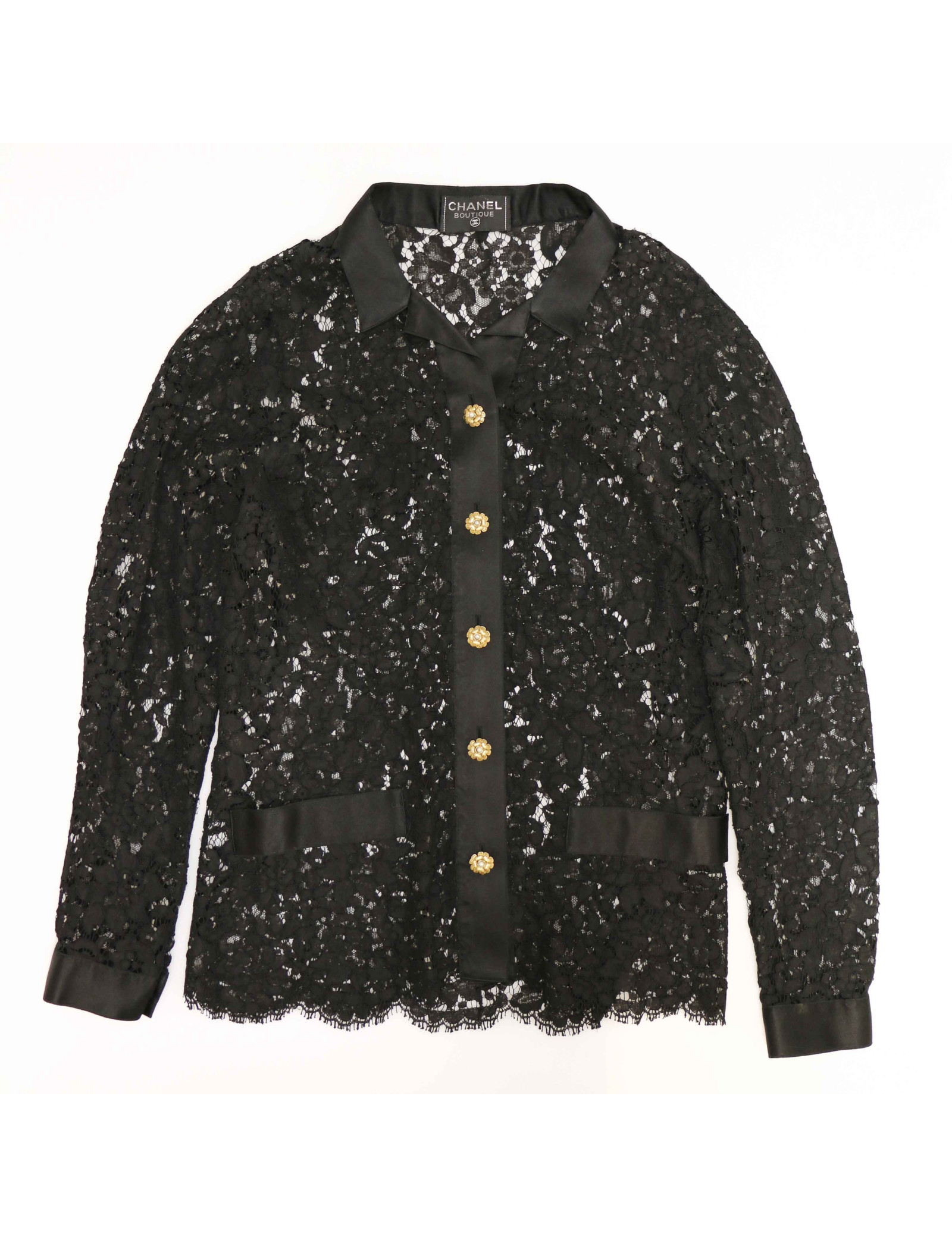 Détails : robe bustier en dentelle (fermeture zippée dans le dos). La chemise assortie se ferme par 5 boutons fleur avec au coeur une perle. Ils sont signés CHANEL à l'arrière.
