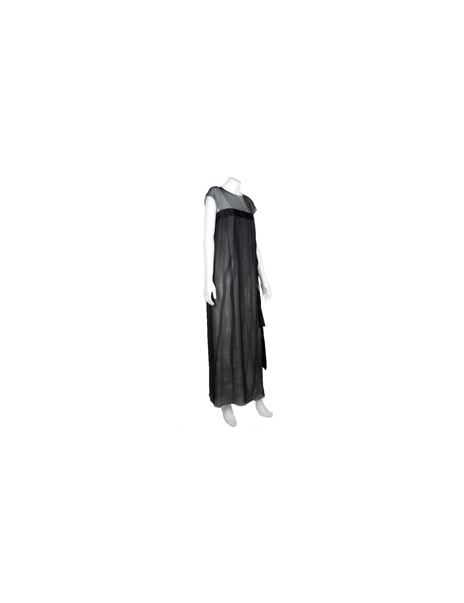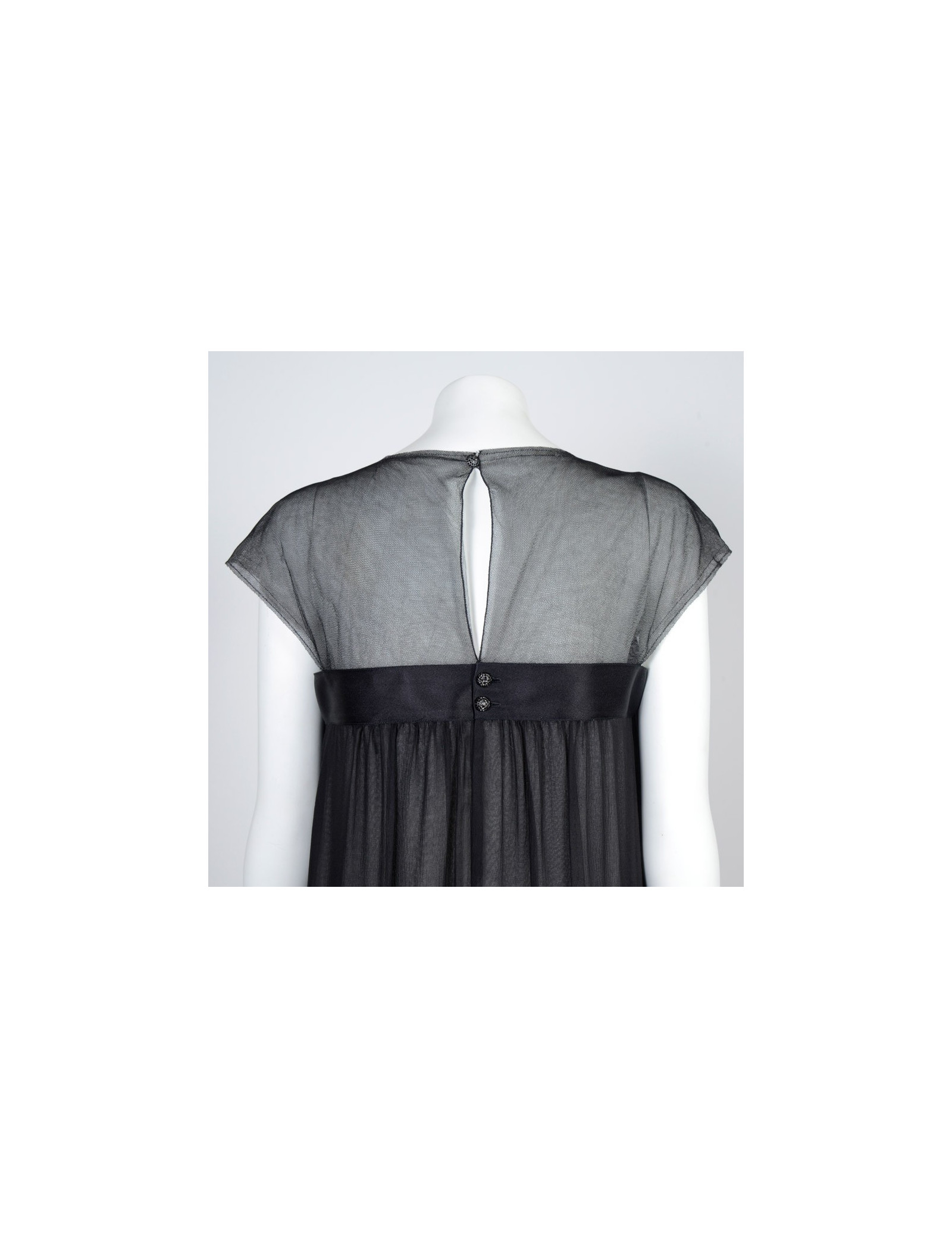Robe de coupe empire avec un ruban en soie noire qui marque sous la poitrine. Le buste est en dentelle noire. Fluide et légère, elle saura habillée vos soirées.