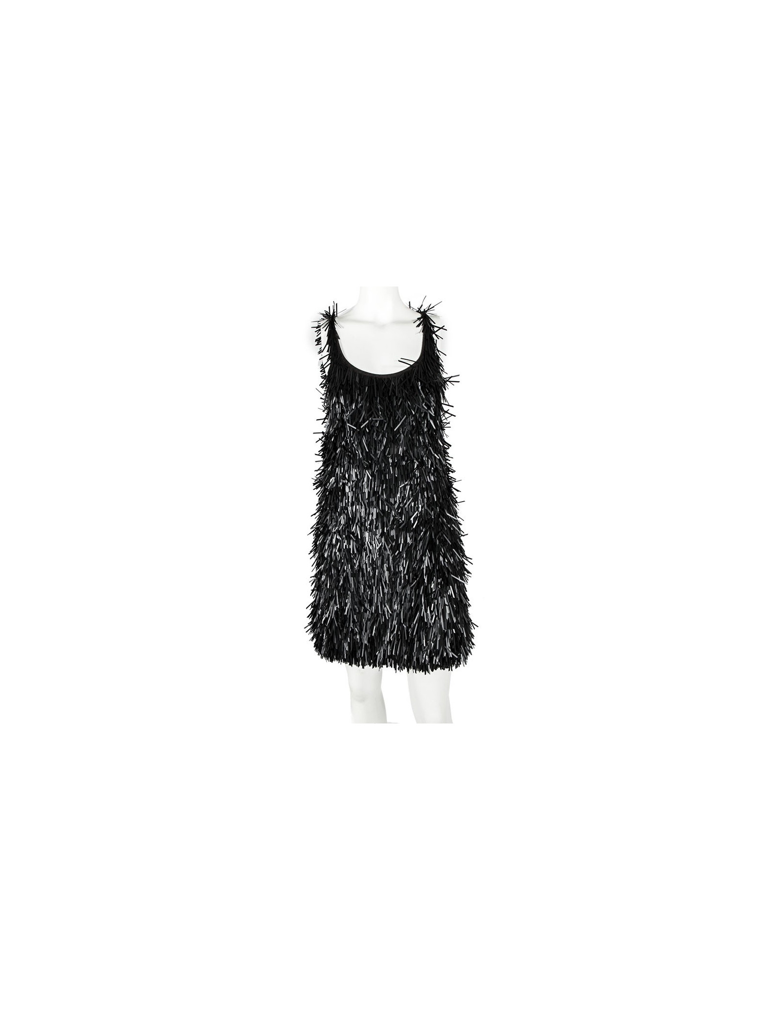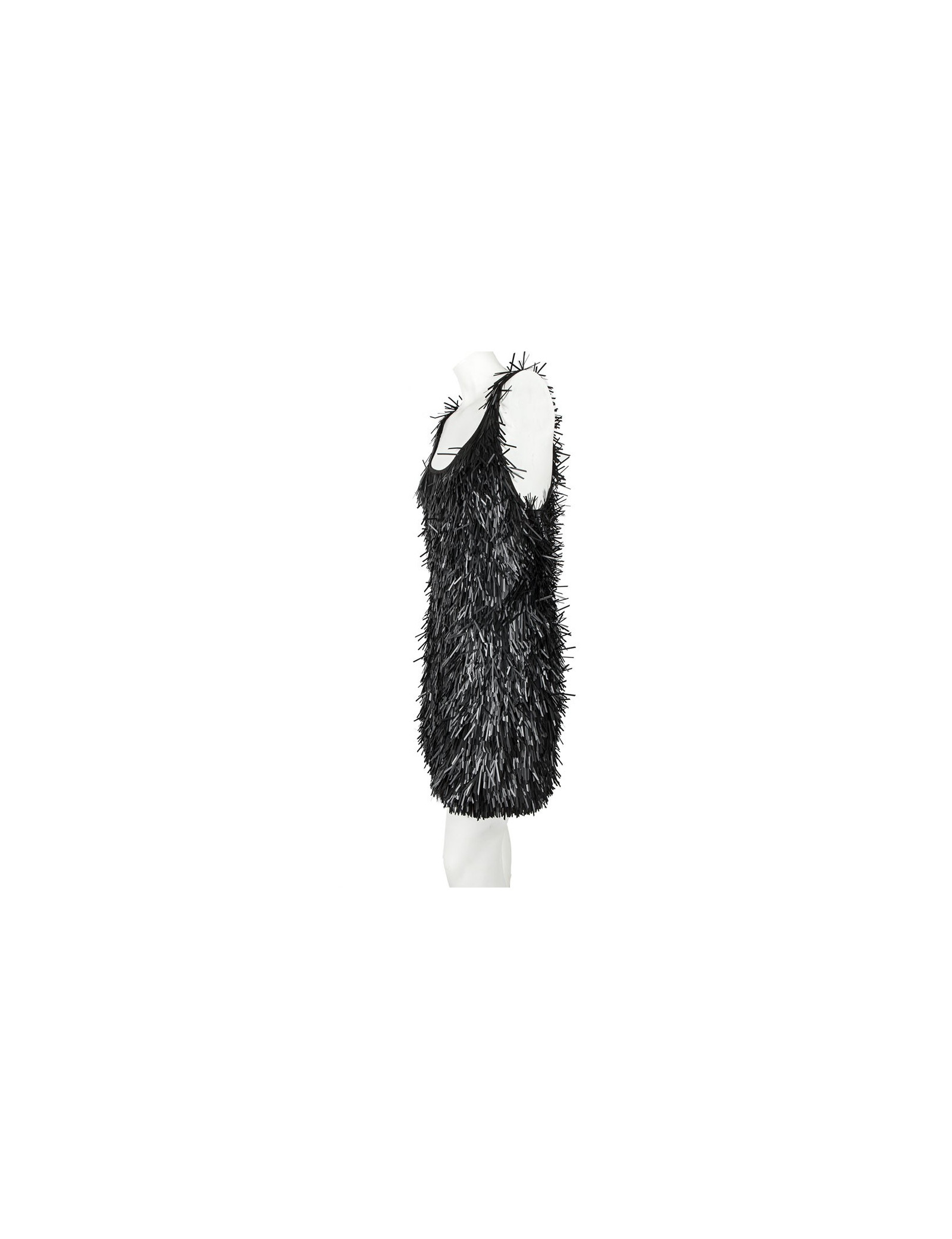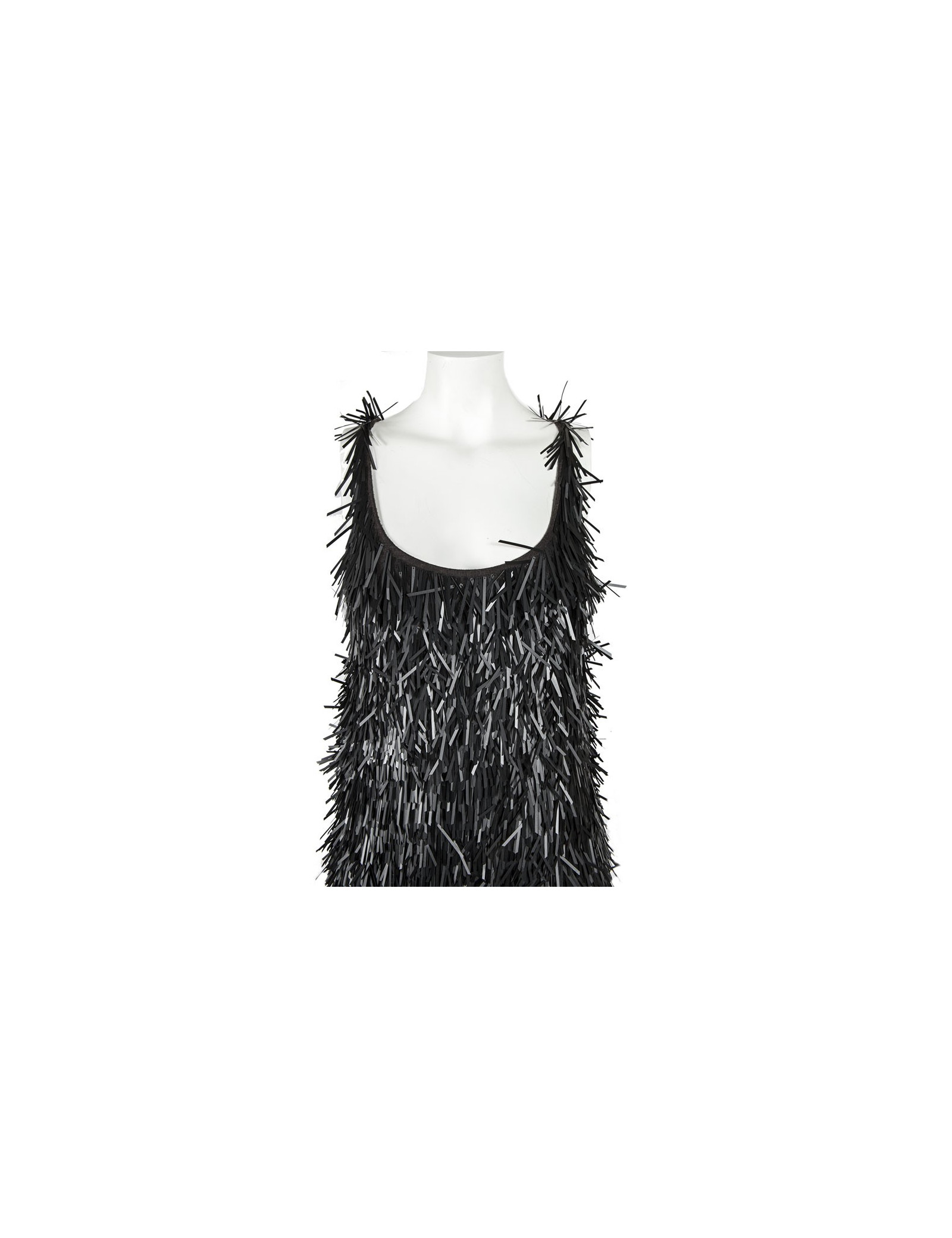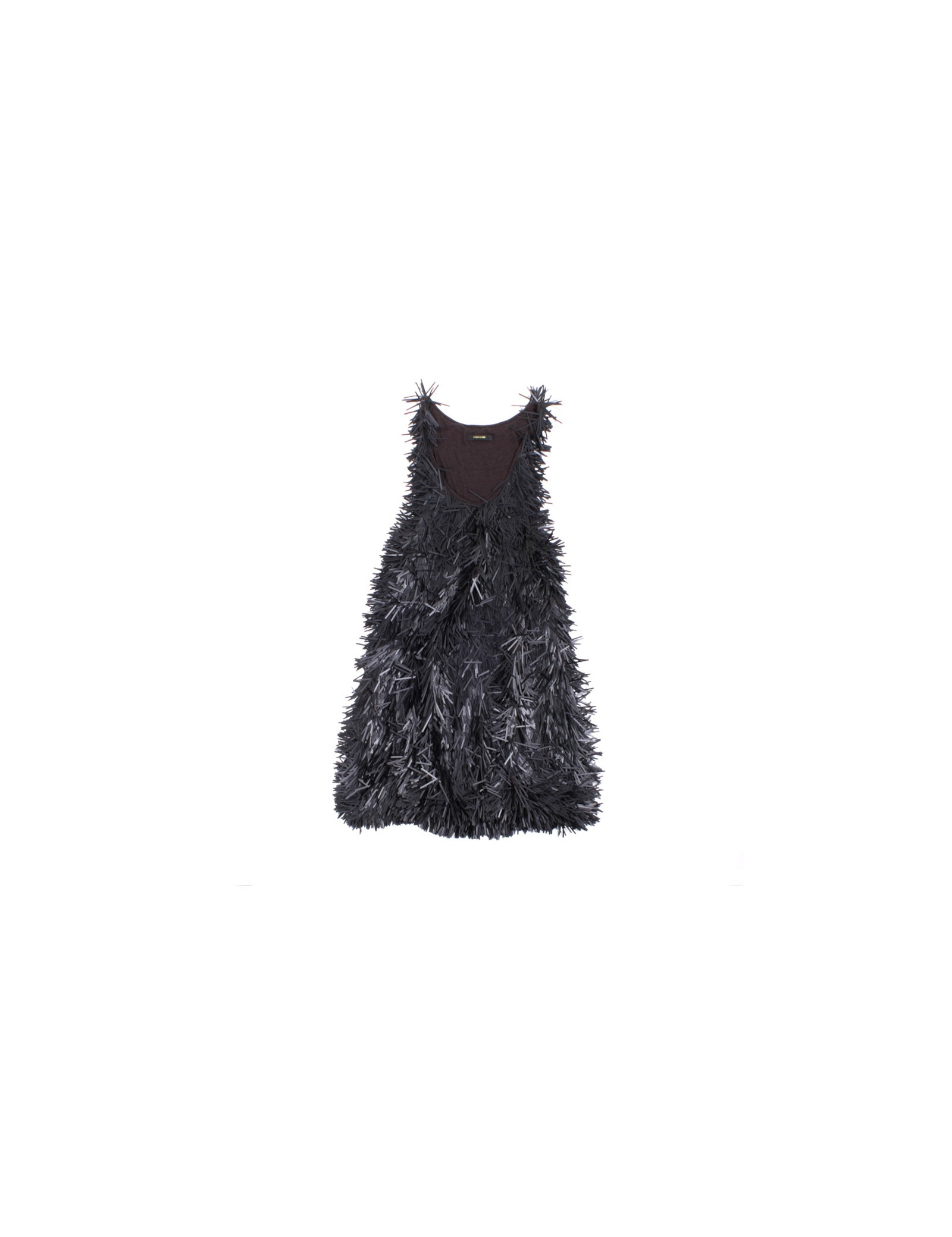 Robe débardeur, taille M de la Marque Osklen (marque brésilienne très tendance), interieur en jersey gris foncé sur lequel est cousu des éléments de plastiques noir. Equivaut à un 38-40. Elle est resserrée dans le bas par un élastique. Superbe robe très originale. Fabriquée au Brésil.