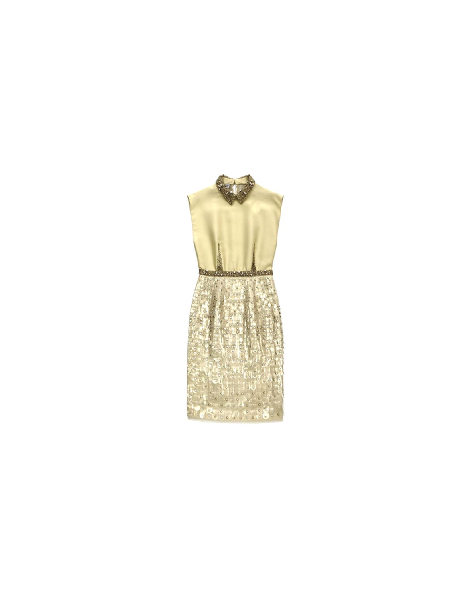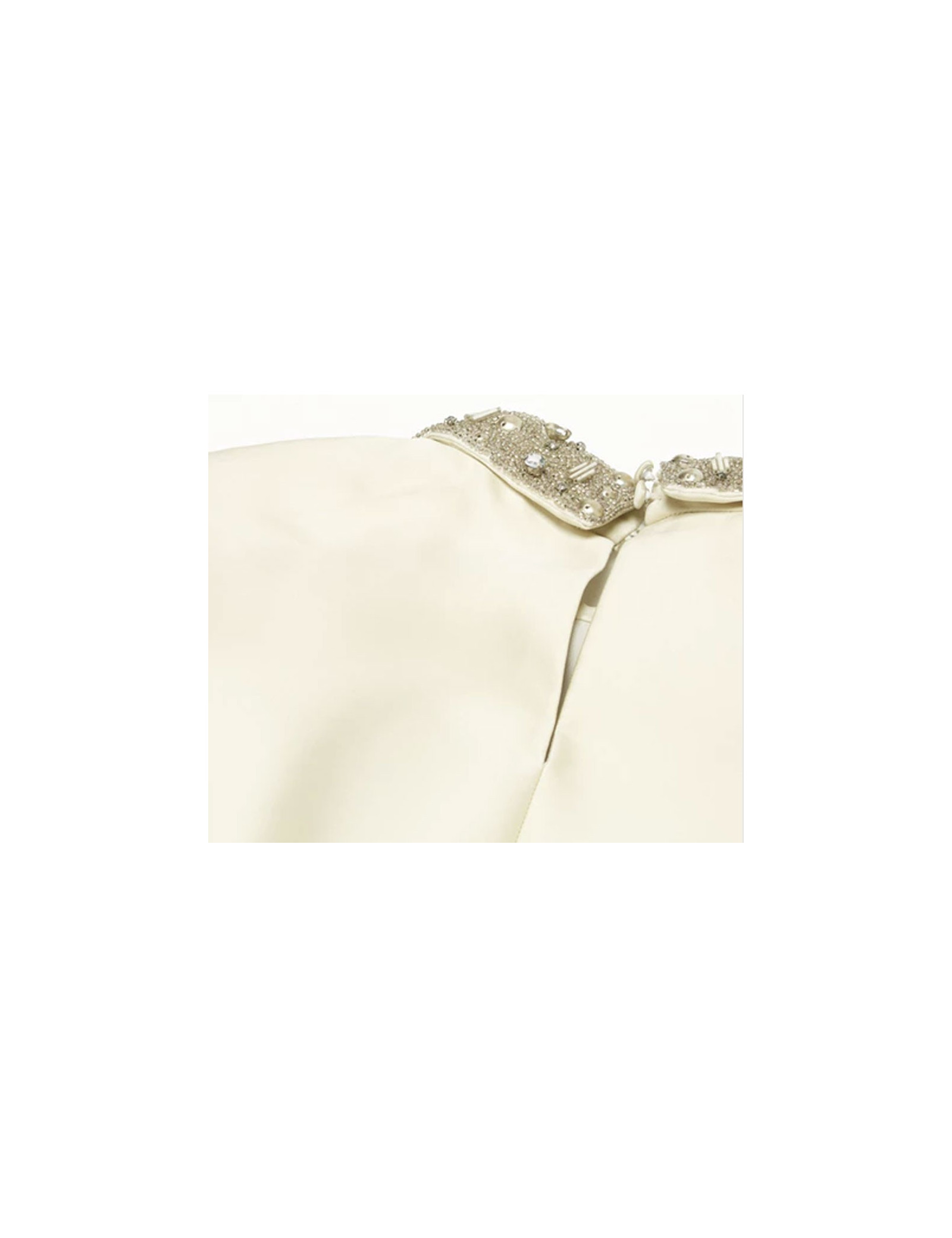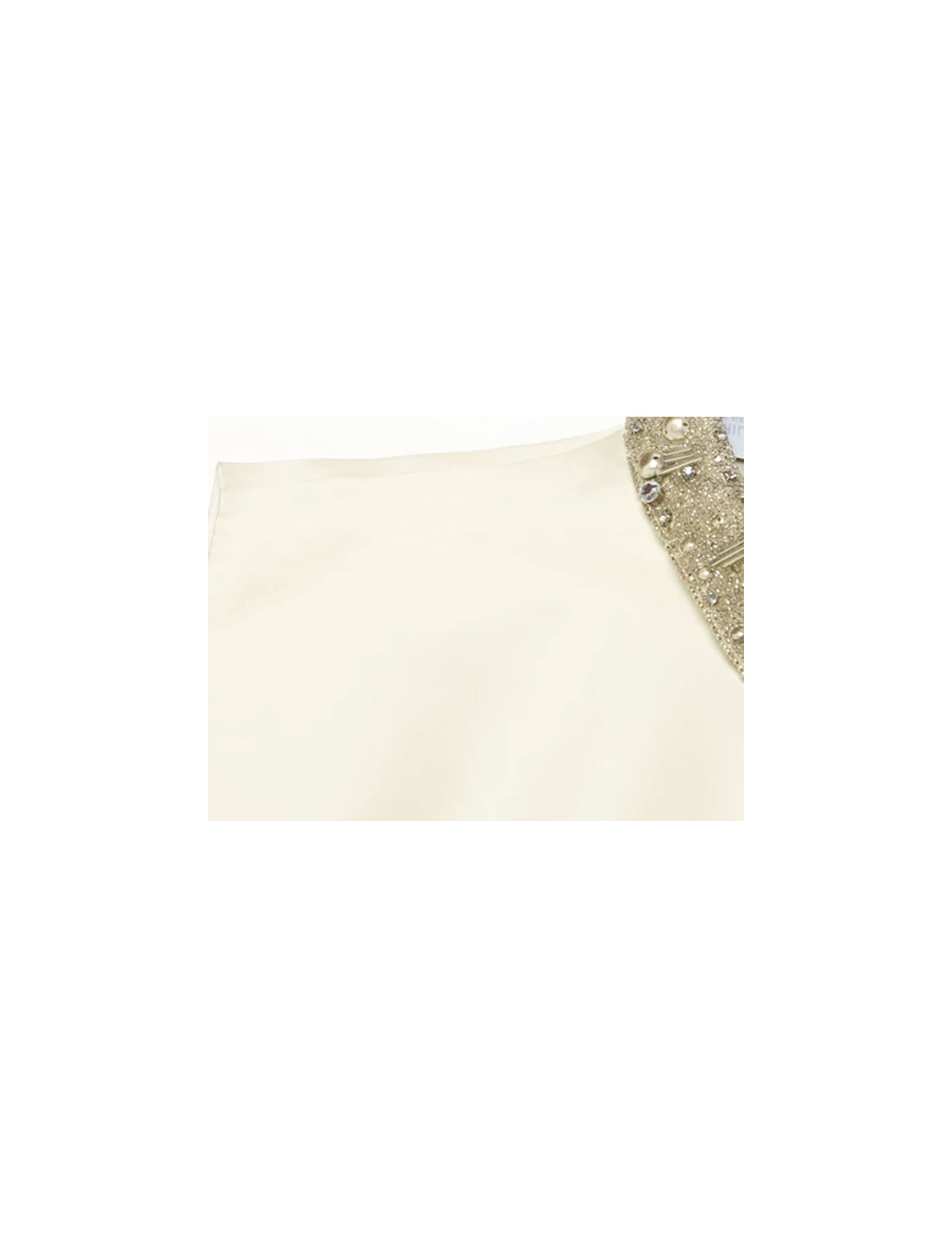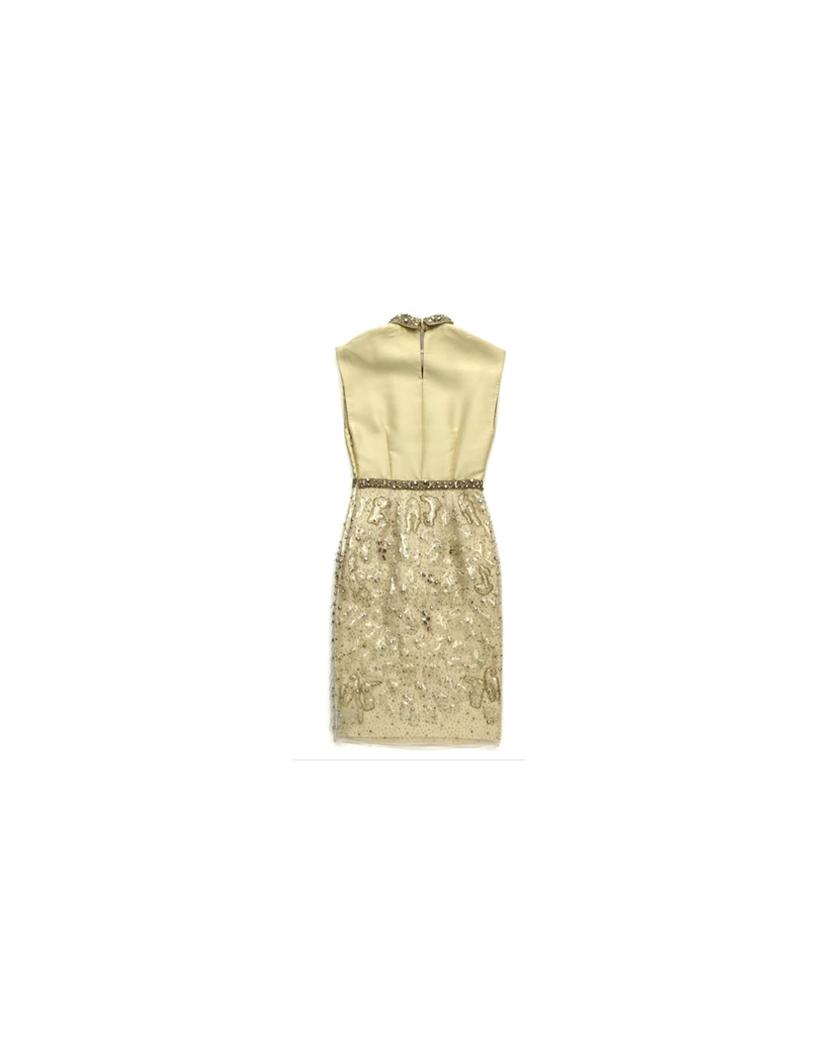 Robe de cocktail ou de soirée T40IT (correspond à un 36FR) Philosophy par Alberta Ferretti sans manche en satin ivoire. Le col et la taille sont brodés de strass et de perles en métal et argentés. La jupe est recouverte d'écailles en plastique transparent, clous et strass. La robe se ferme par un zip latérale invisible.