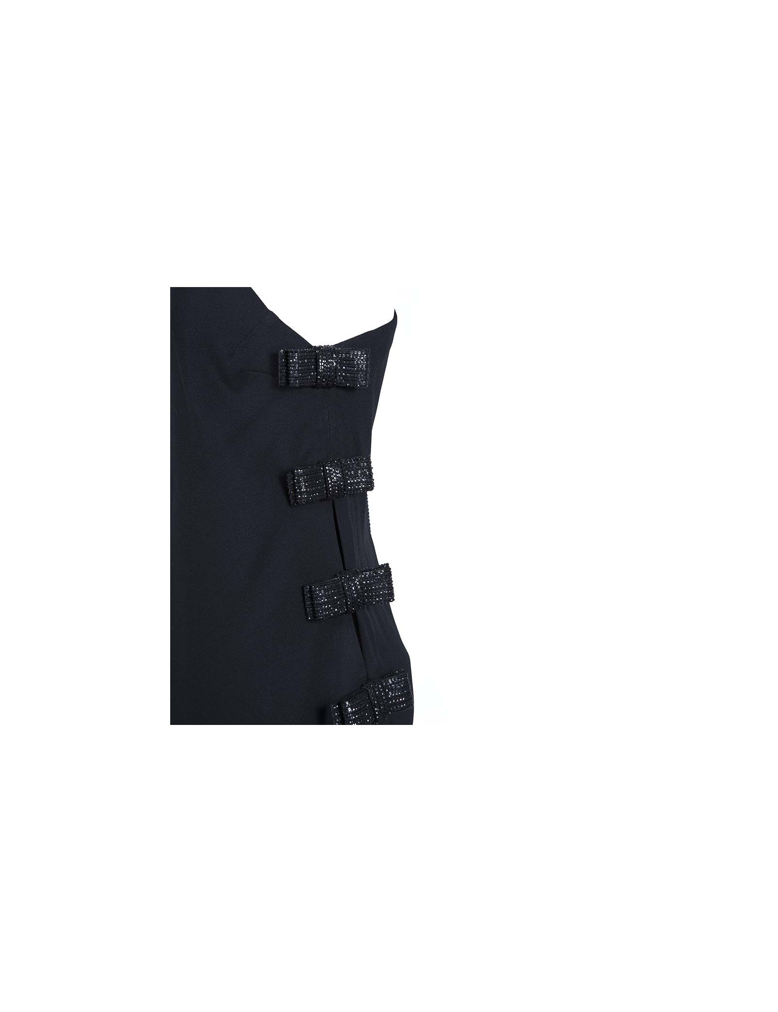 Il y sur un côté des noeuds en sequins avec une grande fente, et sur l'autre côté une longue fermeture éclair.