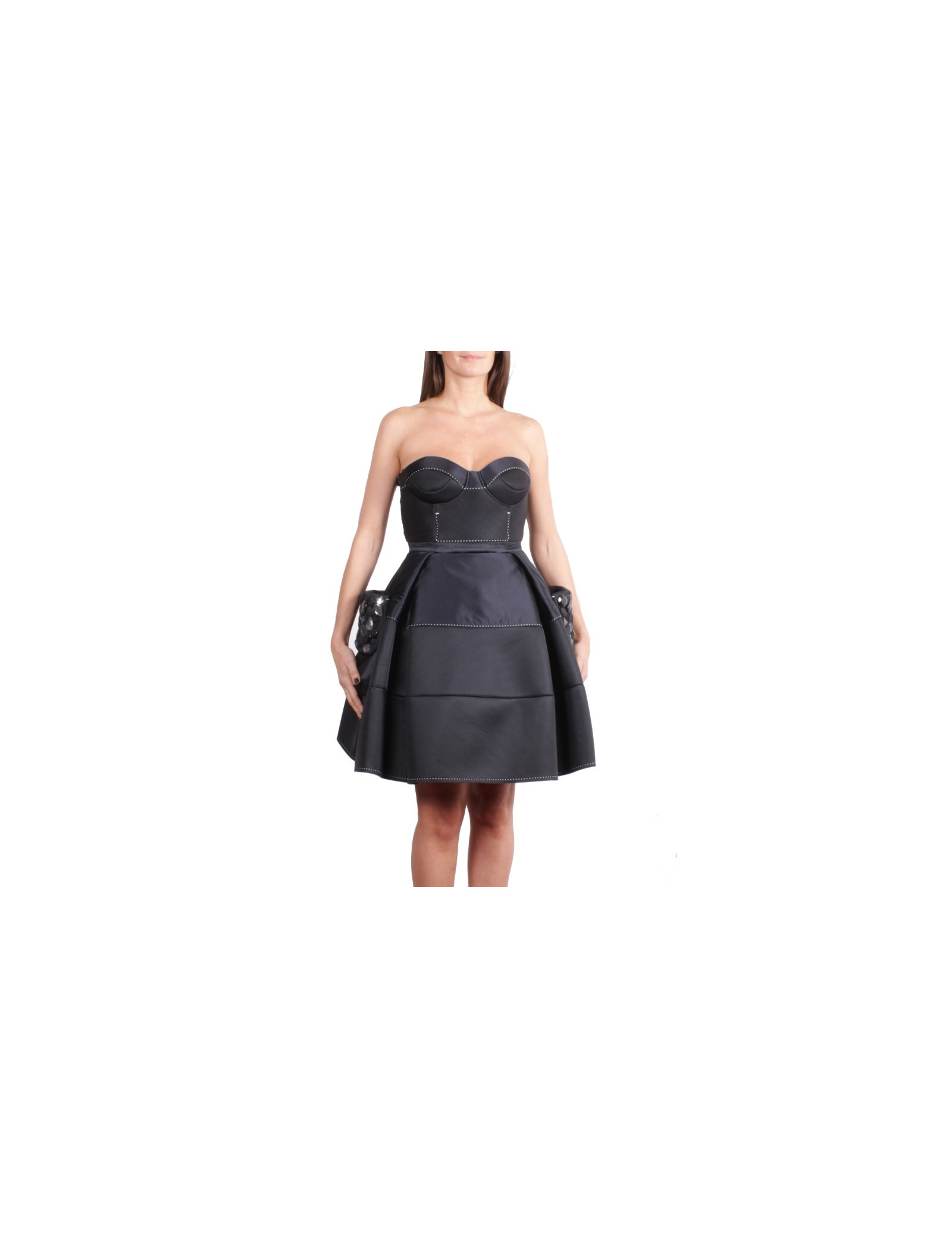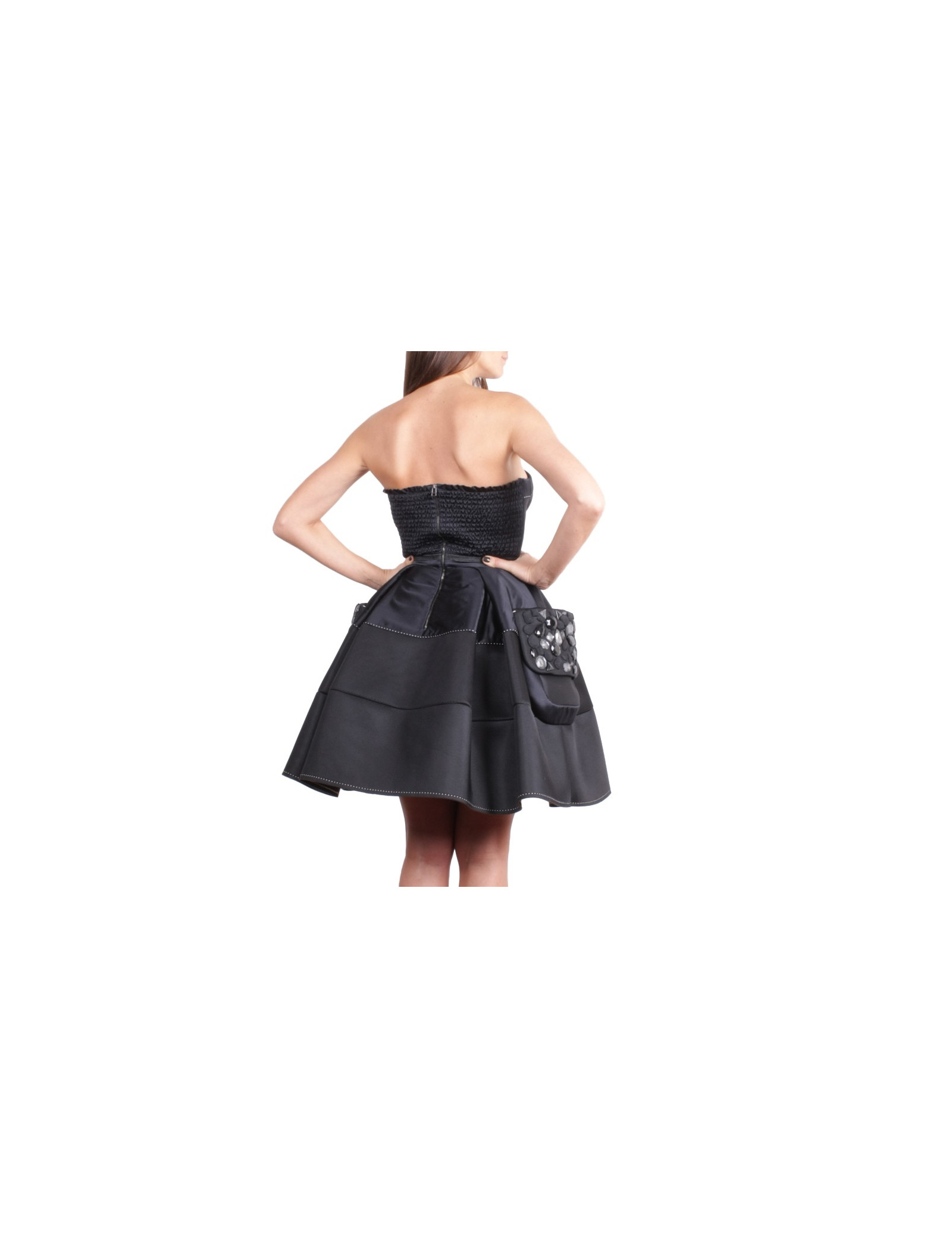 C'est une robe bustier surpiquée de blanc, jupe corole avec de grandes poches plaquées sur les côtés incrustées de pierres.