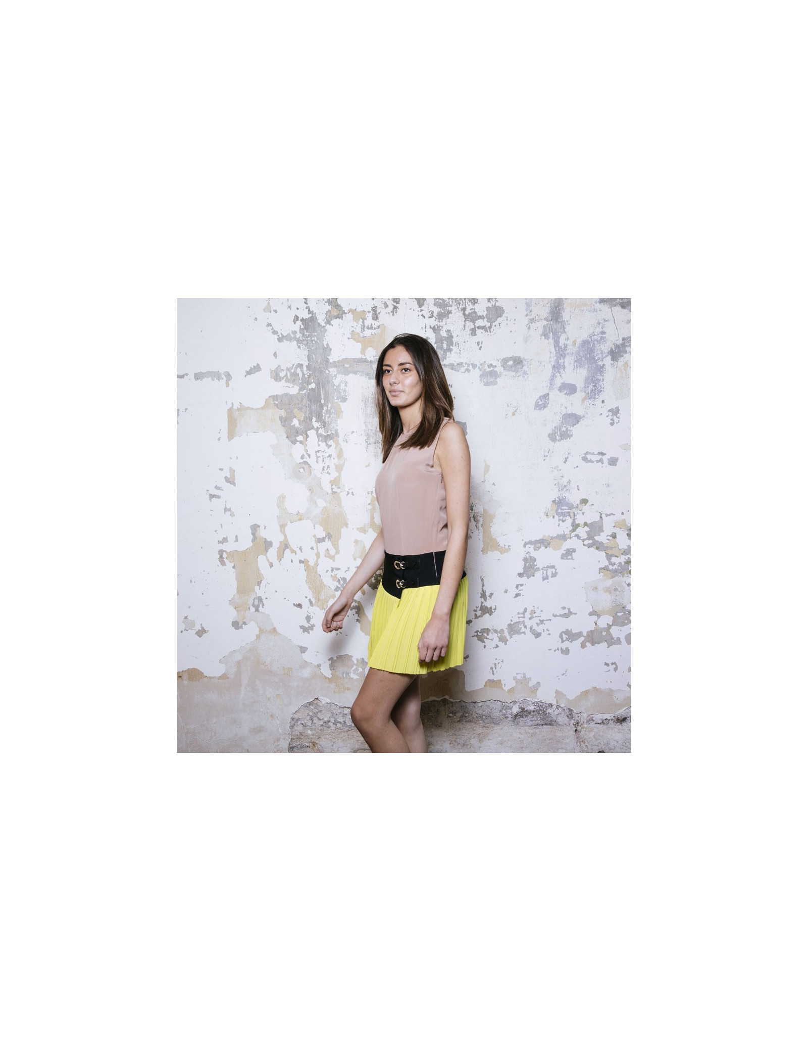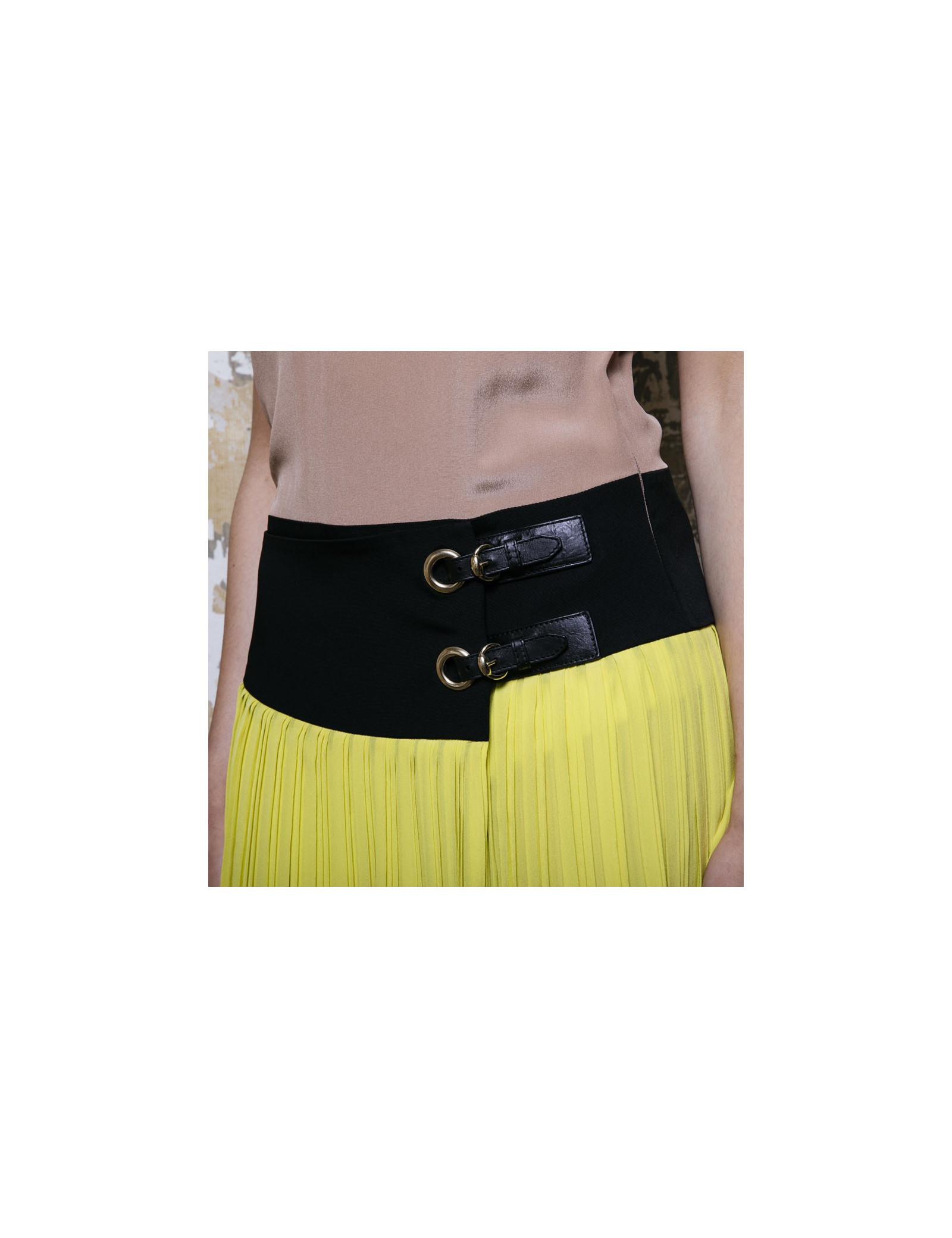Robe Gucci en soie camel, noire et jaune. Taille 40 it / 36 FR. Robe 3 trous façon ensemble jupe kilt et top. Deux boucles en cuir noir et métal doré sur les hanches. Fente sur le haut du dos avec bouton. Fermeture à glissière sur le côté gauche. Made in Italy. Très bon état. Micro trace grise sur la soie camel.