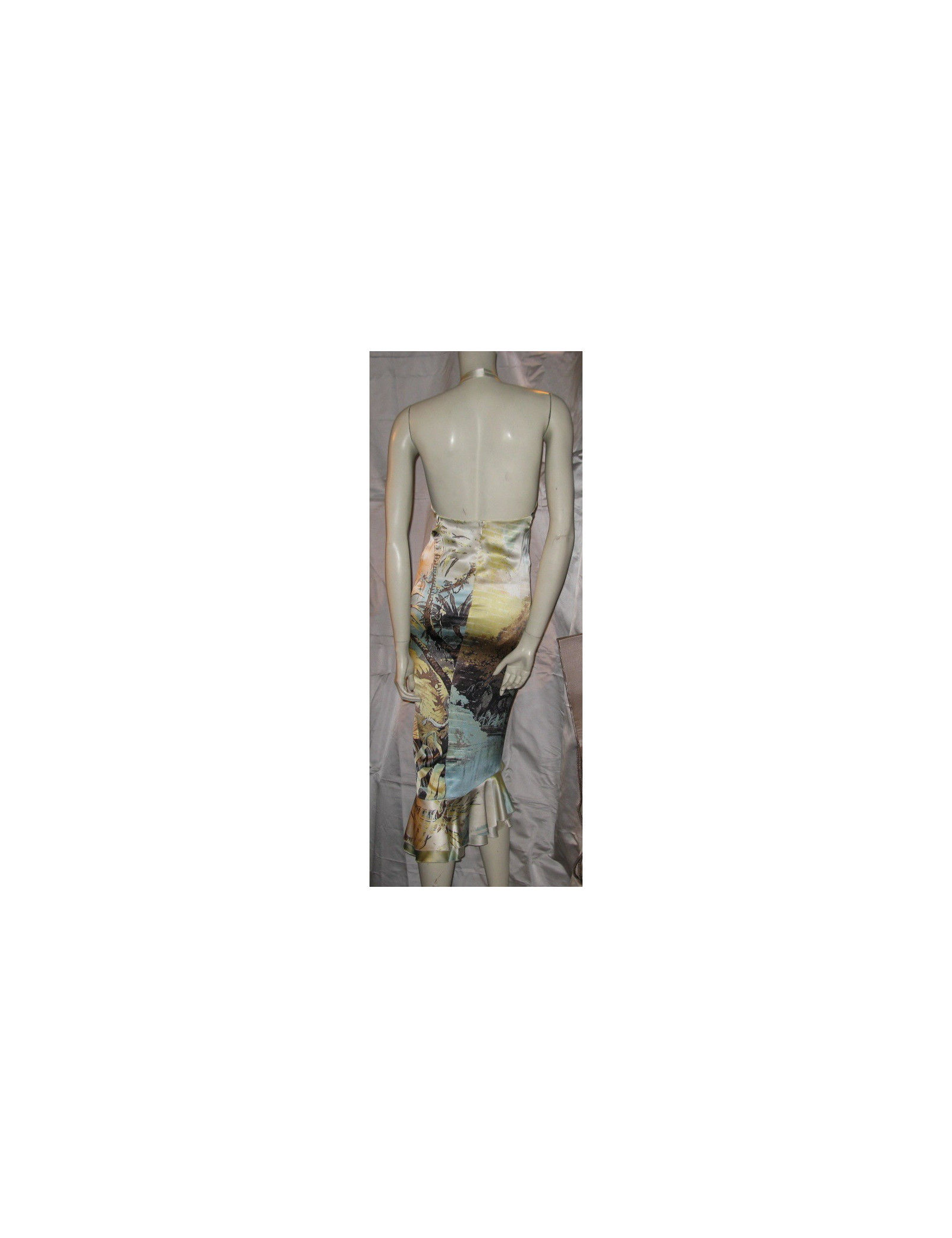 Superbe robe ROBERTO CAVALLI taille XS en soie imprimée. Le motif représente un fauve dans la savane. La robe se ferme à l'aide d'une fermeture zippée dans le dos.