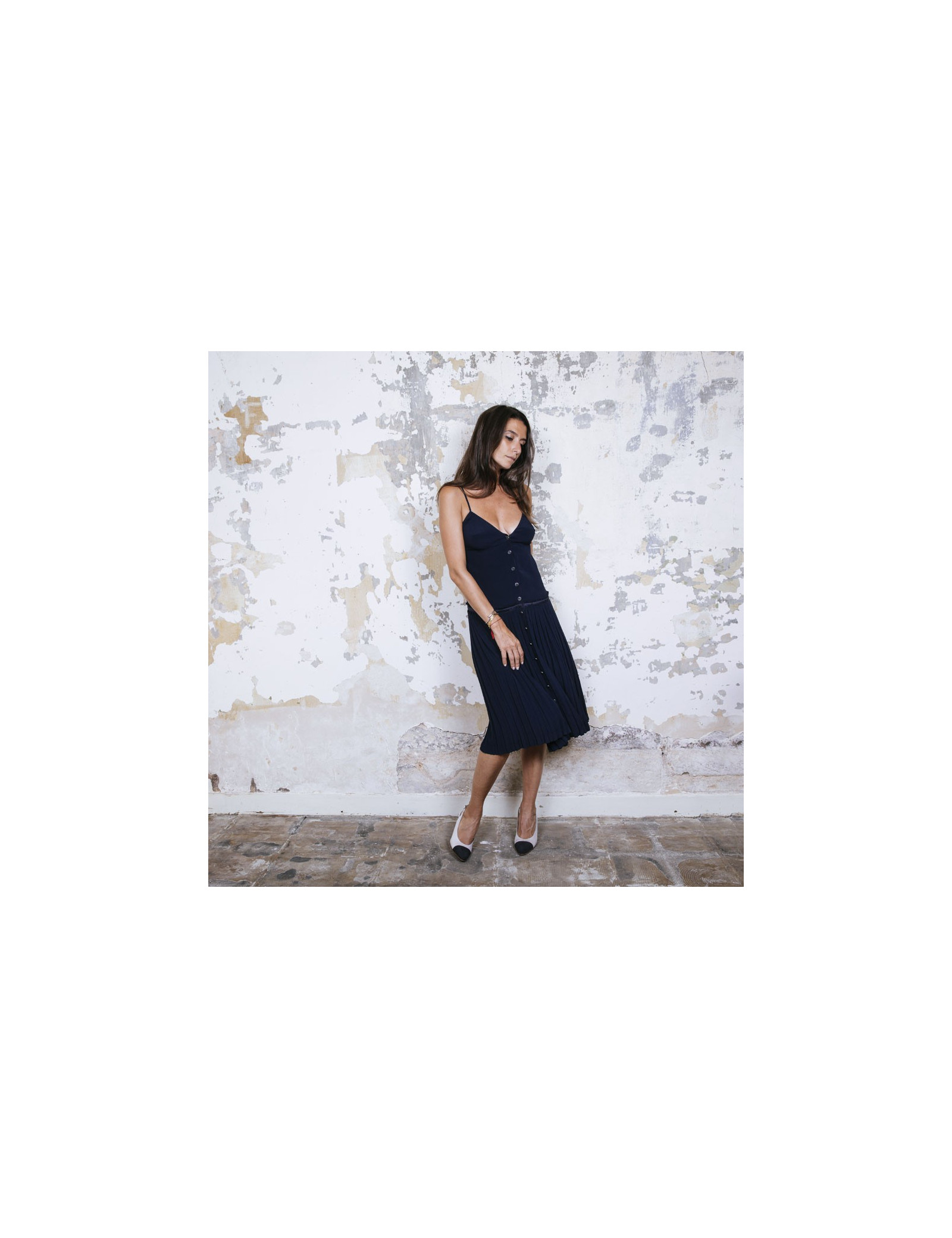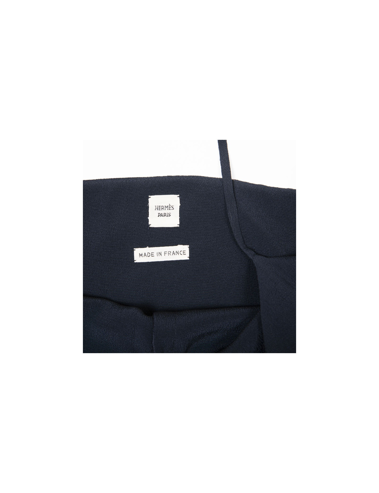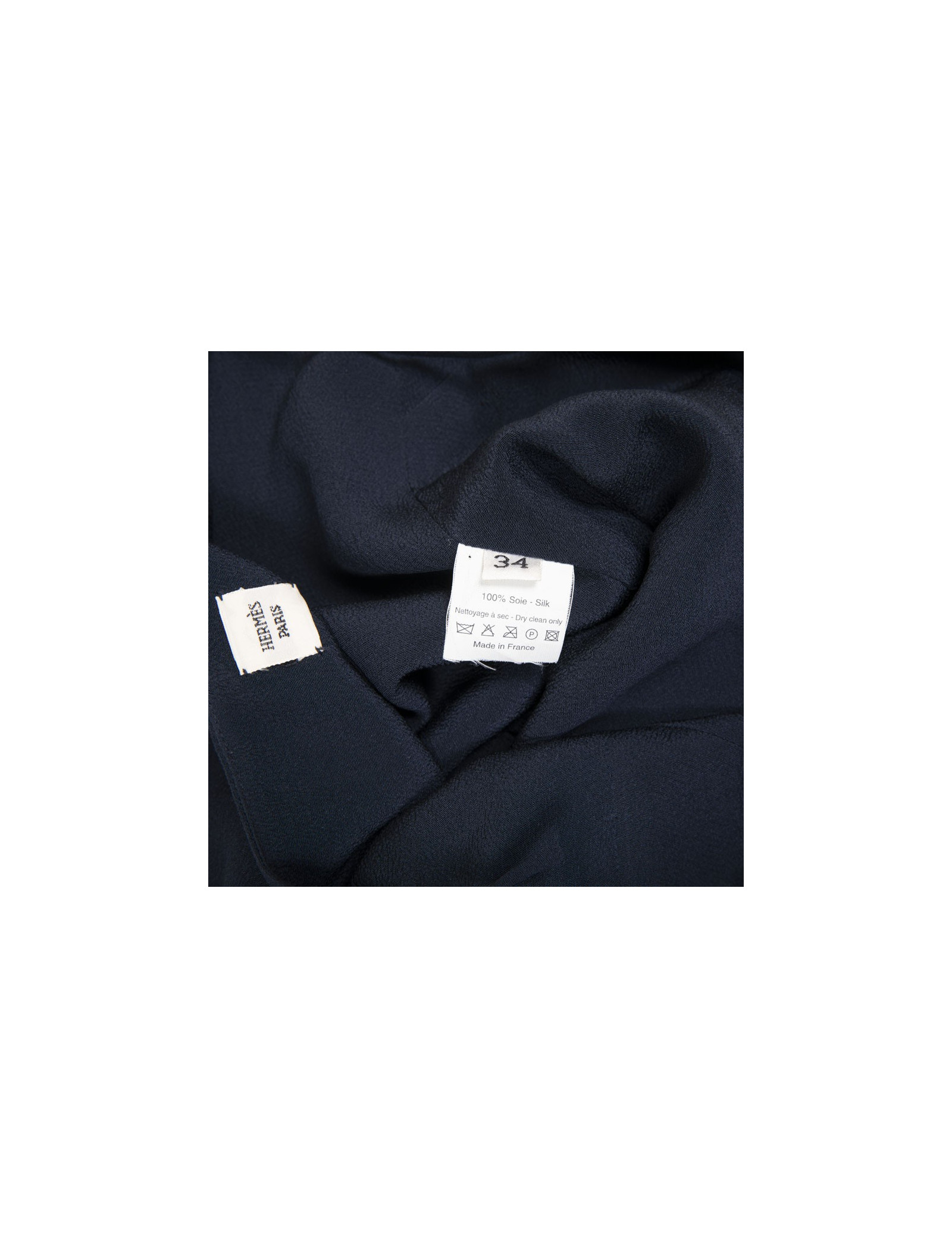 Robe Hermès en soie bleue marine à fines bretelles et boutonnée sur l'avant. Taille 34.